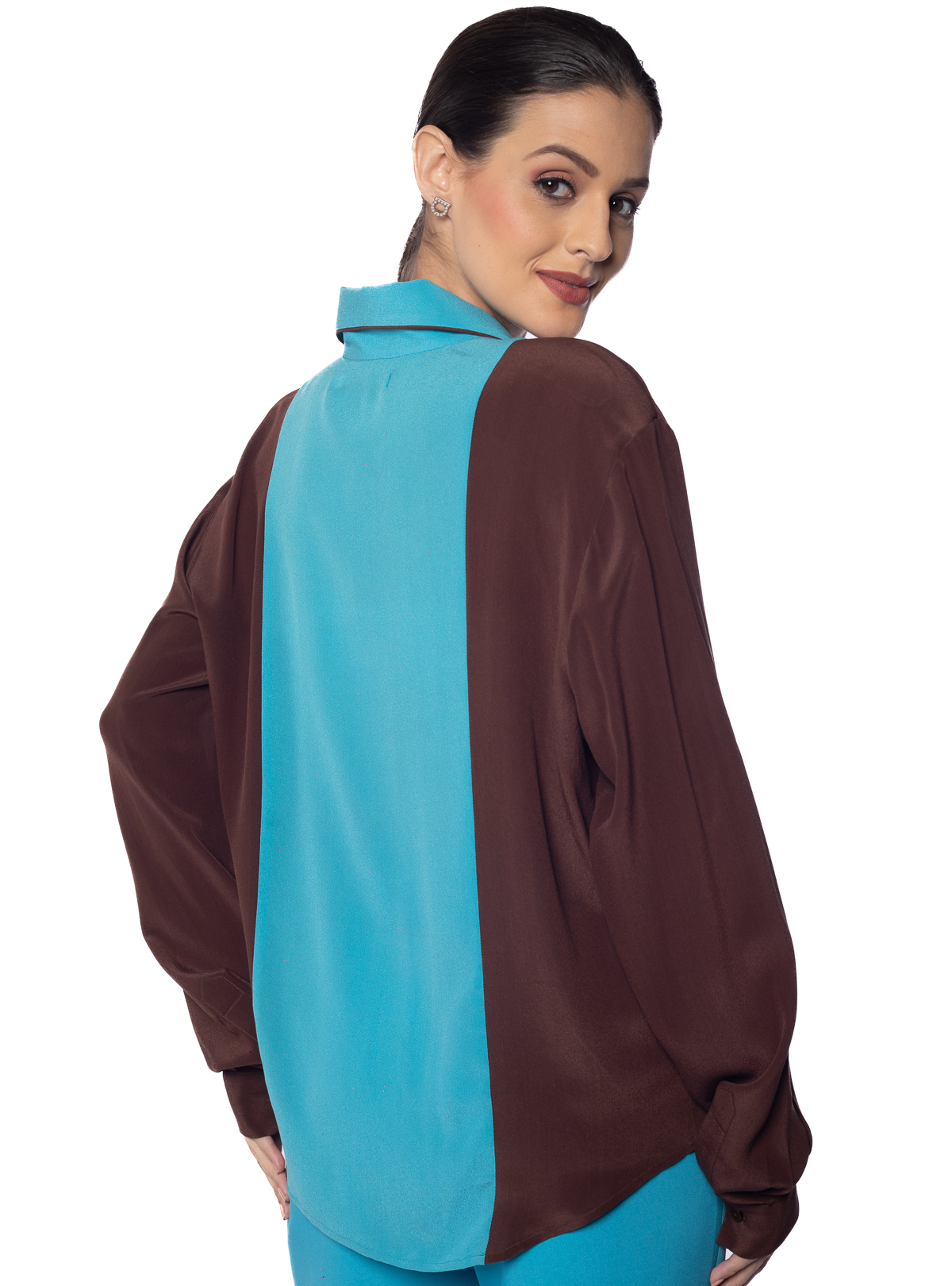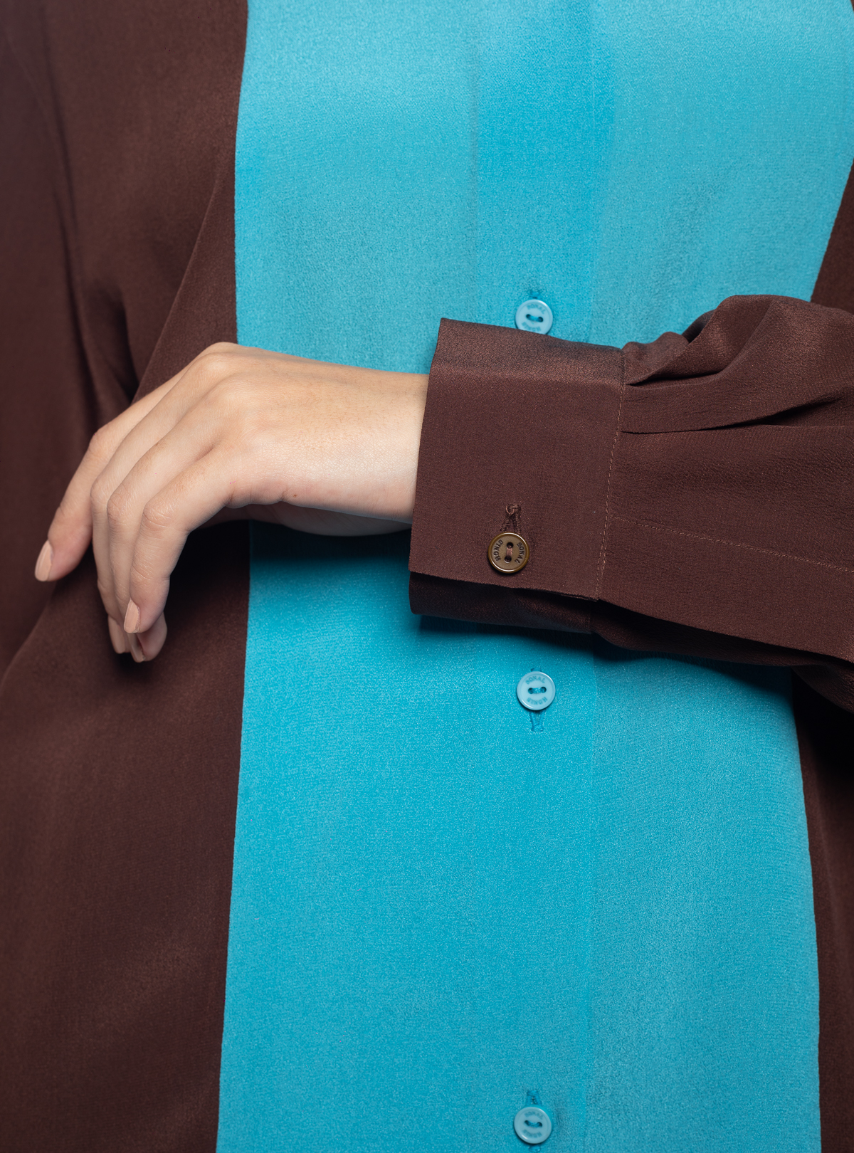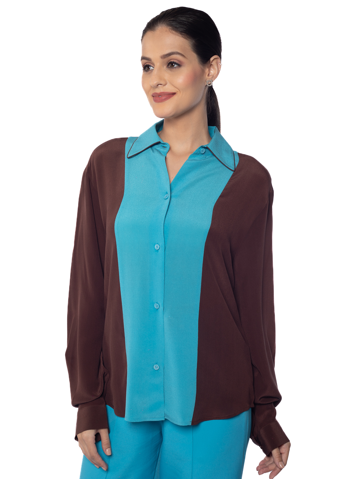 Redefine your smart-casual style with this eye-catching color-block shirt, where sharp tailoring meets effortless ease. Featuring a striking combination of rich chocolate brown and vibrant aqua blue, this shirt makes a bold statement while maintaining an air of sophistication. Crafted from a lightweight, silk fabric, it boasts a relaxed silhouette with long, subtle, simple sleeves and a sharp, pointed collar with contrast piping.