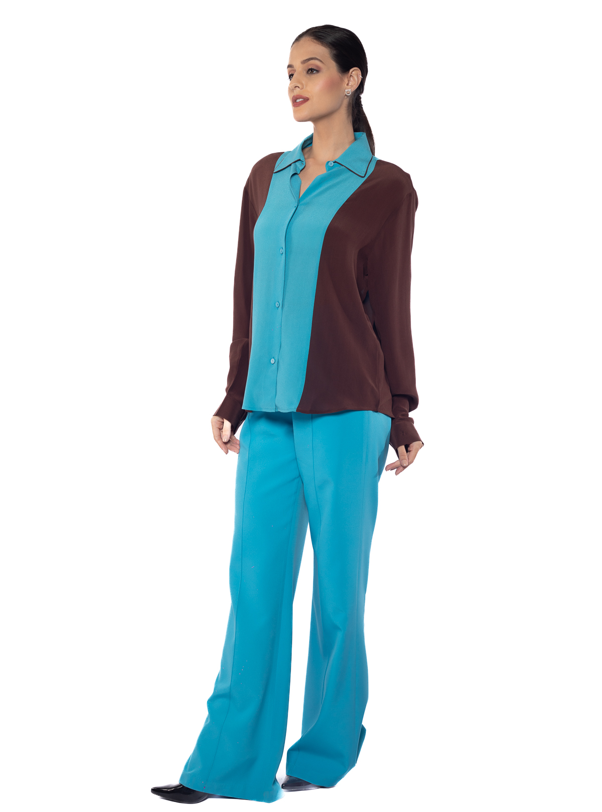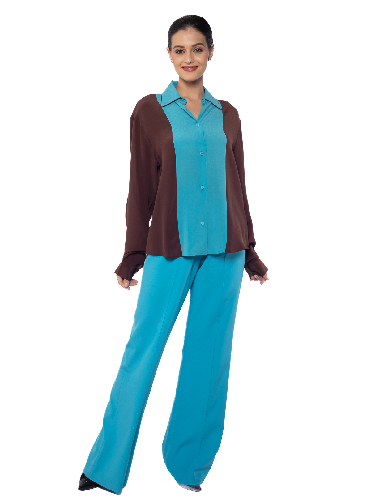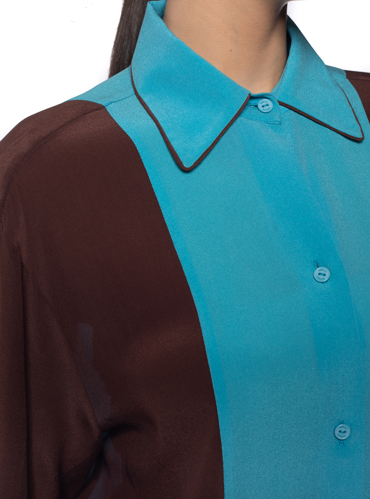 Redefine your smart-casual style with this eye-catching color-block shirt, where sharp tailoring meets effortless ease. Featuring a striking combination of rich chocolate brown and vibrant aqua blue, this shirt makes a bold statement while maintaining an air of sophistication. Crafted from a lightweight, silk fabric, it boasts a relaxed silhouette with long, subtle, simple sleeves and a sharp, pointed collar with contrast piping.