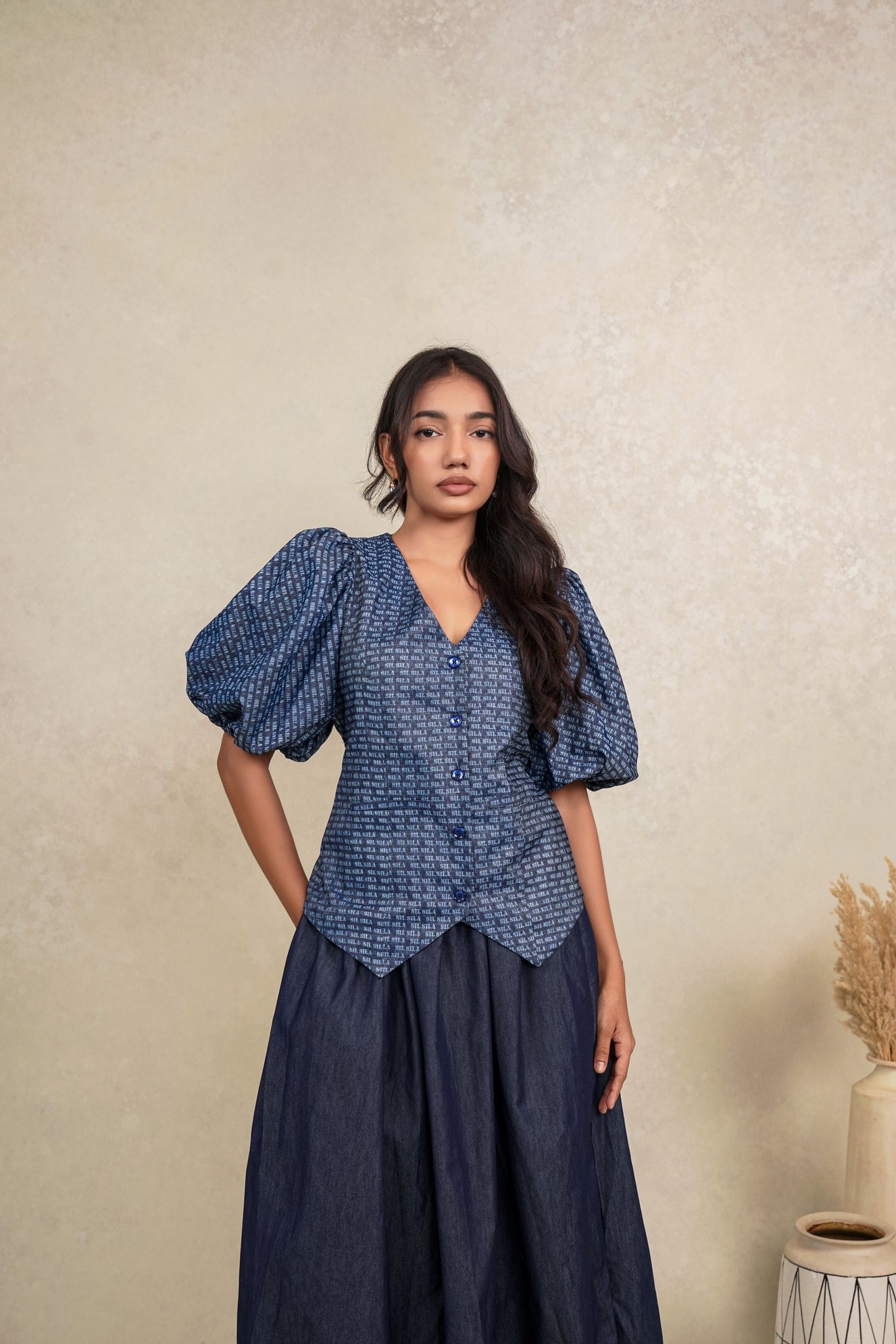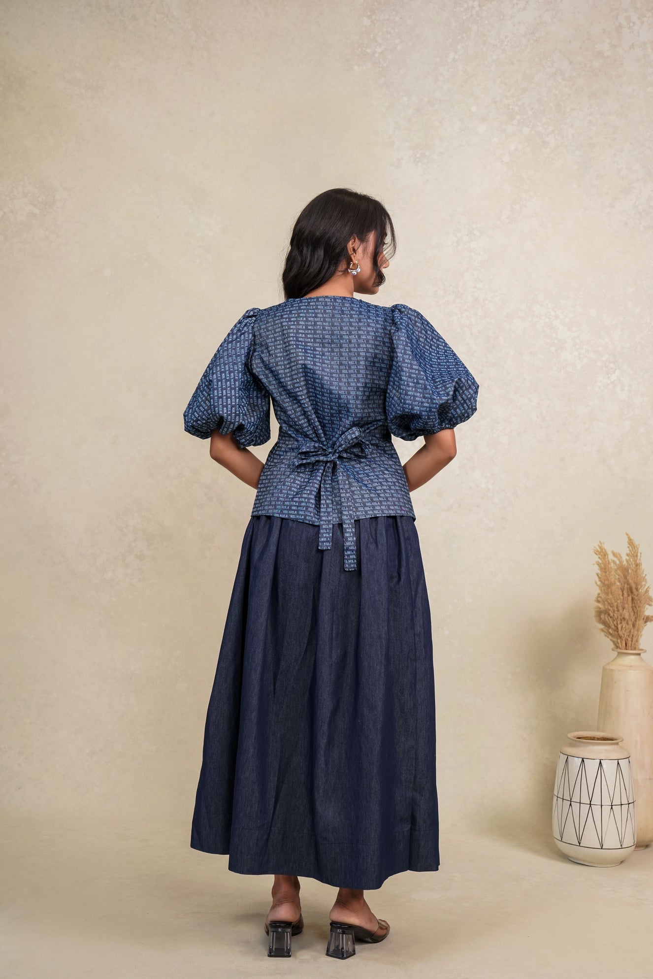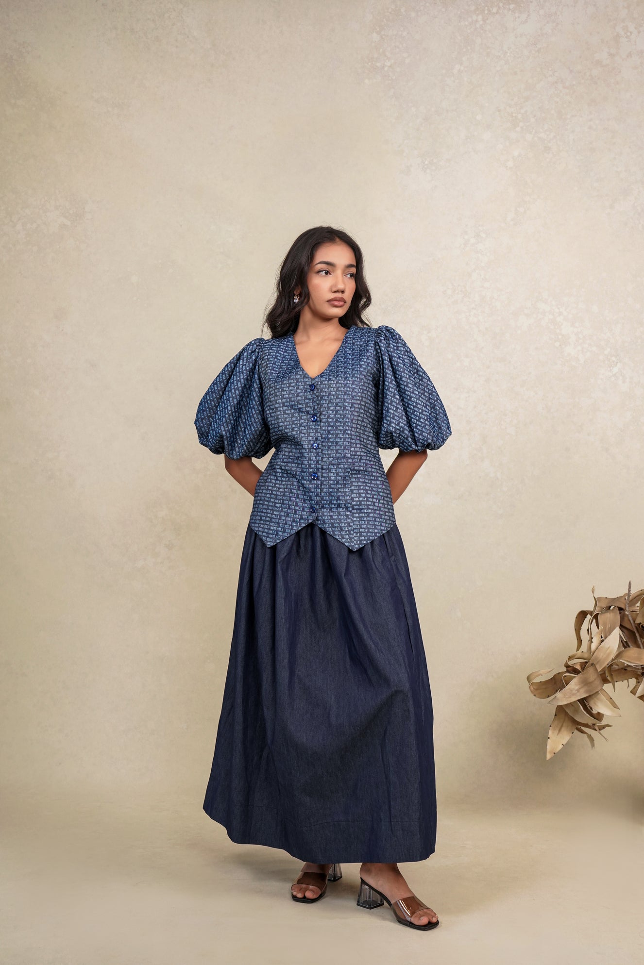 The Capri Set is a structured cotton denim co-ord featuring a V-neck vest with soft puff sleeves and dart detailing for a flattering fit. It’s paired with a flared maxi skirt designed for ease and movement. Crafted in breathable, mid-weight cotton denim, this co-ord balances comfort with clean tailoring. The silhouette is both bold and feminine, offering versatility and style in equal measure. A must-have cotton denim set for women who appreciate sharp construction and standout design.