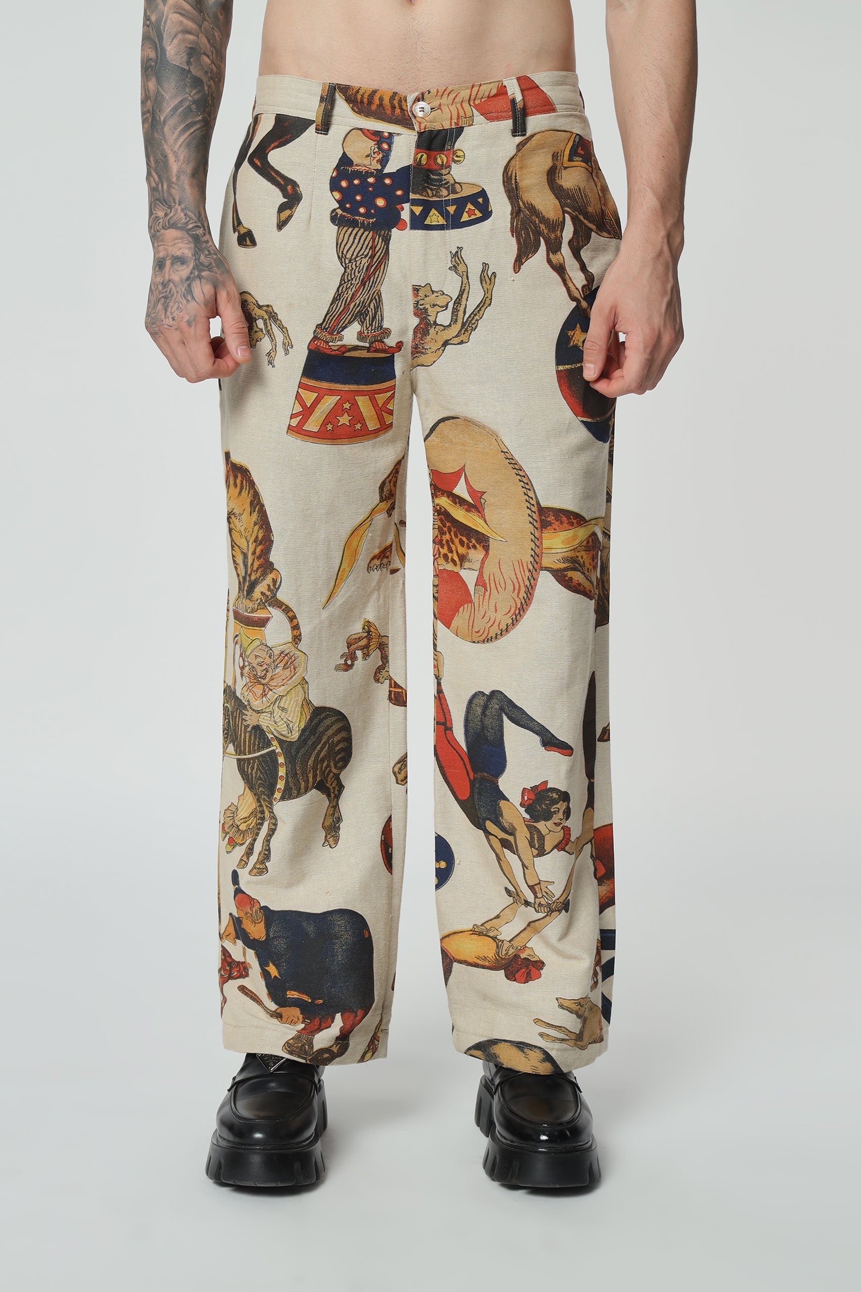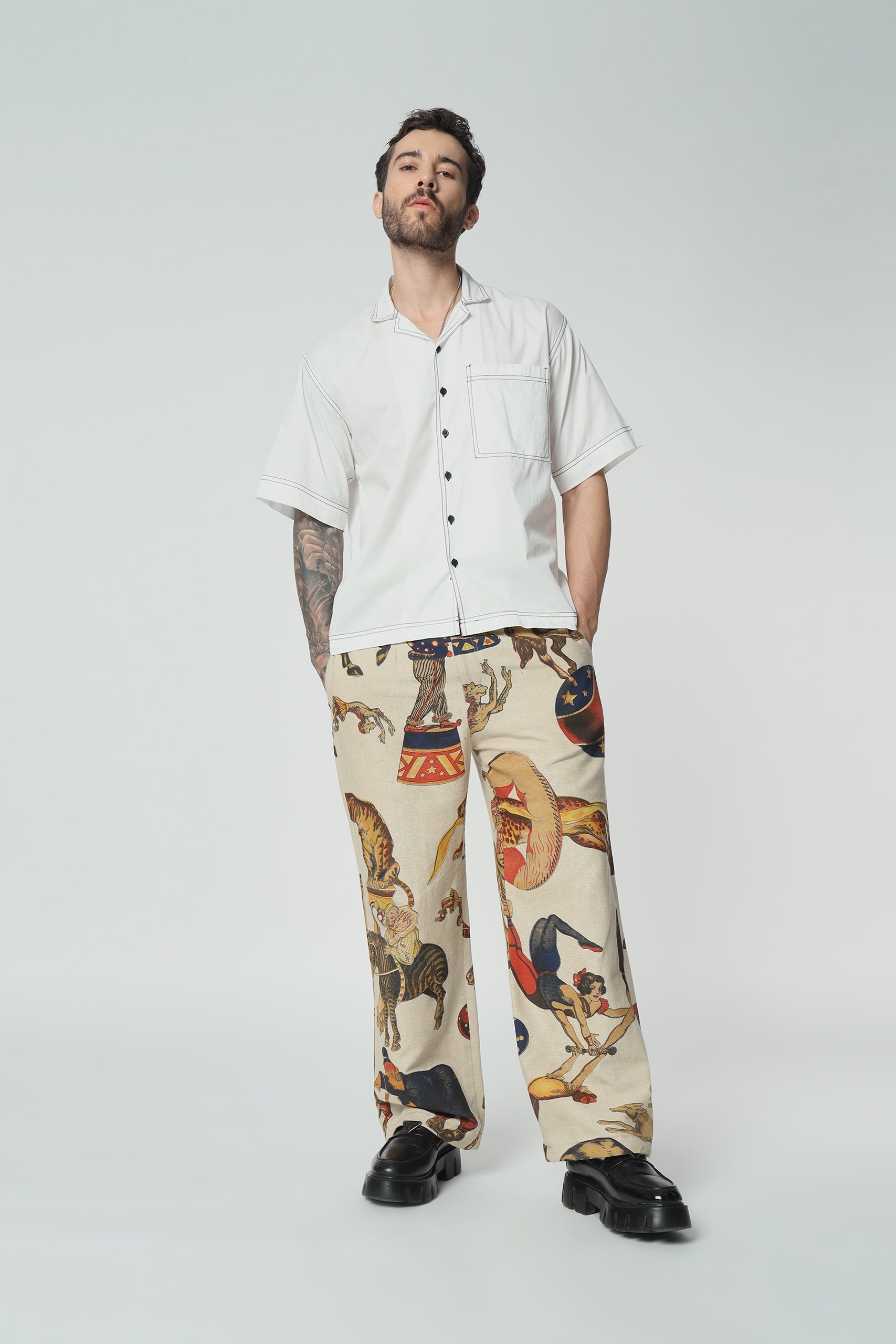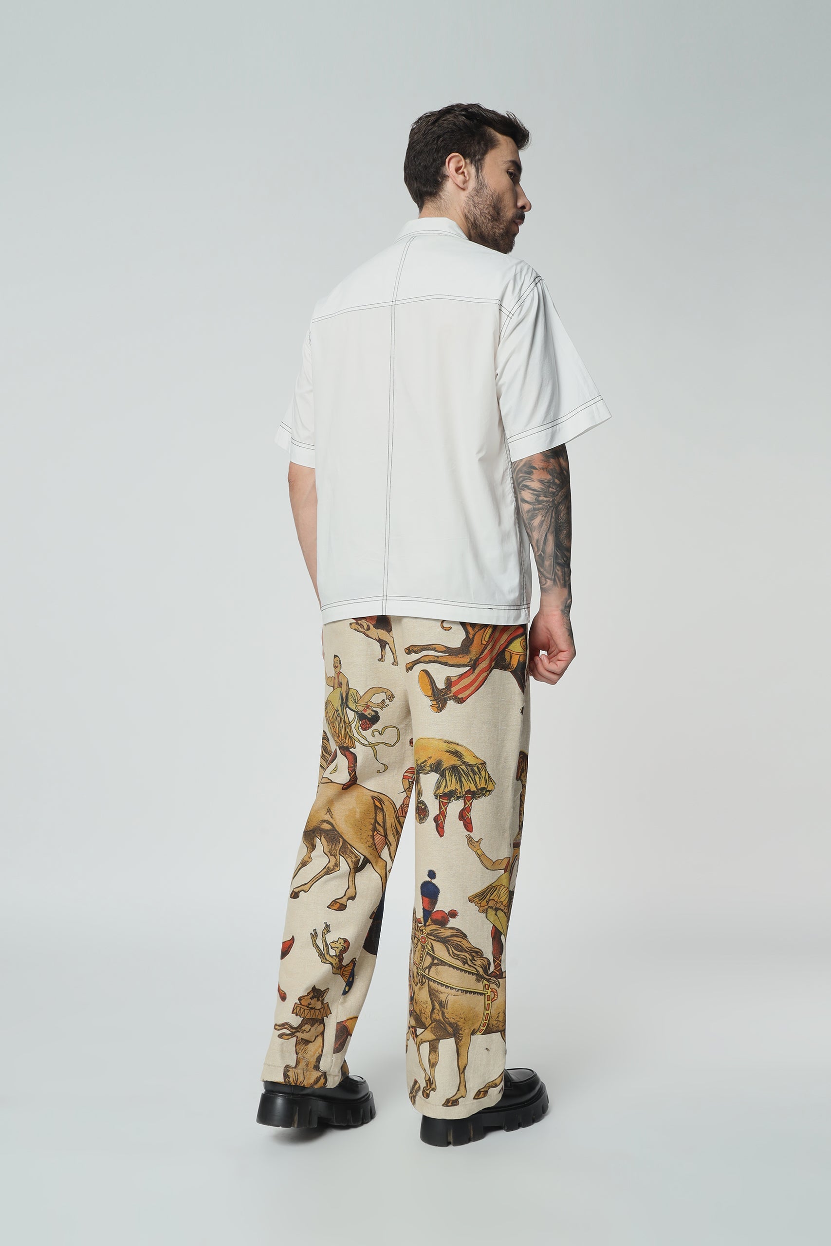 Cotton khadi pants inspired by circus, featuring a relaxed fit and finished with a shell button closure, offer a perfect balance of comfort, style & artisanal charm.