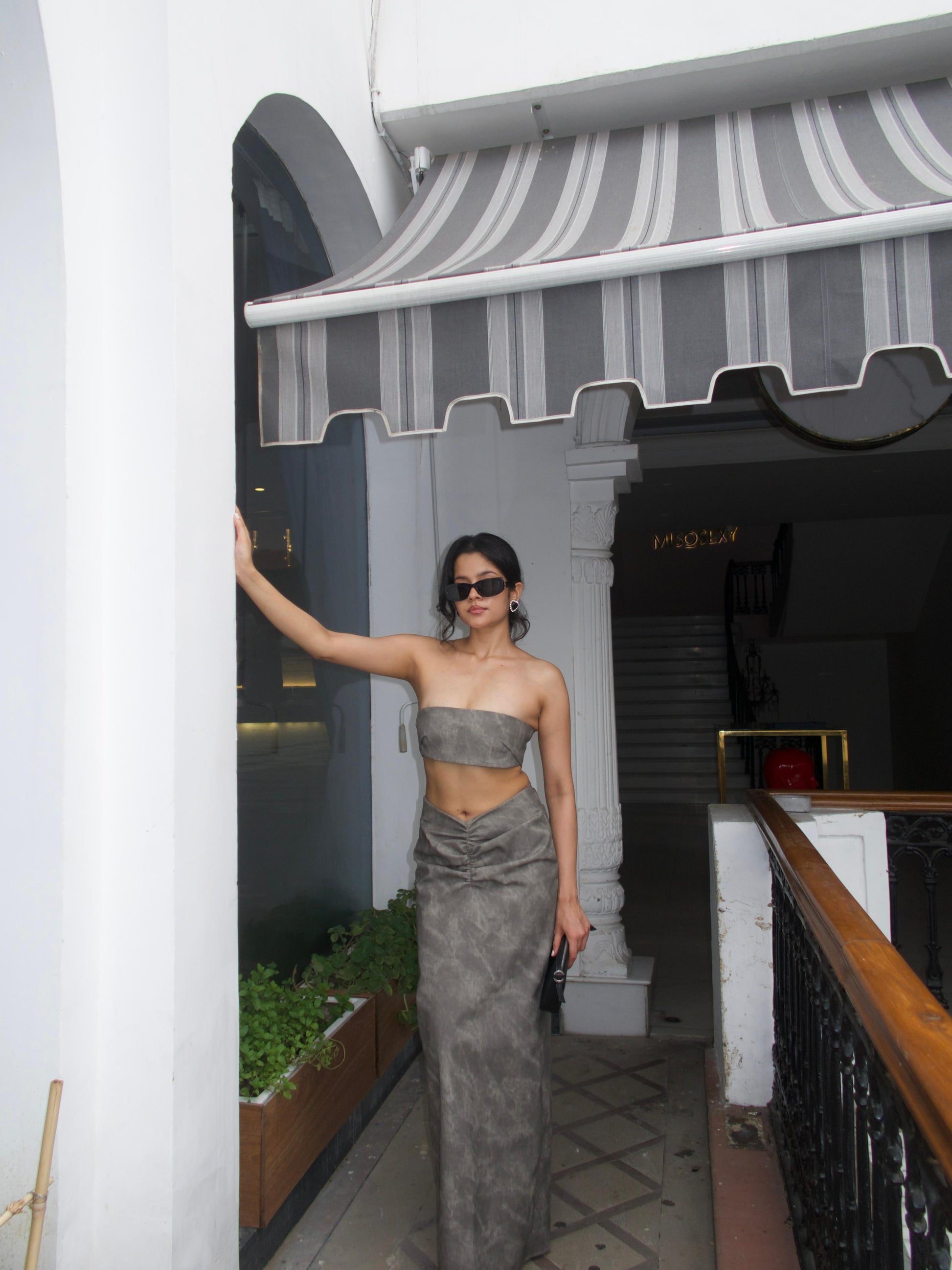 Caving Bralette comes a with straight fit skirt. It can be customised with strap or without.