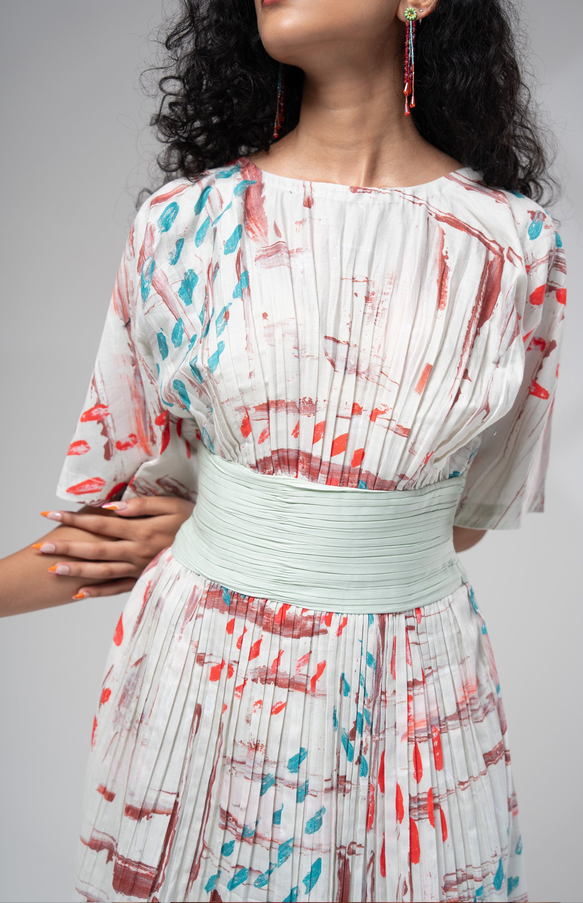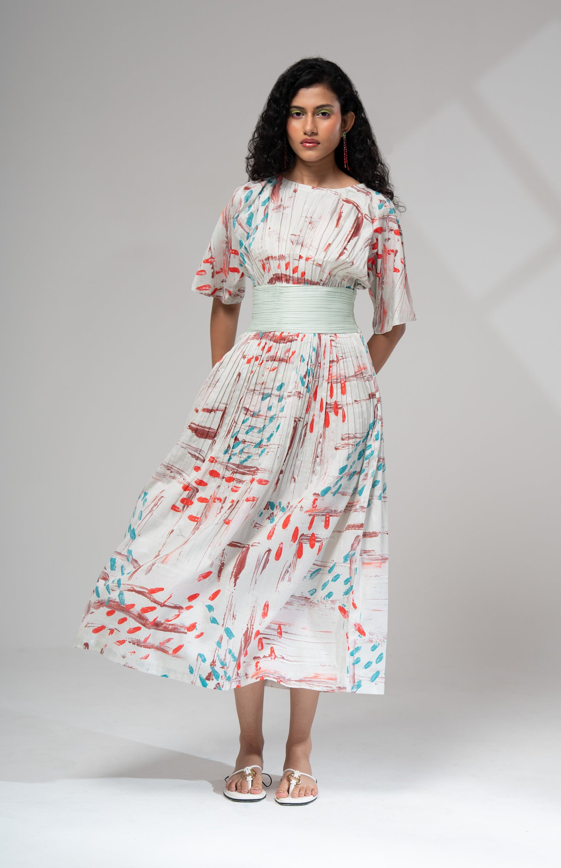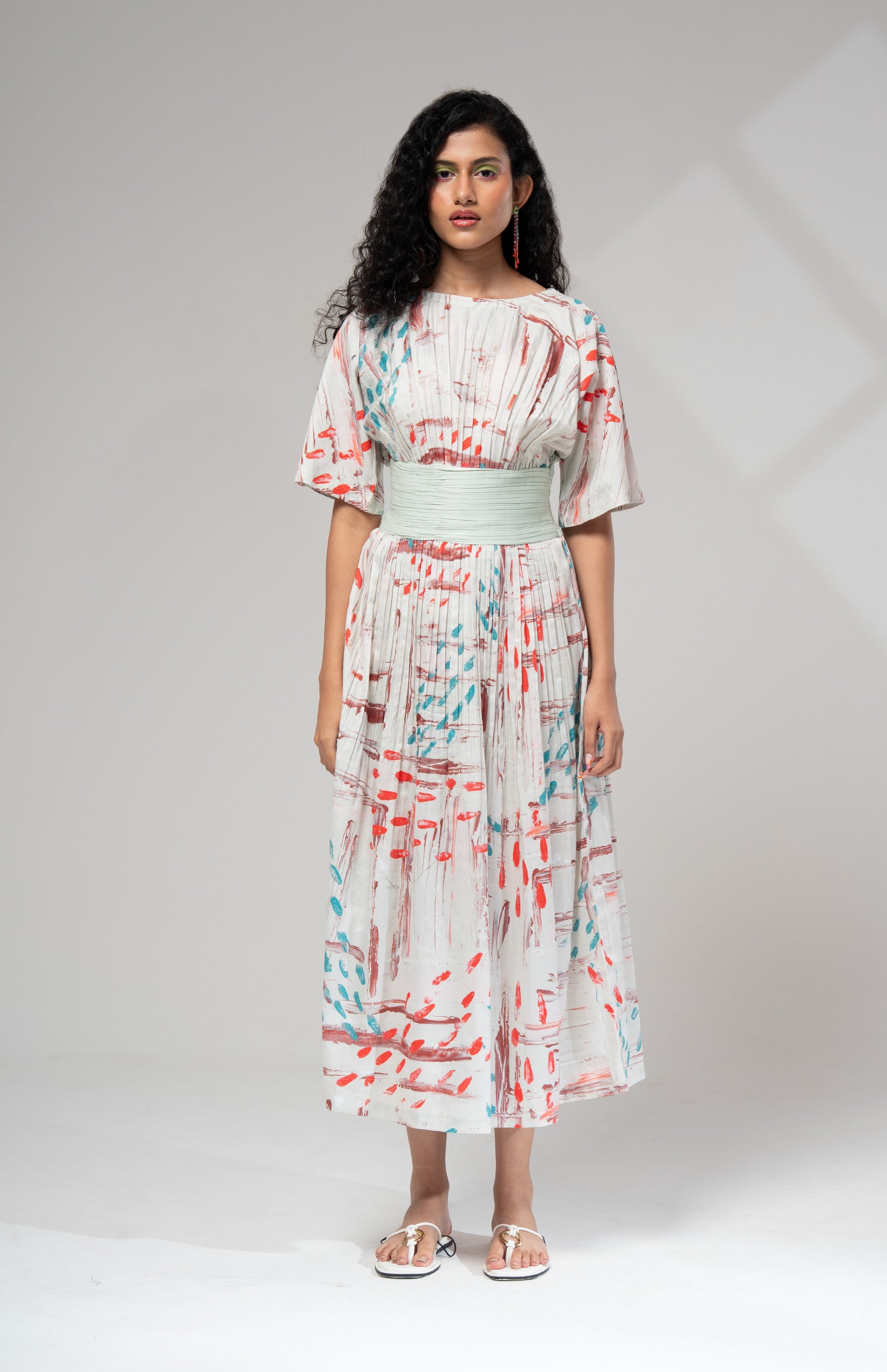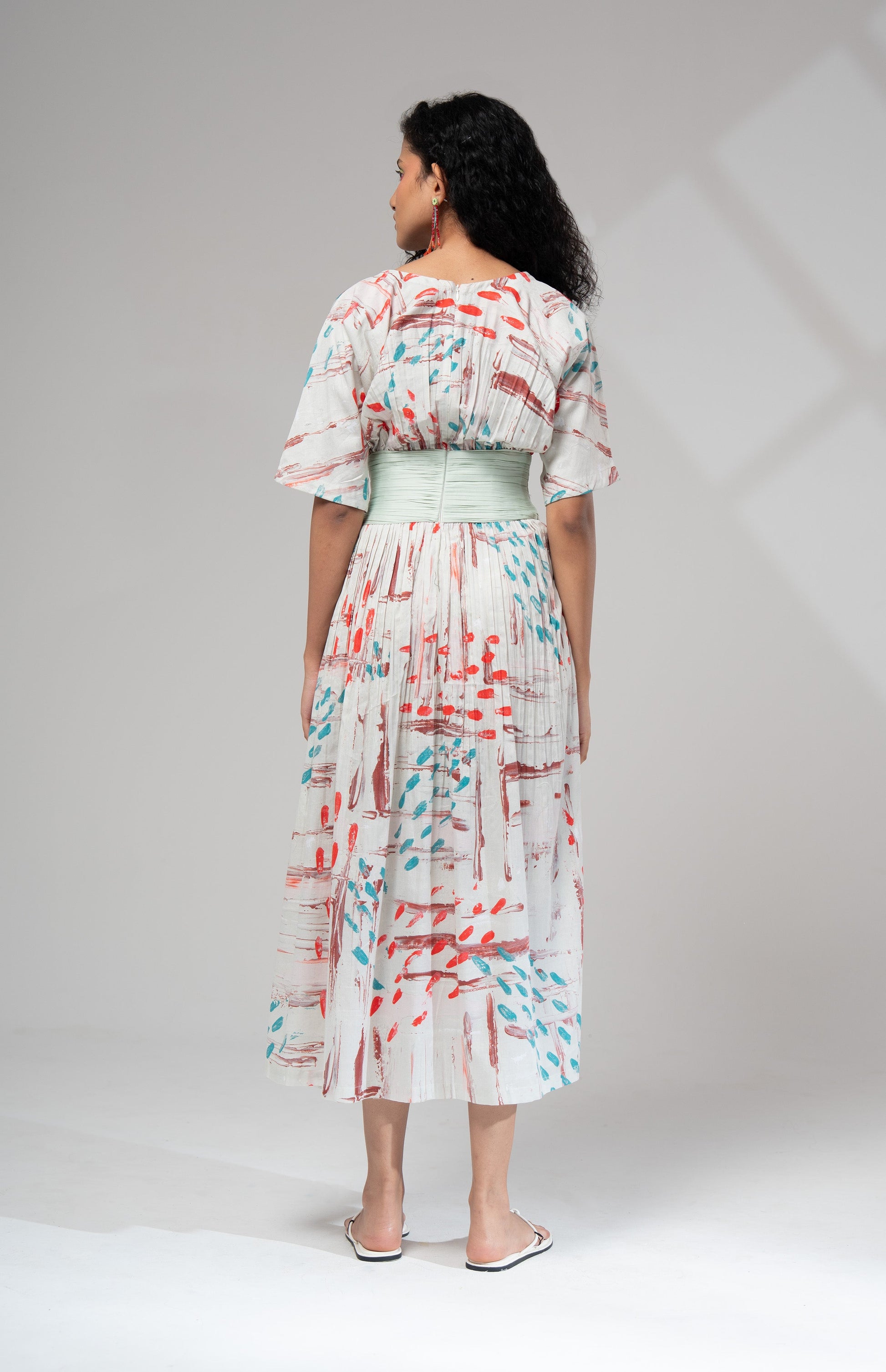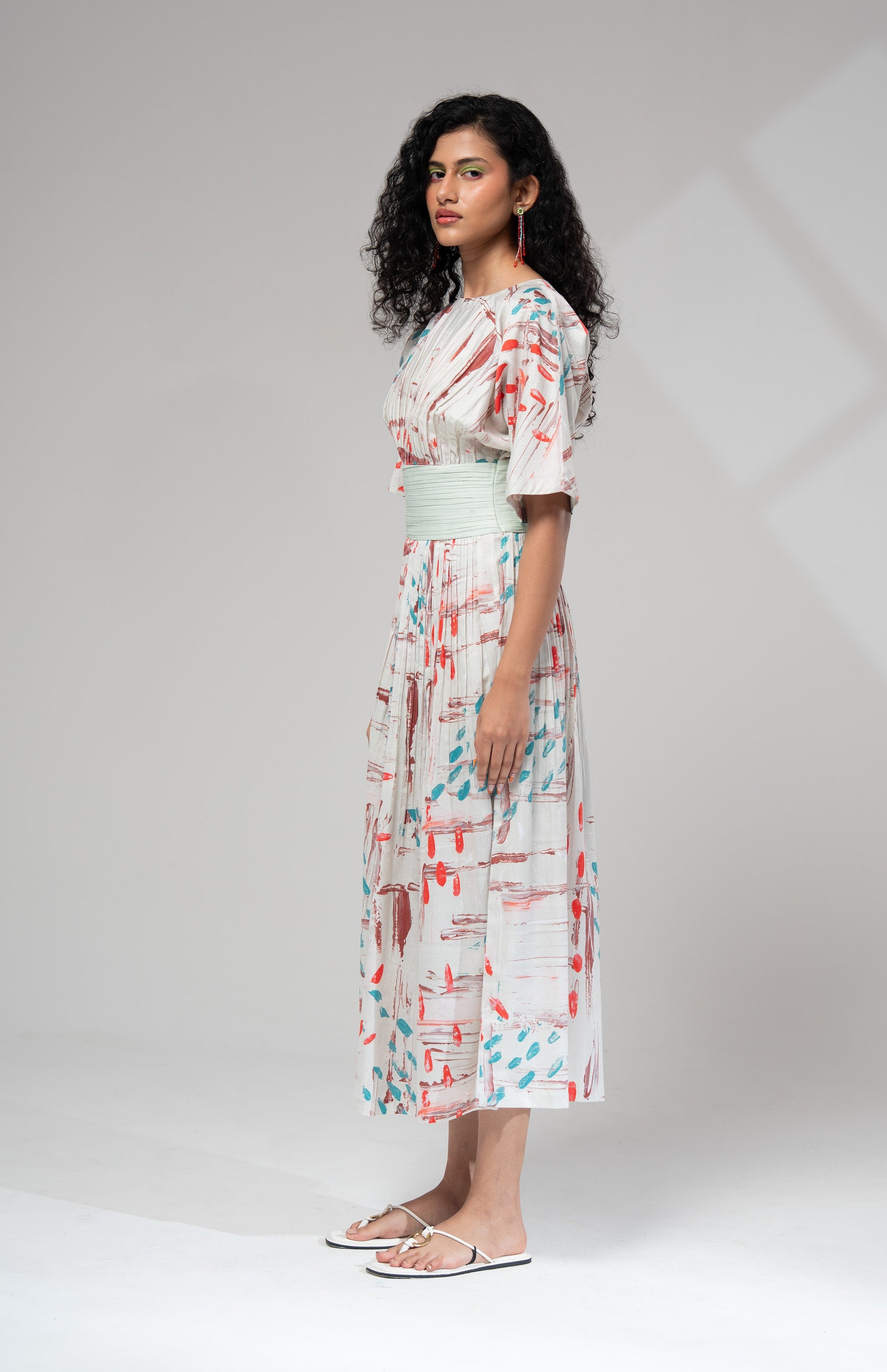 A midi length fitted dress with a gathered contrast panel at the waist. Cinched at the waist yet loose at the bust for that perfect, relaxed fit for any body type.
