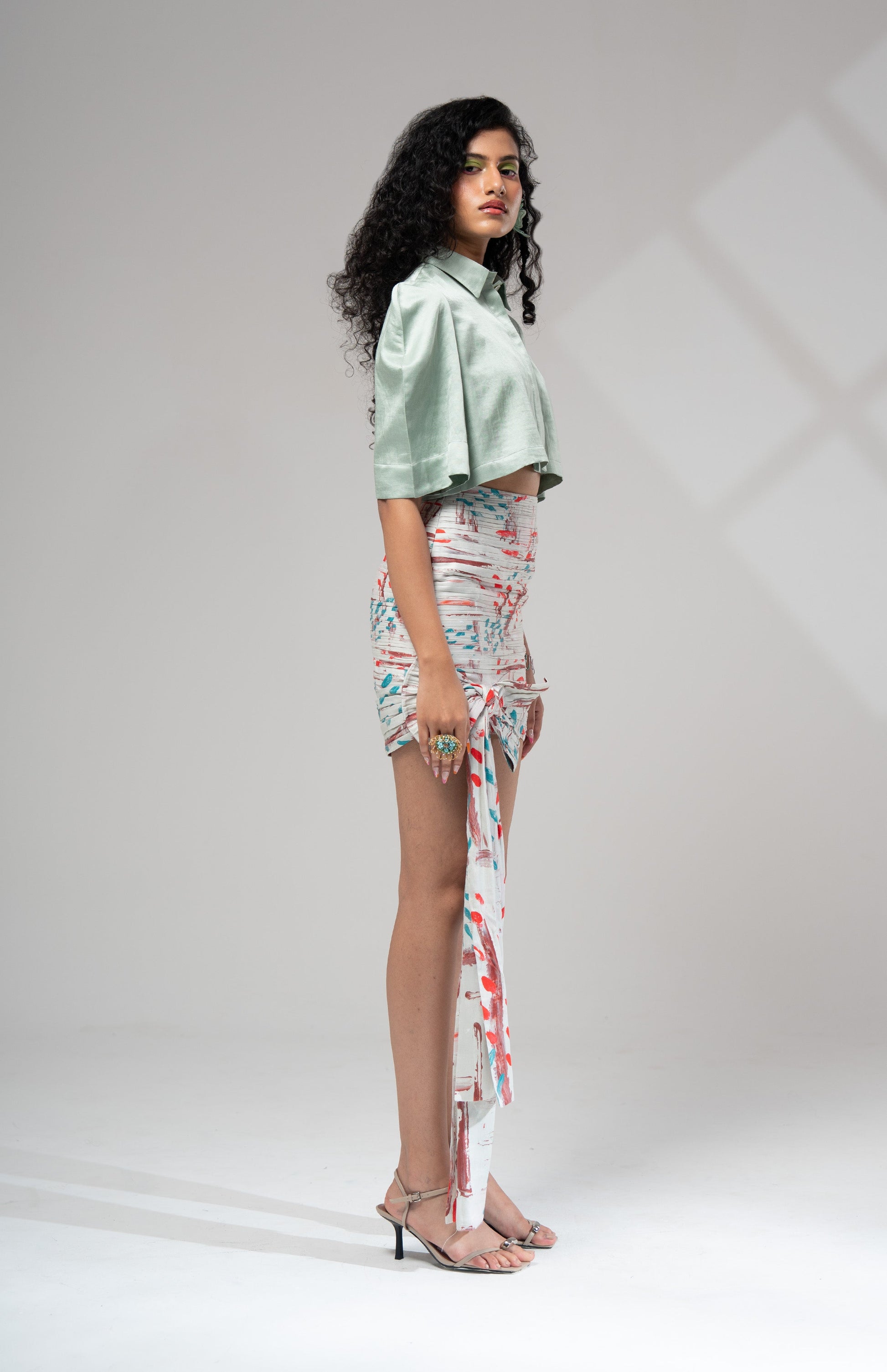 A solid colour cropped shirt with slightly puffed sleeves paired with a gathered skirt with a bow at one side.