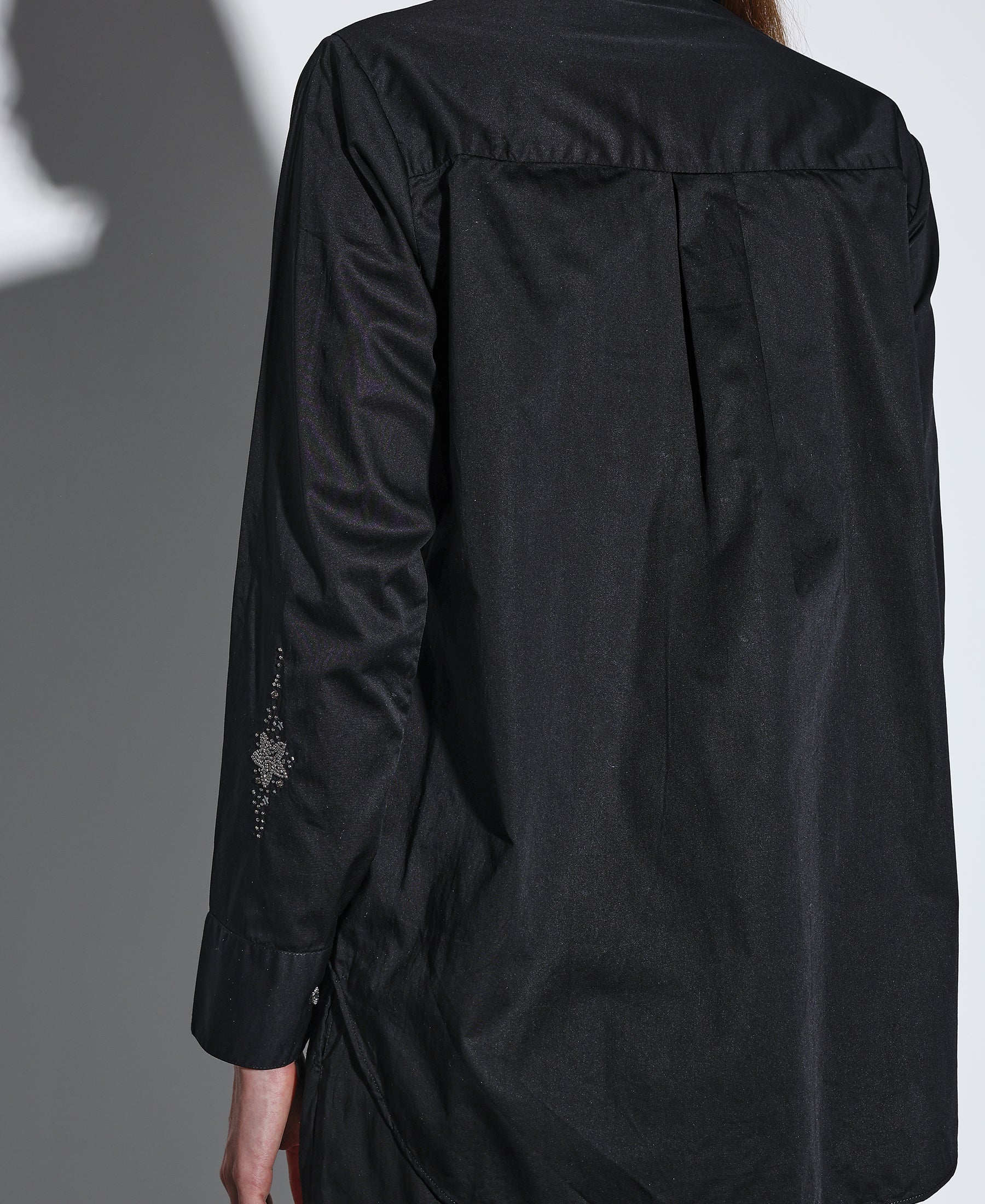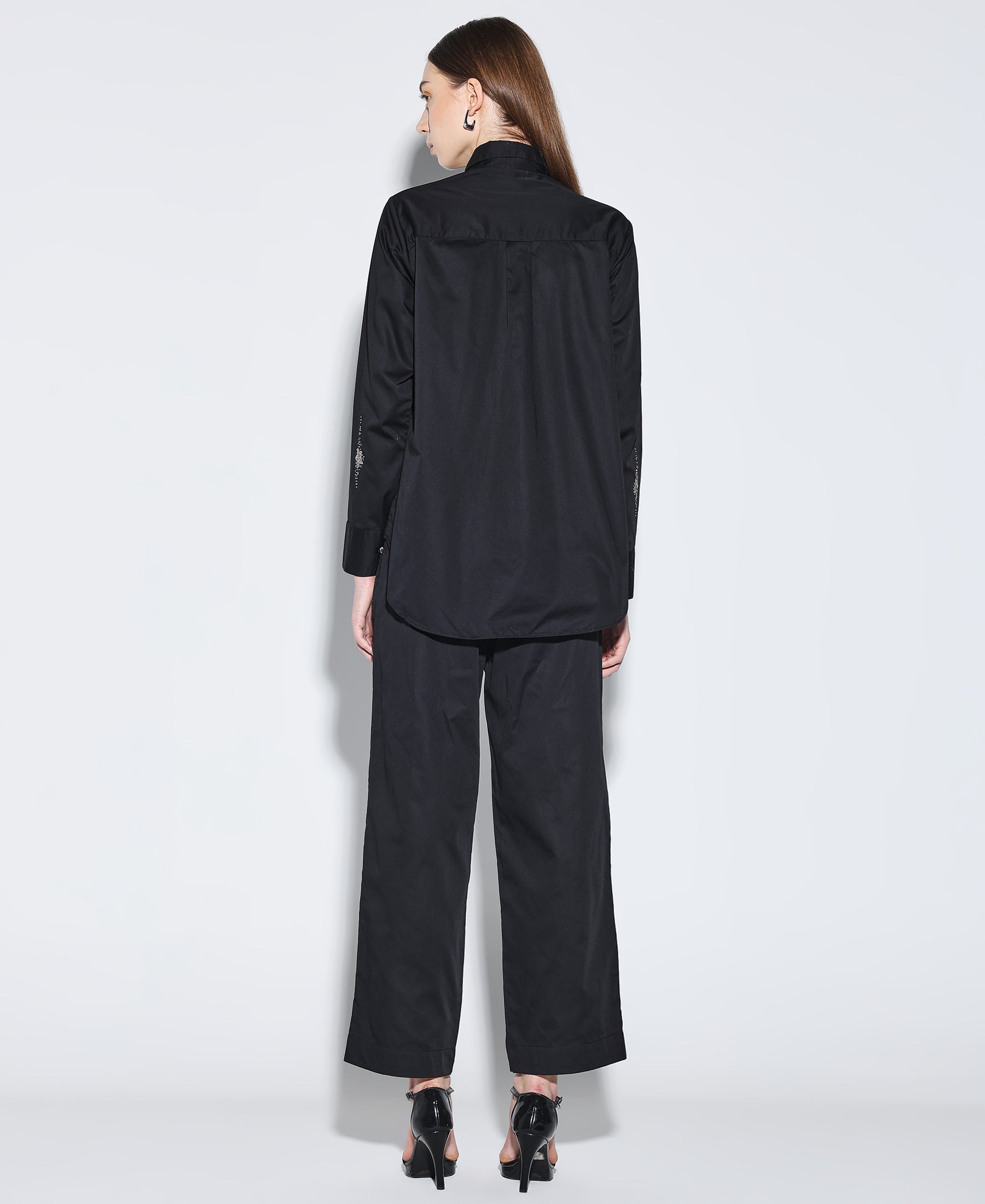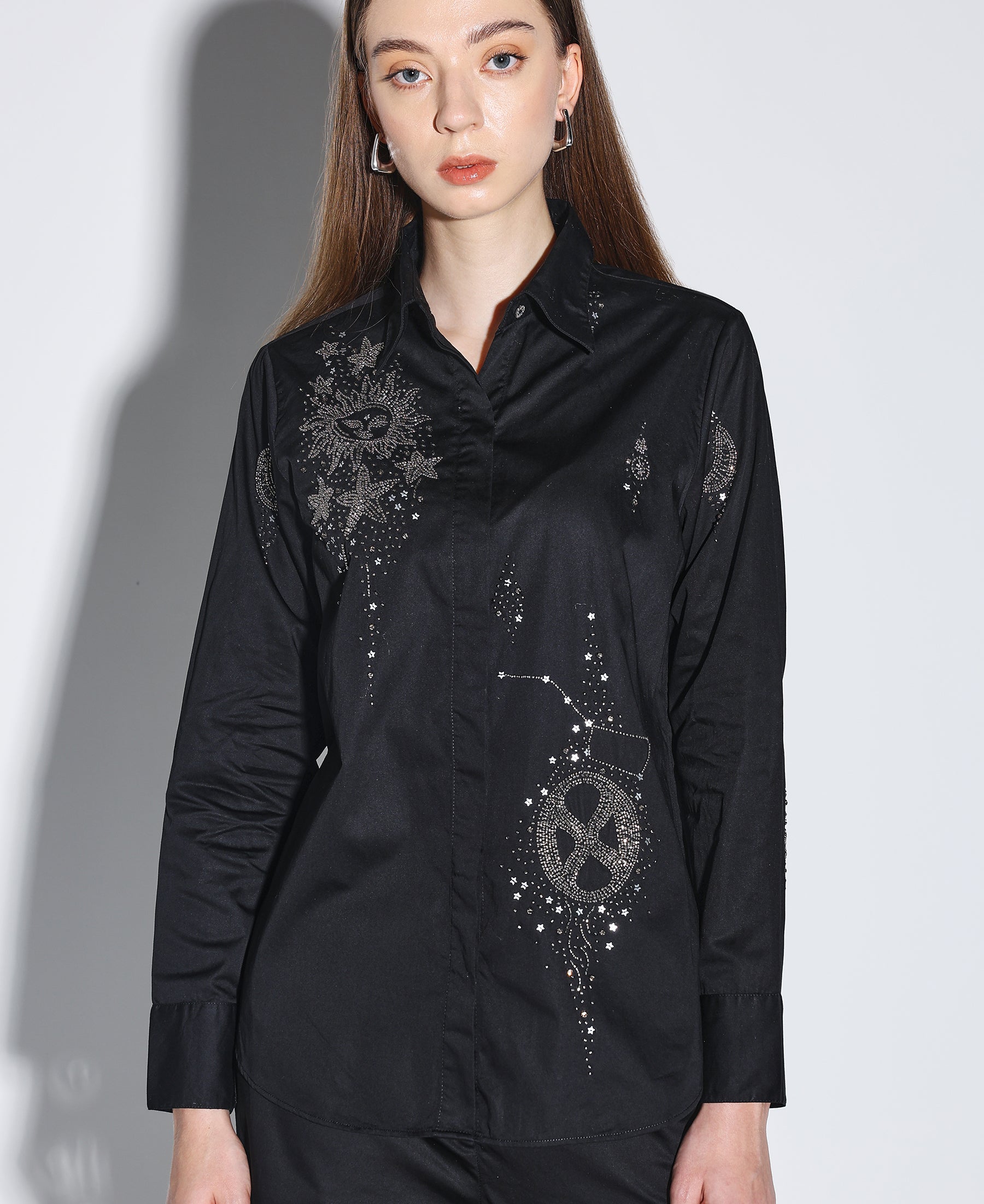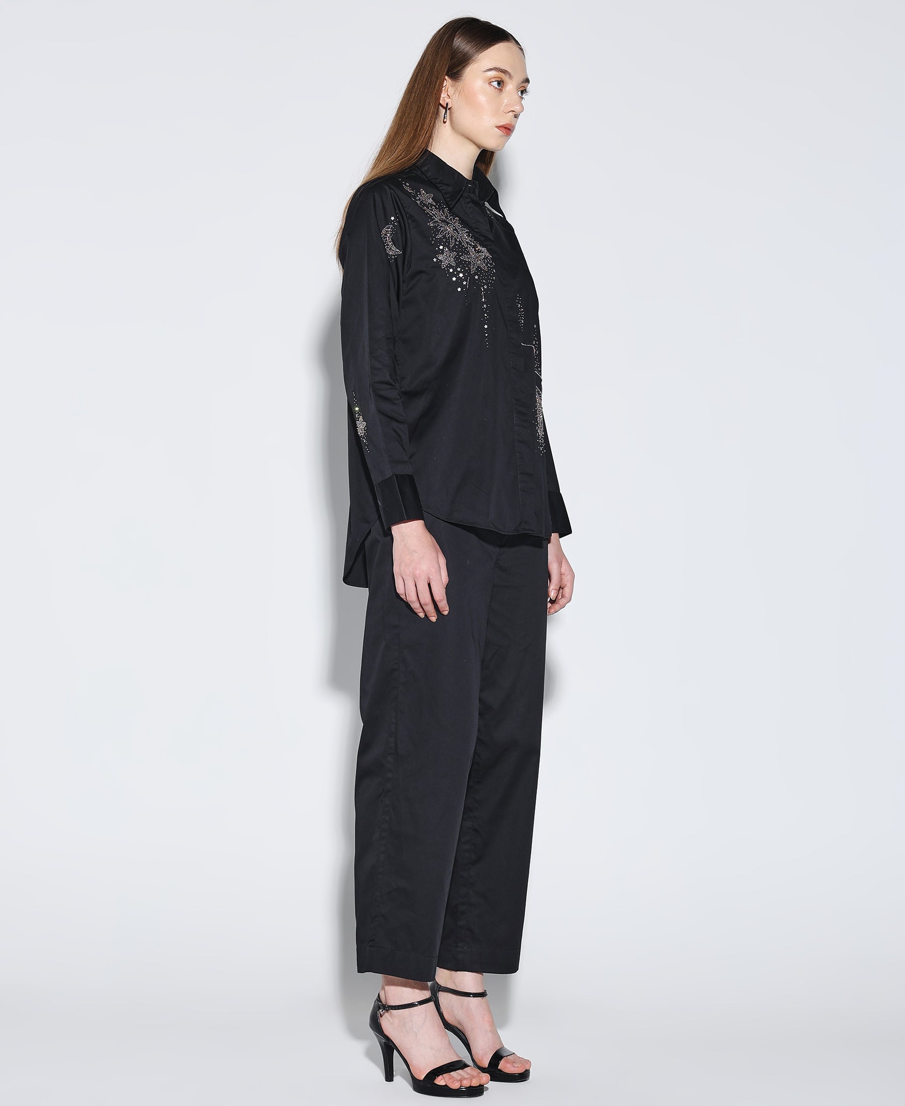 Embellished co-ord set with celestial motifs crafted in silver glass beads embroidery. The classic fit shirt tailored from fine quality cotton satin fabric paired with matching pants.
