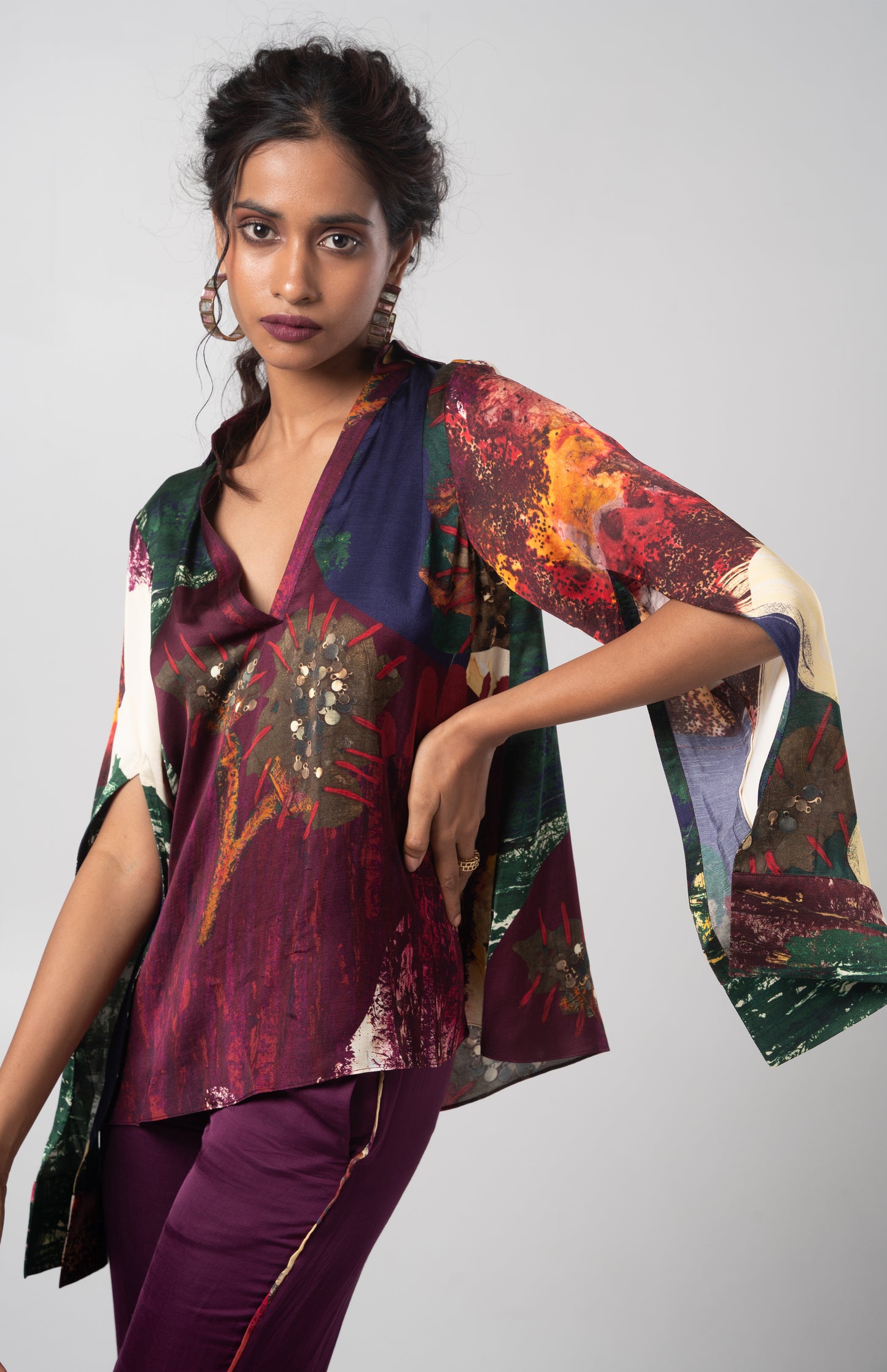 A V-neck top with cape sleeves paired with a solid flared trouser with a contrast piping detail along the side seam.