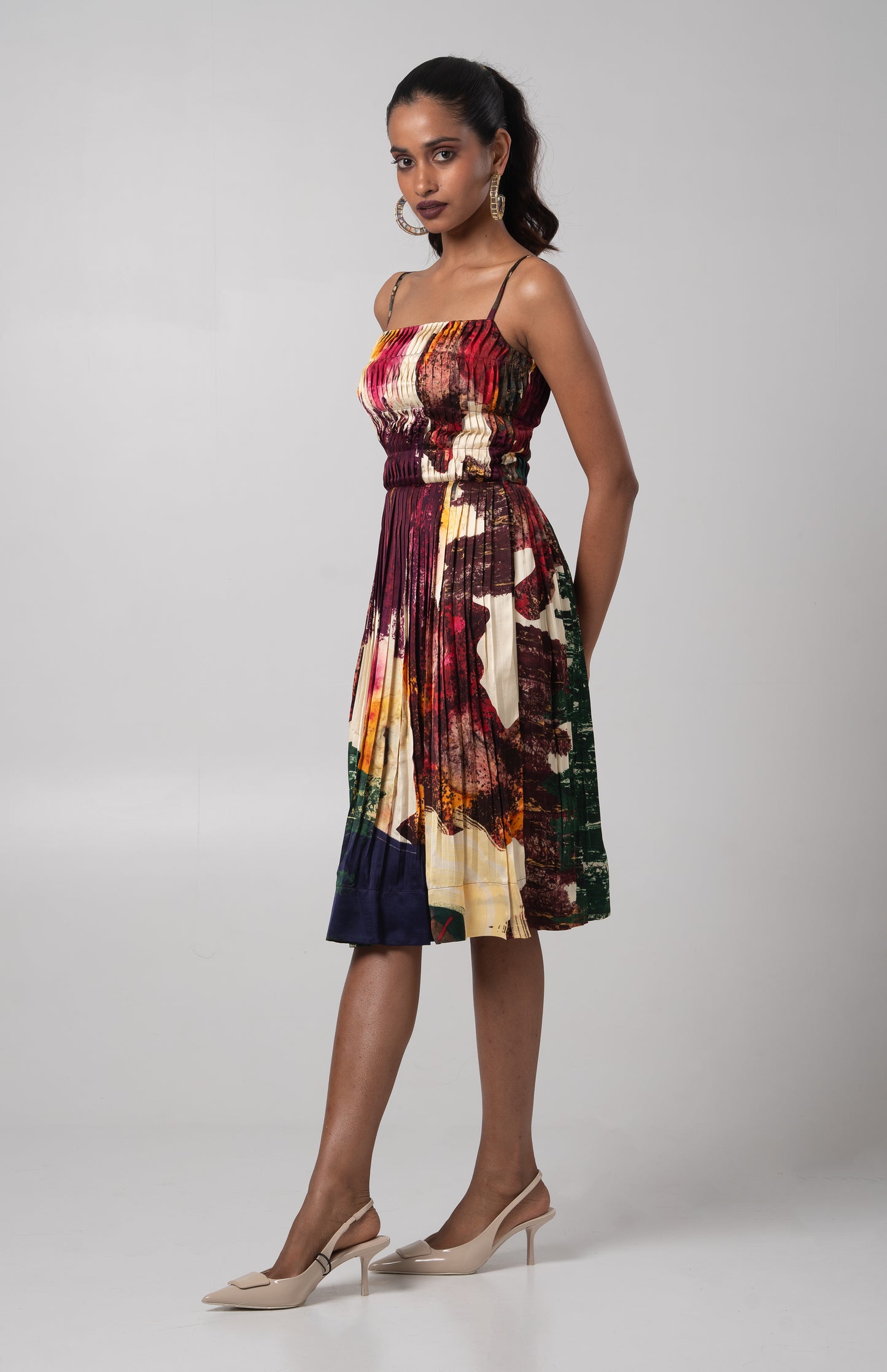 A knee length dress featuring a fitted bodice with tucks and knife pleats from the waist below.