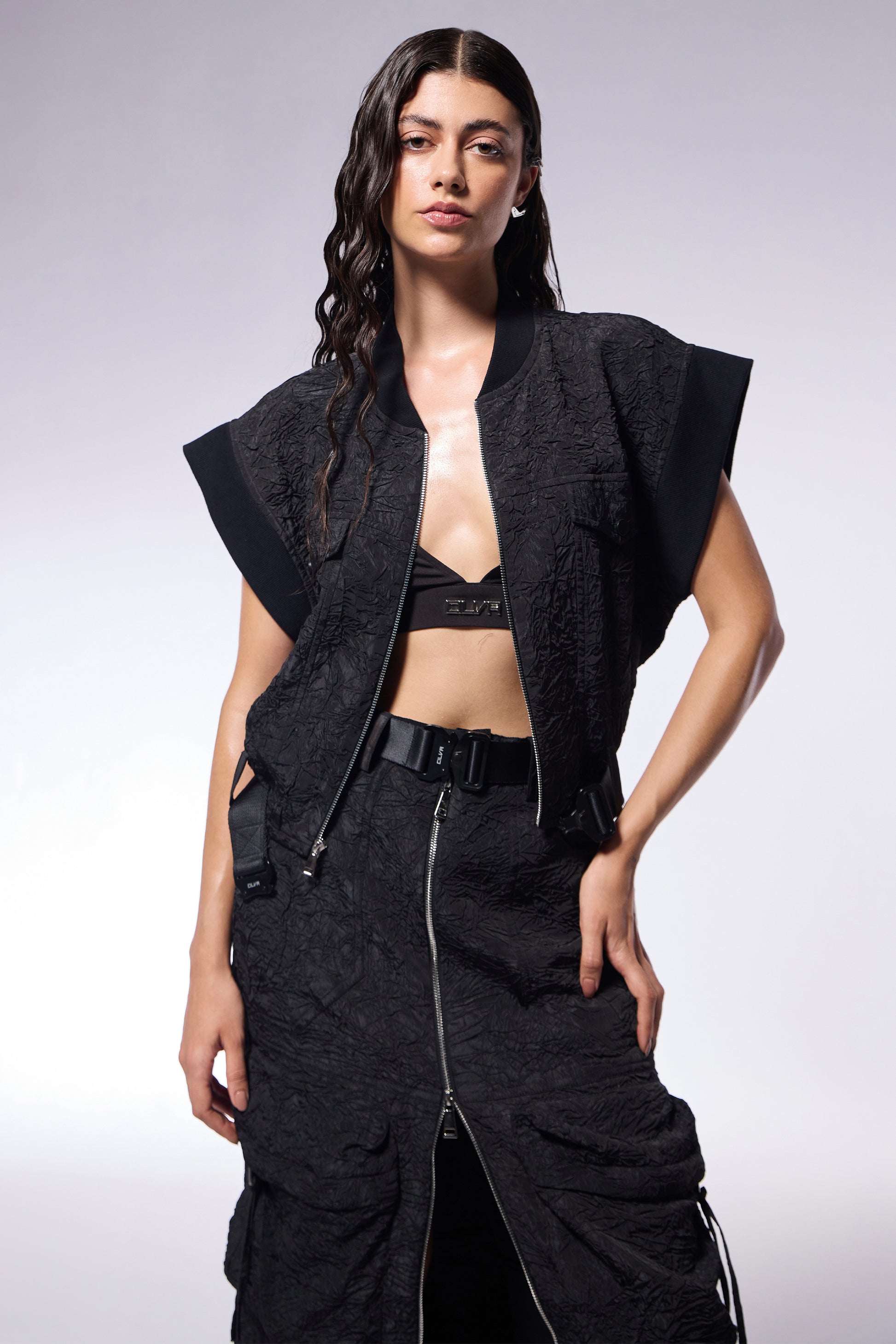 A textured co-ord set featuring a structured cropped jacket and a high-waisted cargo skirt with a front zipper slit.