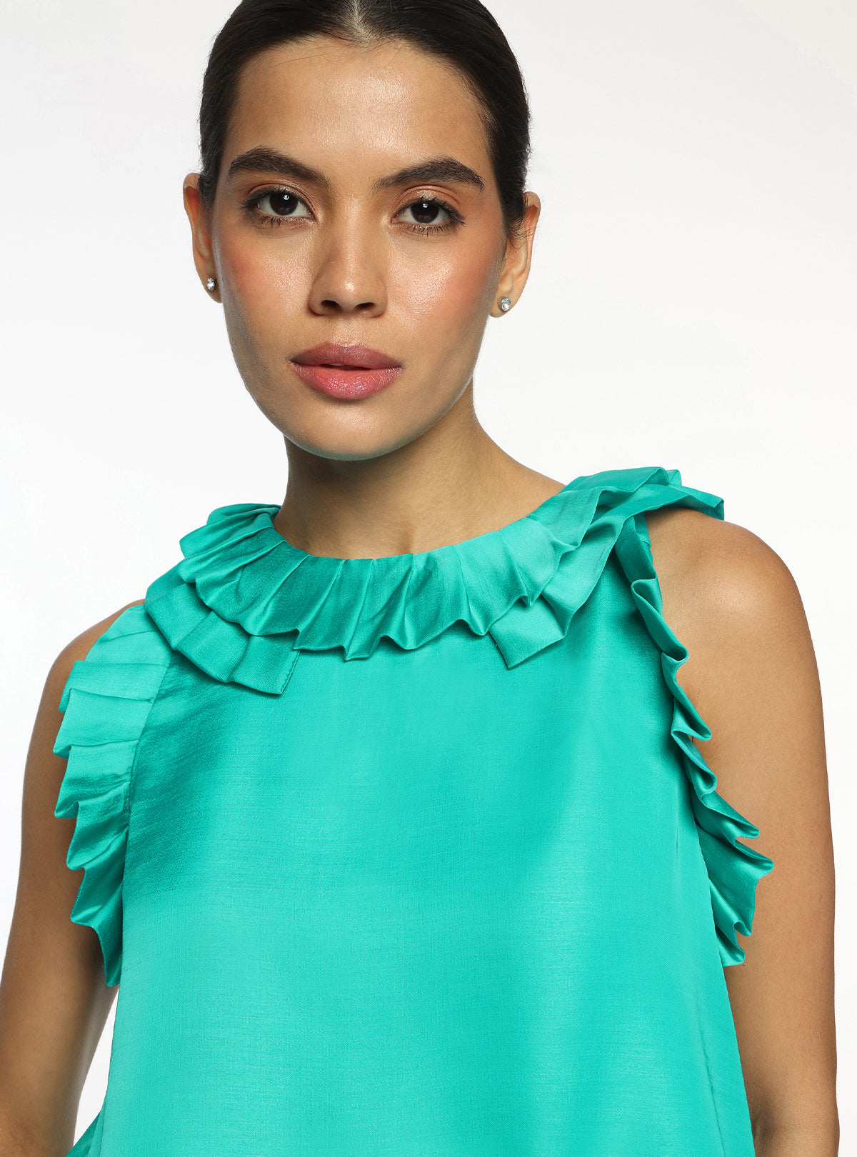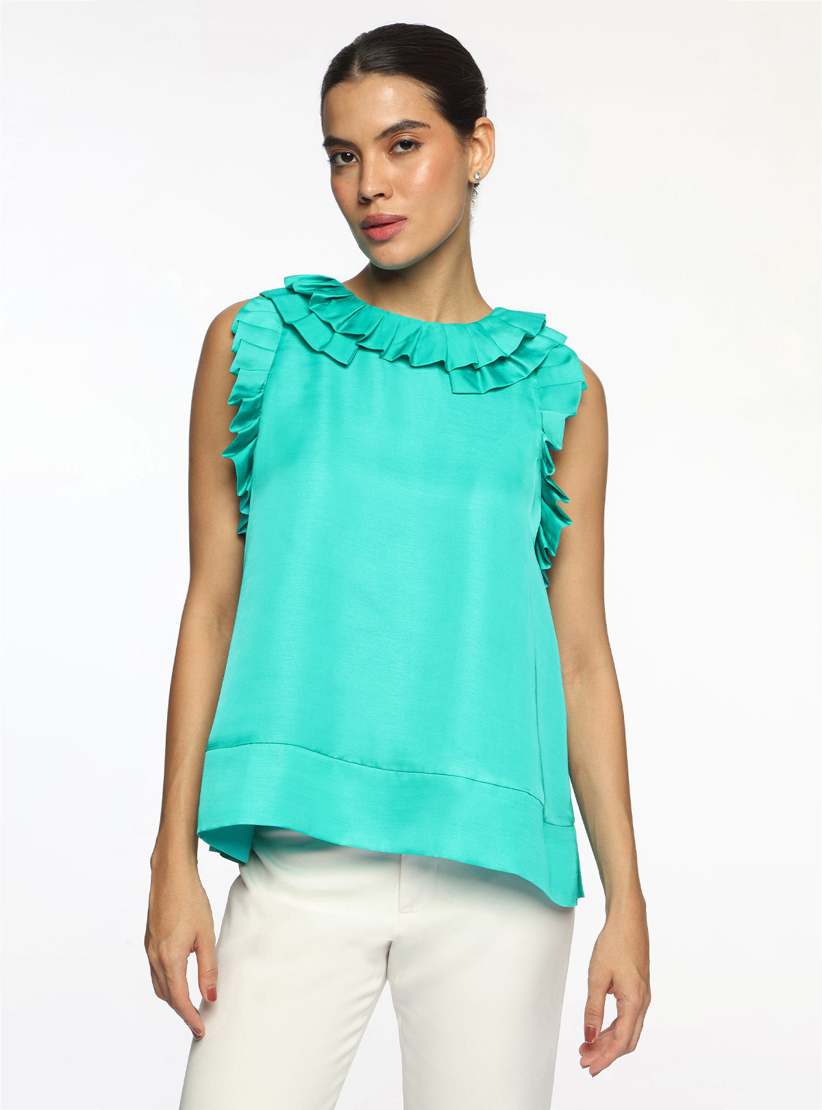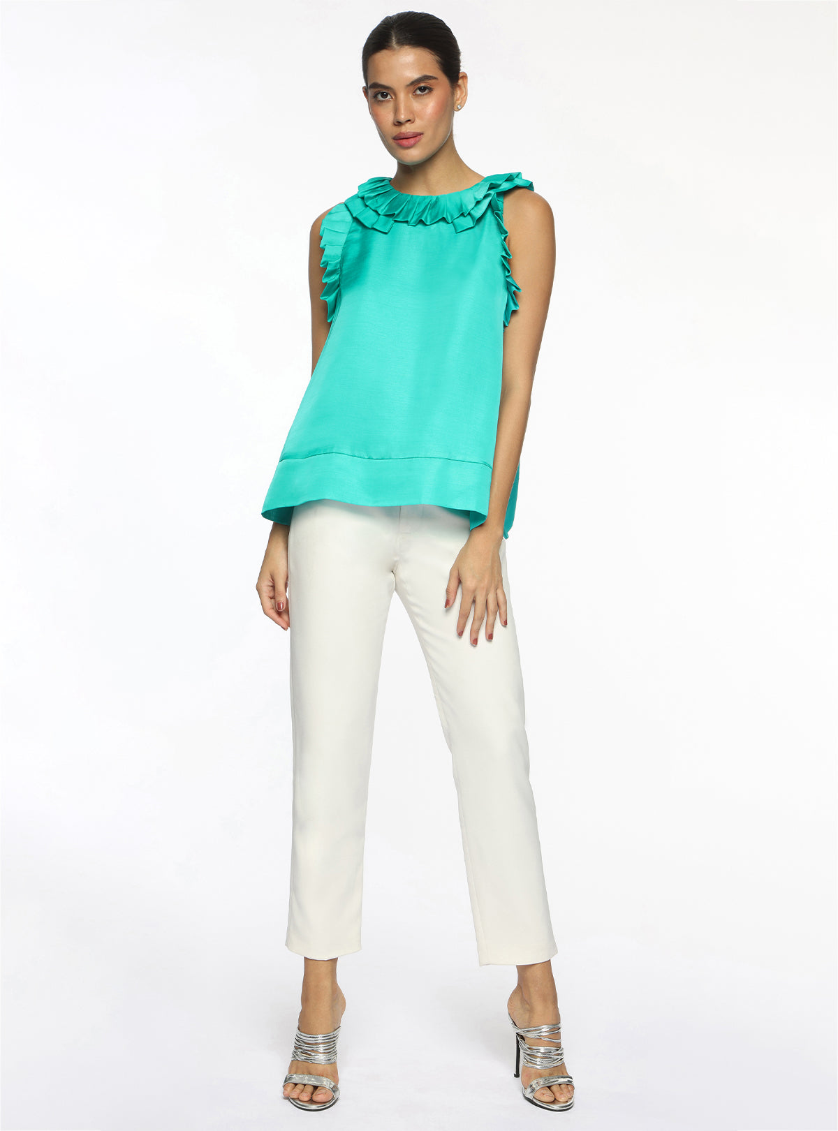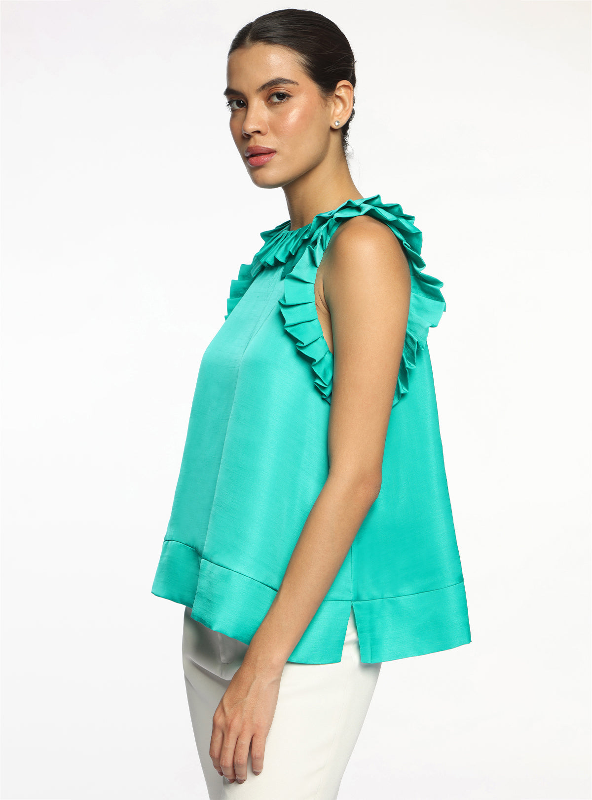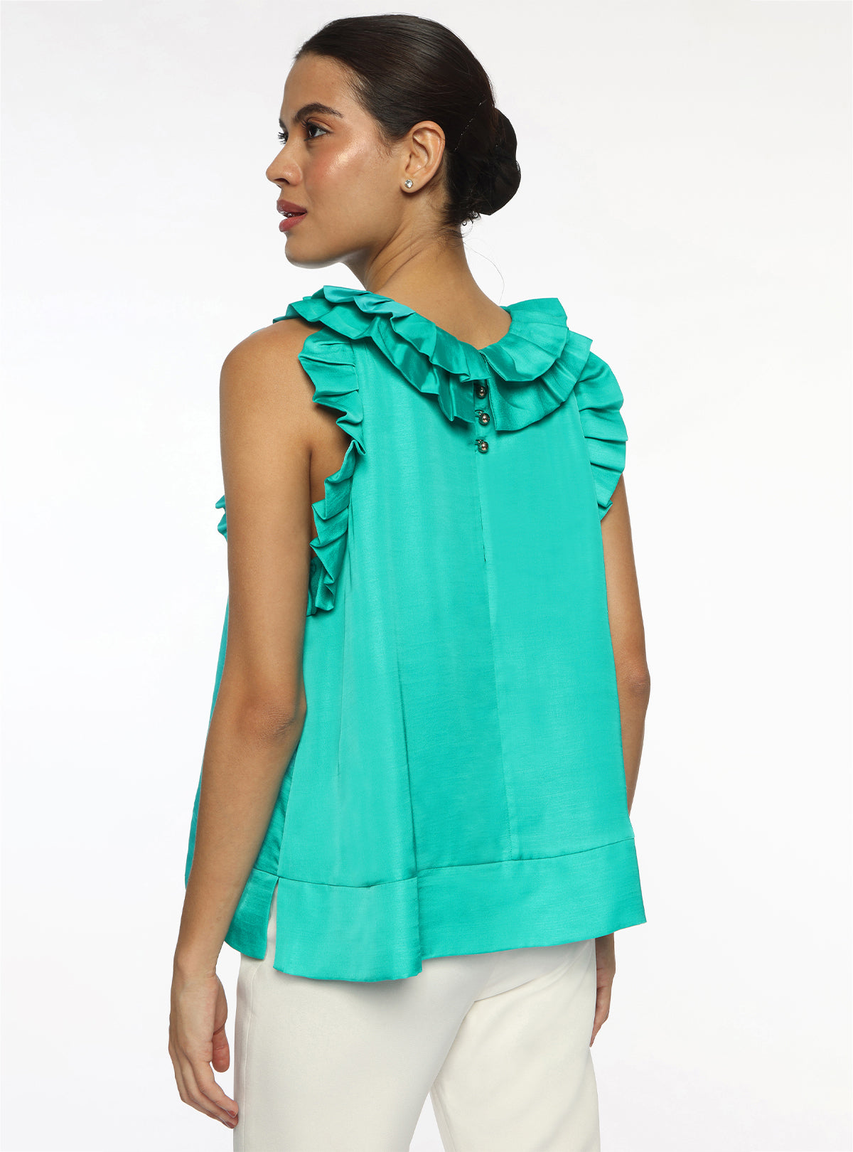 Elevate your style with this sleeveless top, featuring a gorgeous ruffled neckline, sleek metal buttons at the back, and chic slits at both ends. The soft, draping fabric ensures a comfortable, elegant fit for any occasion.