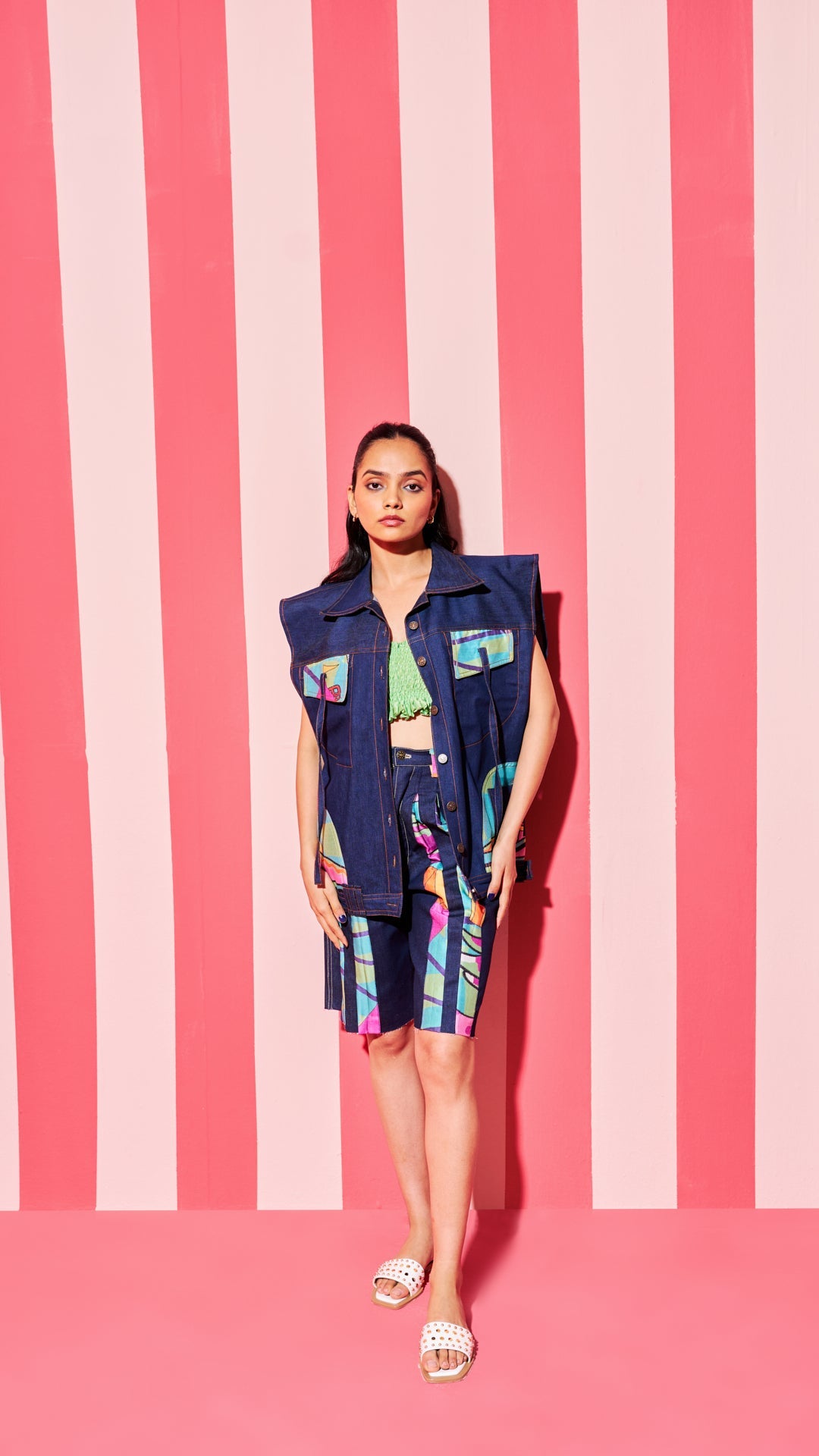Oversized sleeveless vest. Spread collar and front button closure. Printed front pocket detailing.
