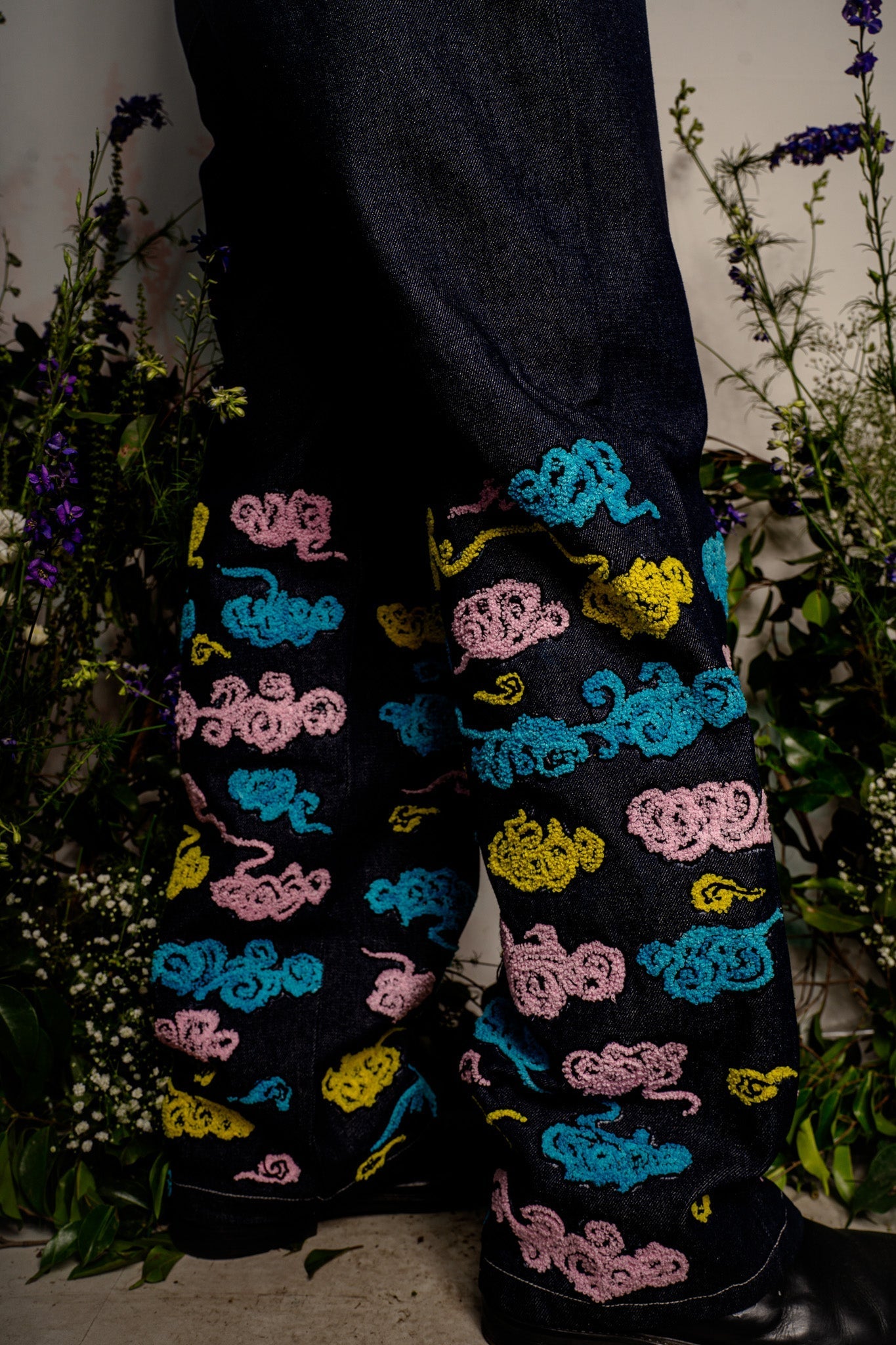 I LOVEE THE VATAVARAN OF THESE DENIMS. – a standout choice that's more than just jeans,bottoms. Featuring captivating Japanese cloud embroidery, these pants are the creative director's top pick for good reason. Make a statement, stand out, and elevate your style effortlessly with Cloud 9 Pants.
