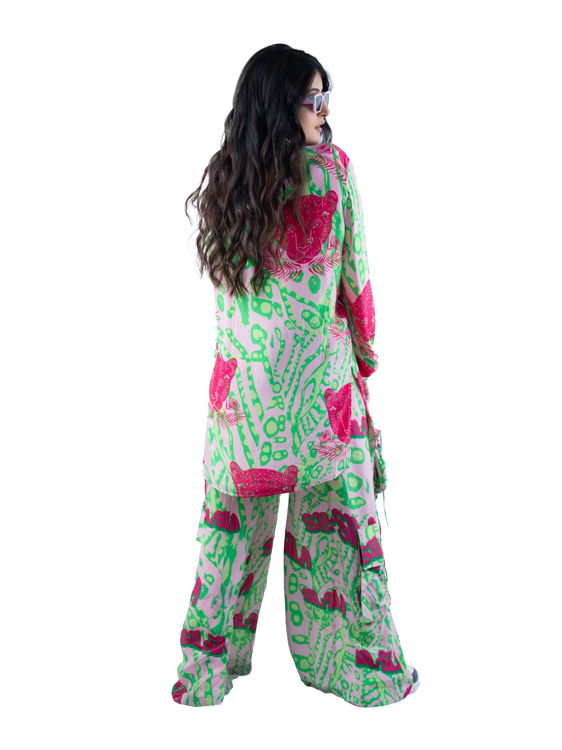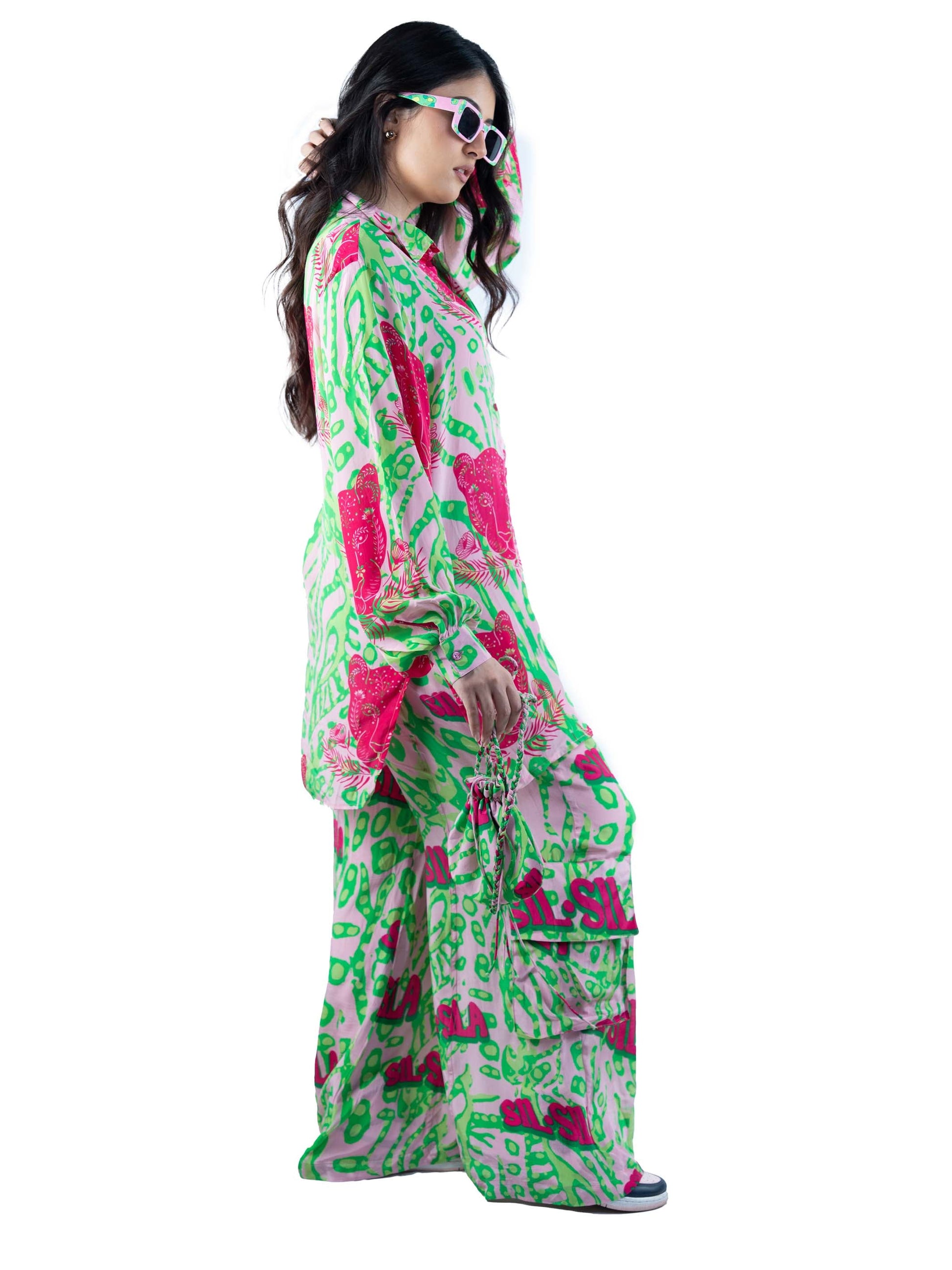 Who needs an ordinary Co-ord when you can rock a panther print that celebrates the untamed spirit of summer? The oversized shirt and cargo pants are made from the smoothest silk fabric, that feels like a gentle summer breeze against your skin and ensures maximum comfort as you strut your stuff.