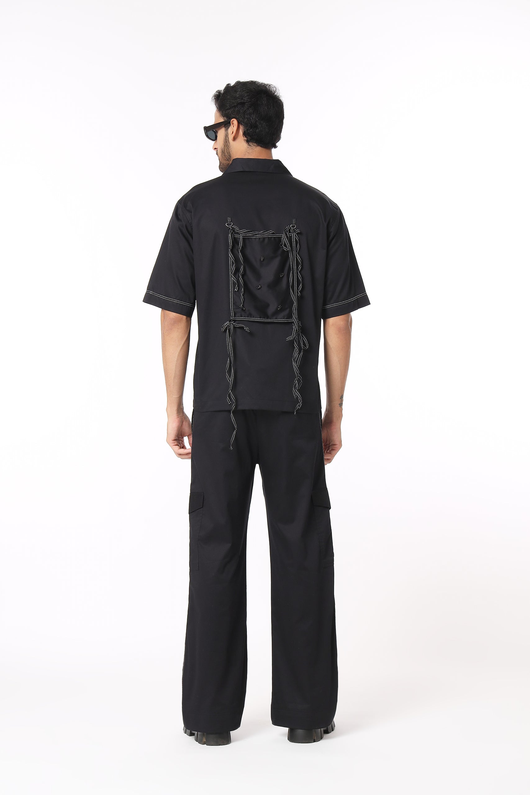 Pants: Black cotton satin pants with cotton tape details on side seam with a relaxed fit