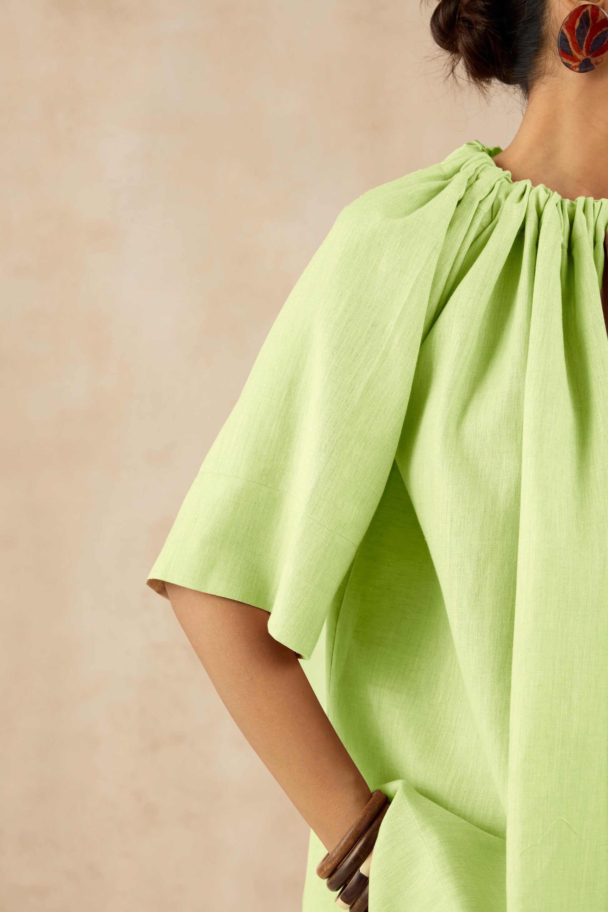 The Cappadocia Top is a statement in effortless style, featuring a gathered neckline with an adjustable tie-up detail that adds a touch of sophistication. Its relaxed silhouette, wide sleeves, and breathable linenfabric offer both comfort and versatility, making it a perfect choice for any occasion. Can be paired with structured trousers for a polished look or styled with flowy pants for a laid-back vibe.