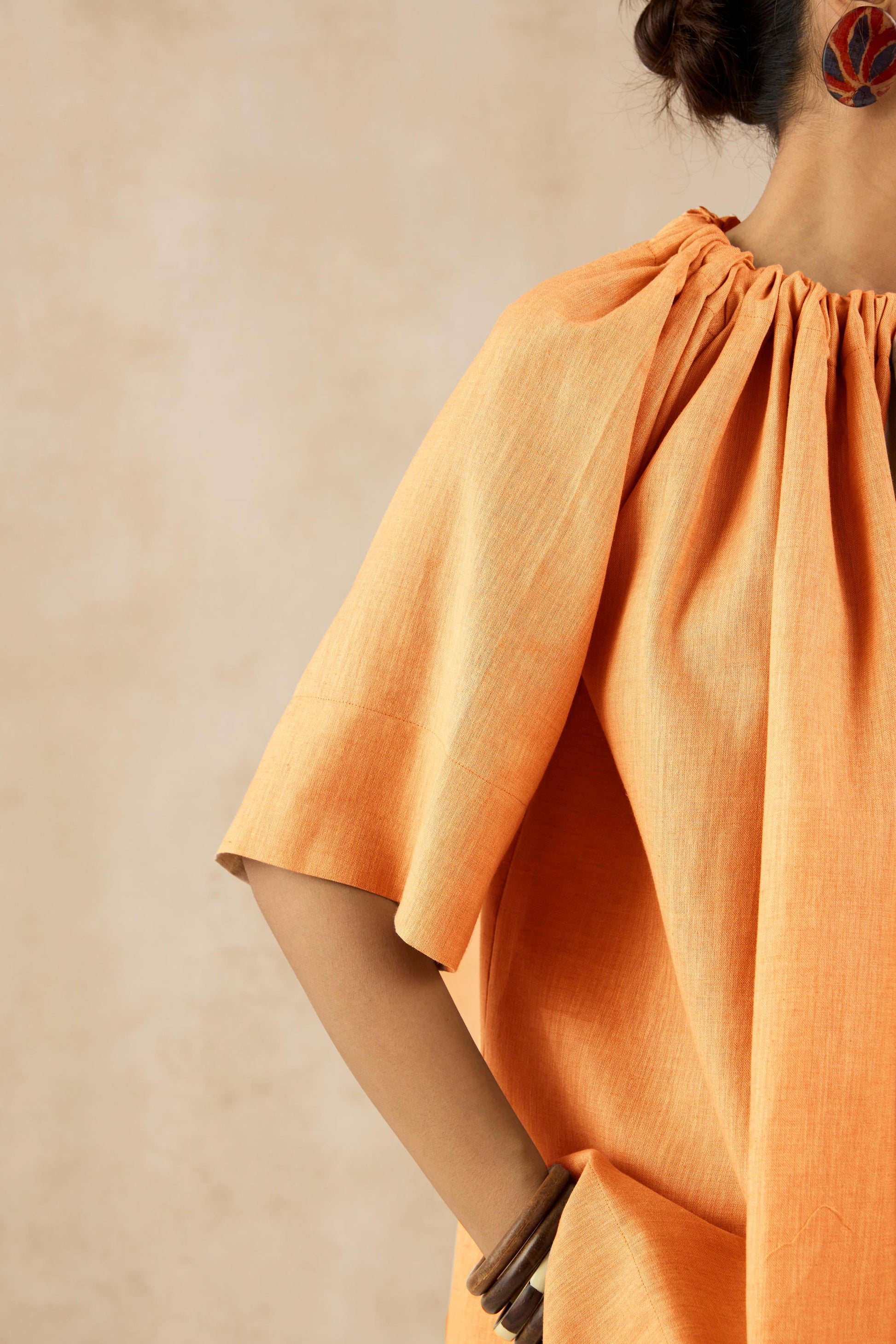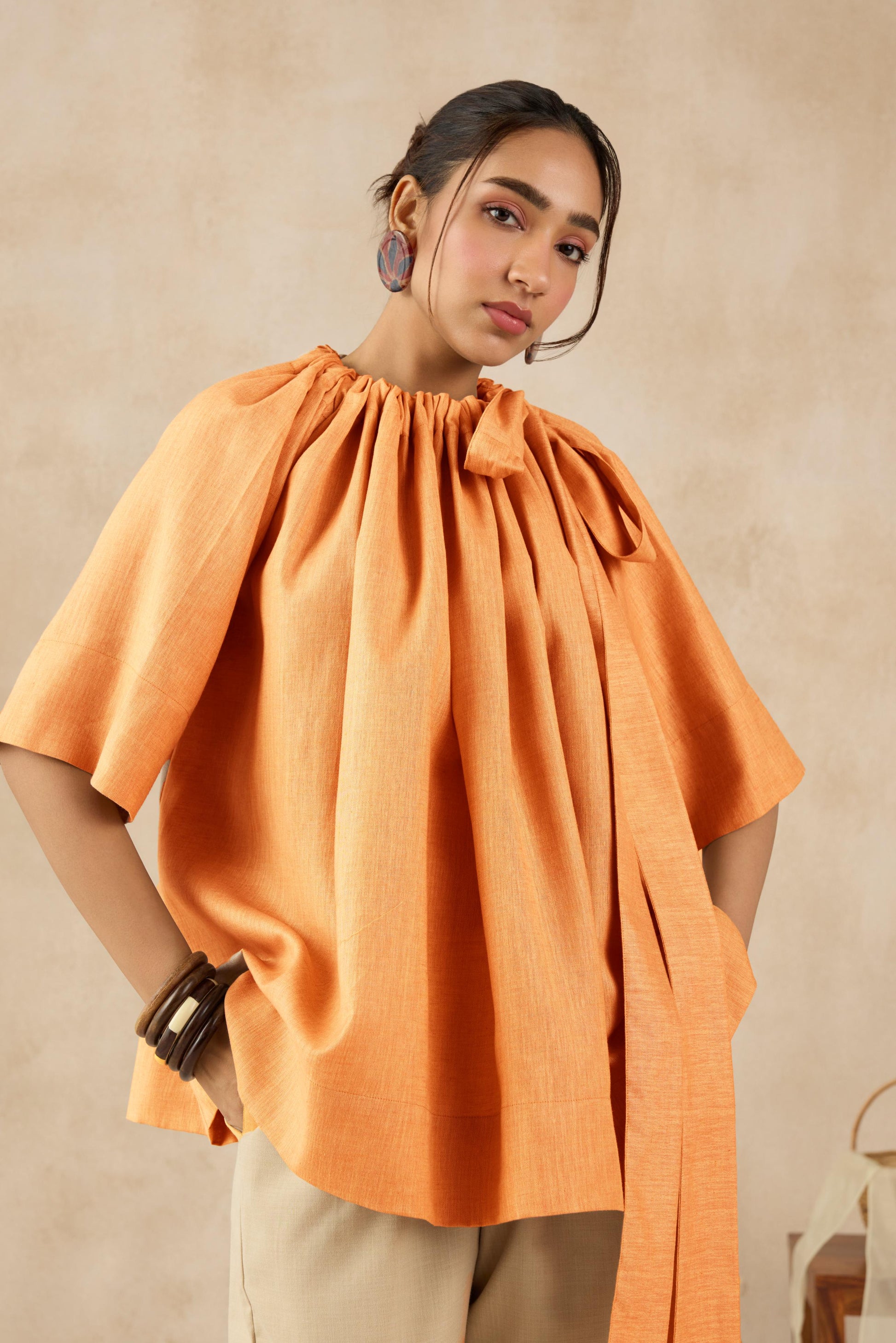 The Cappadocia Top is a statement in effortless style, featuring a gathered neckline with an adjustable tie-up detail that adds a touch of sophistication. Its relaxed silhouette, wide sleeves, and breathable linenfabric offer both comfort and versatility, making it a perfect choice for any occasion. Can be paired with structured trousers for a polished look or styled with flowy pants for a laid-back vibe.