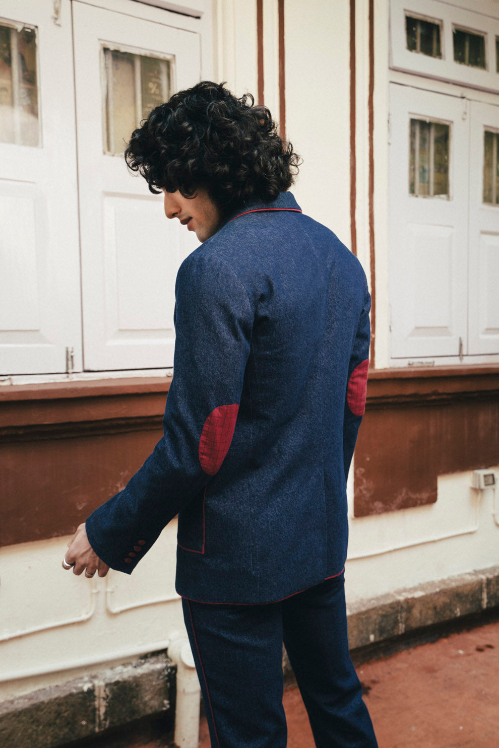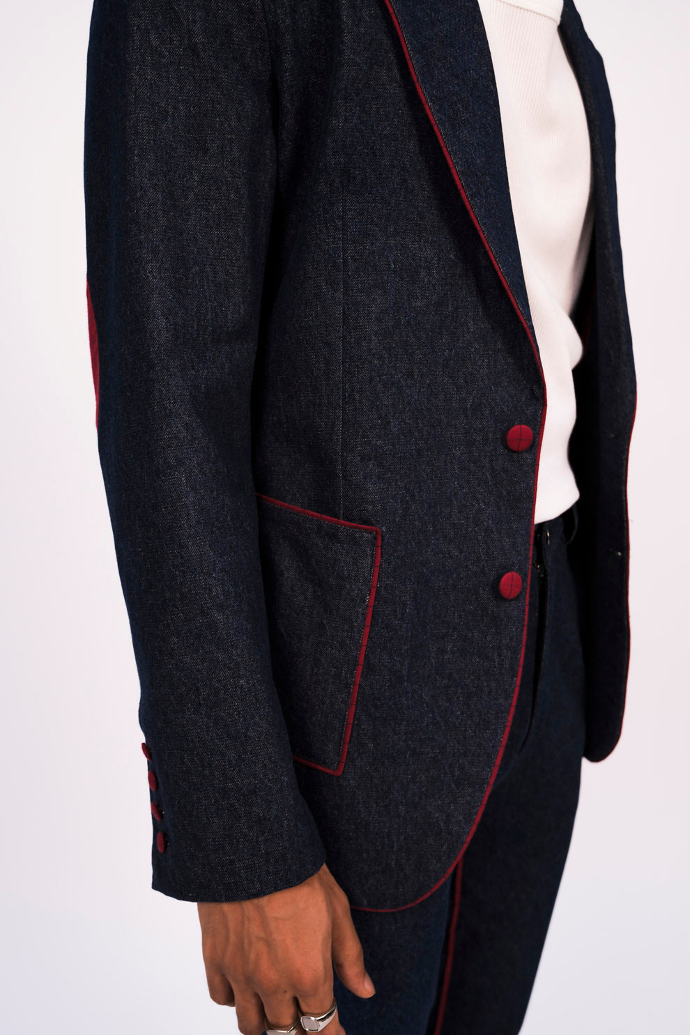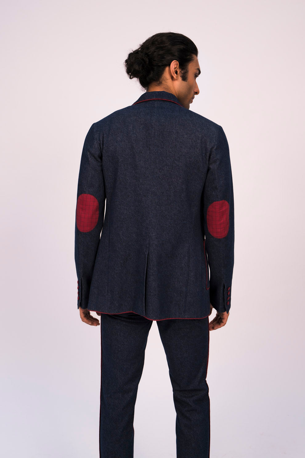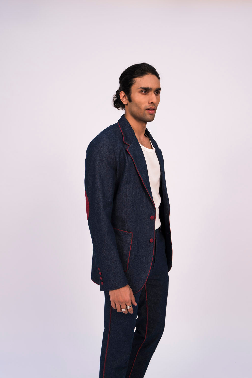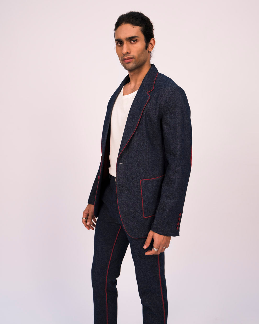 notched lapel - single breasted front - contrast piping detail - front patch pockets - double button closure - back slit - regular fit