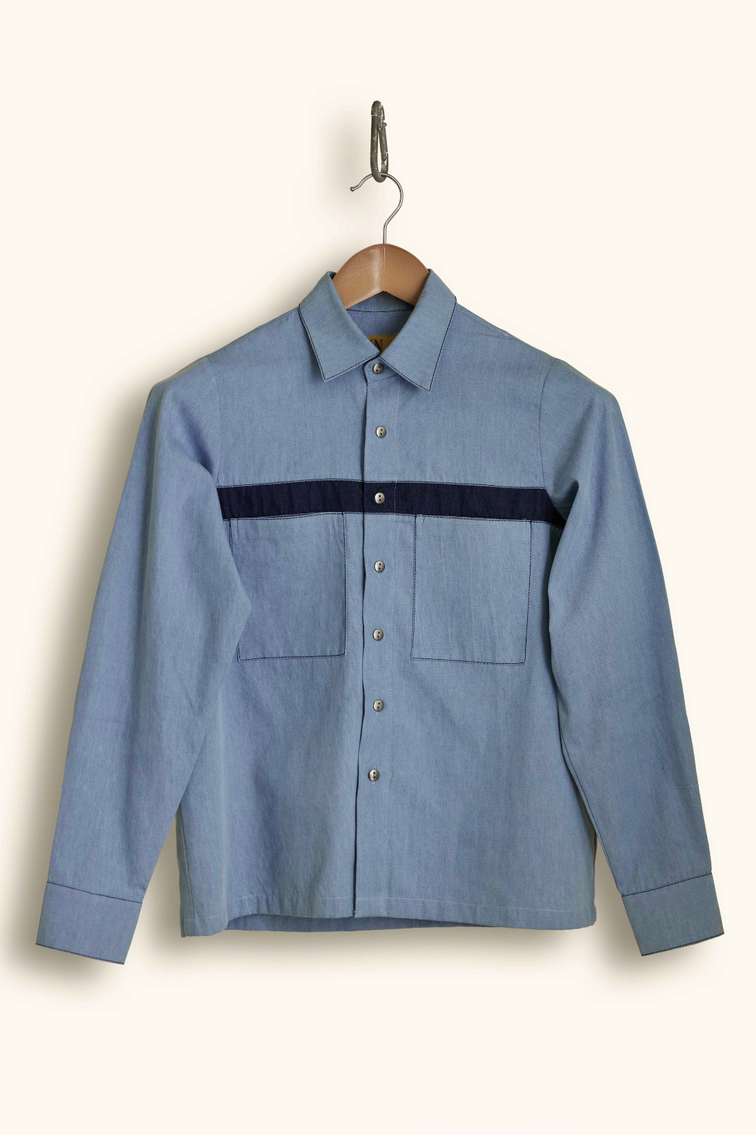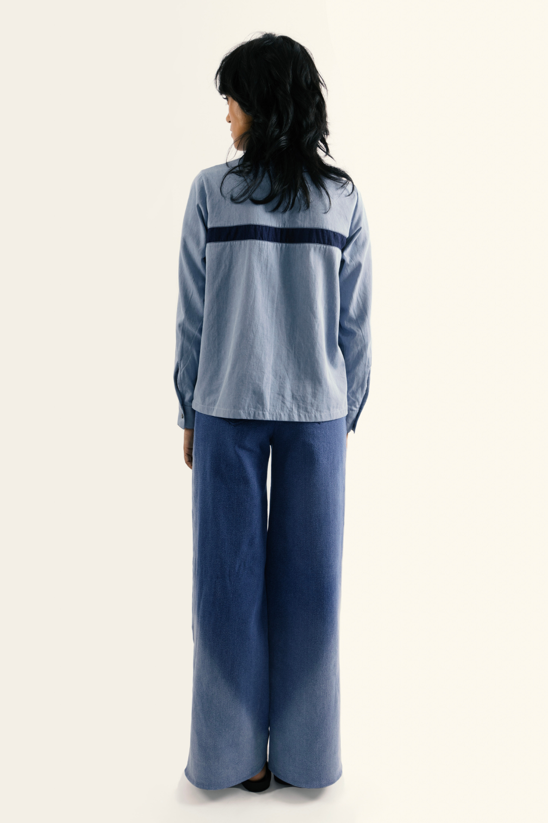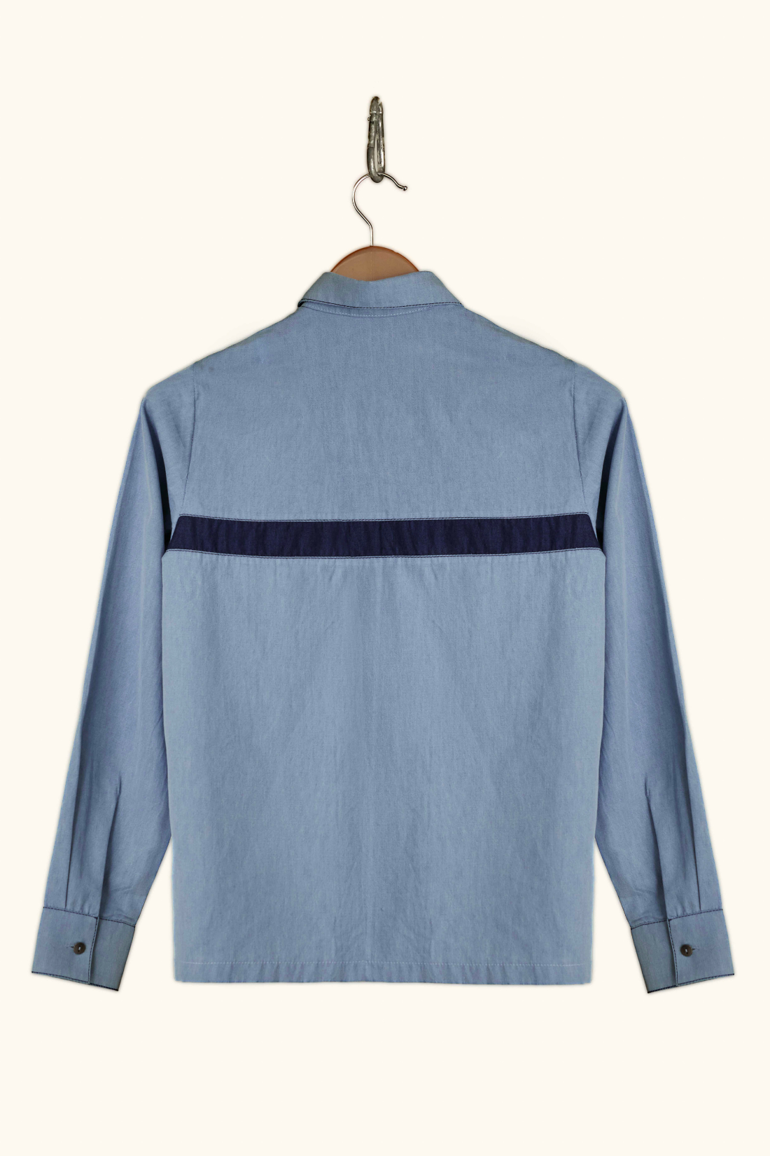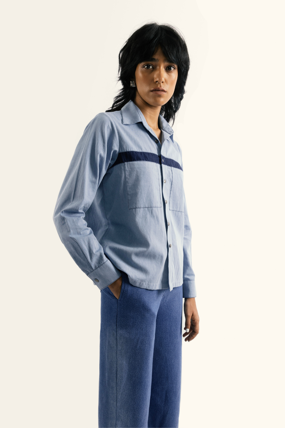 regular shirt collar - contrast panel - front patch pockets - contrast top stitch detail - full sleeve - boxy fit - cropped length