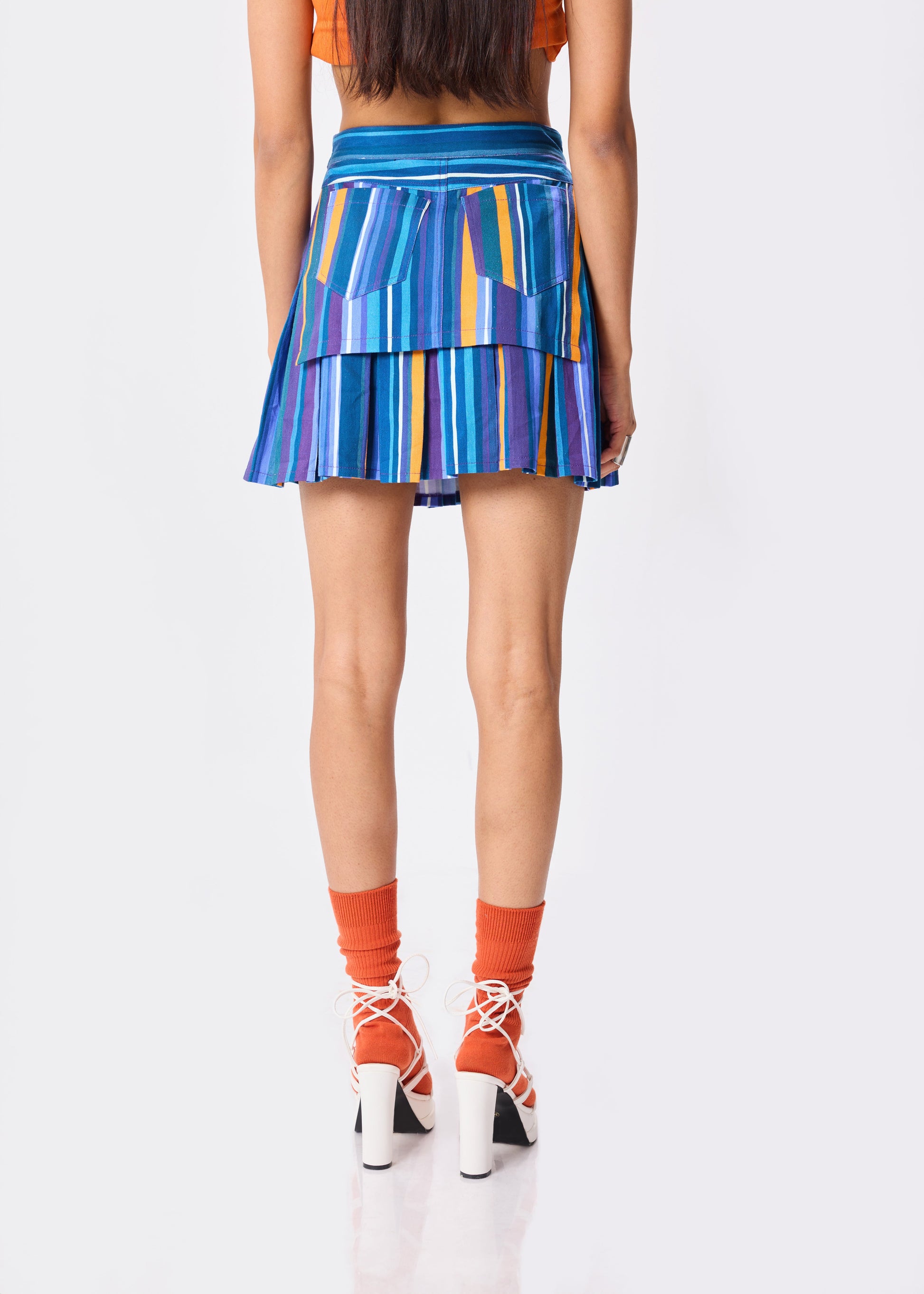 This is not your usual pleated skirt. Our Pleated mini skirt comes with a Thnwhn original stripes print, with flaps at front and back that have pockets, adding to the utility and design of the skirt. Side zipper for ease.