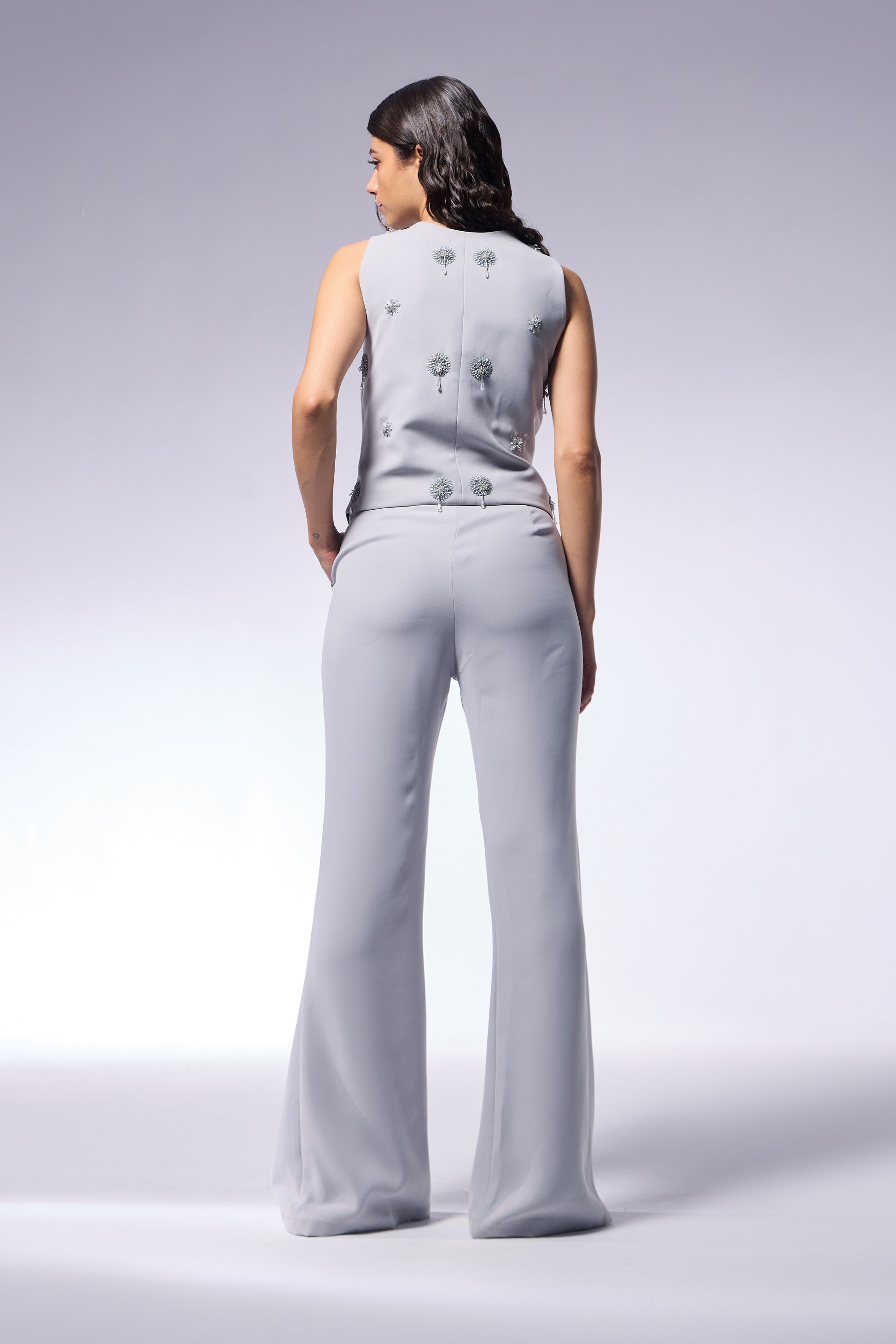 The waistcoat features intricate hand embroidery that adds a luxurious touch, paired with wide bottom pants that create a streamlined silhouette.