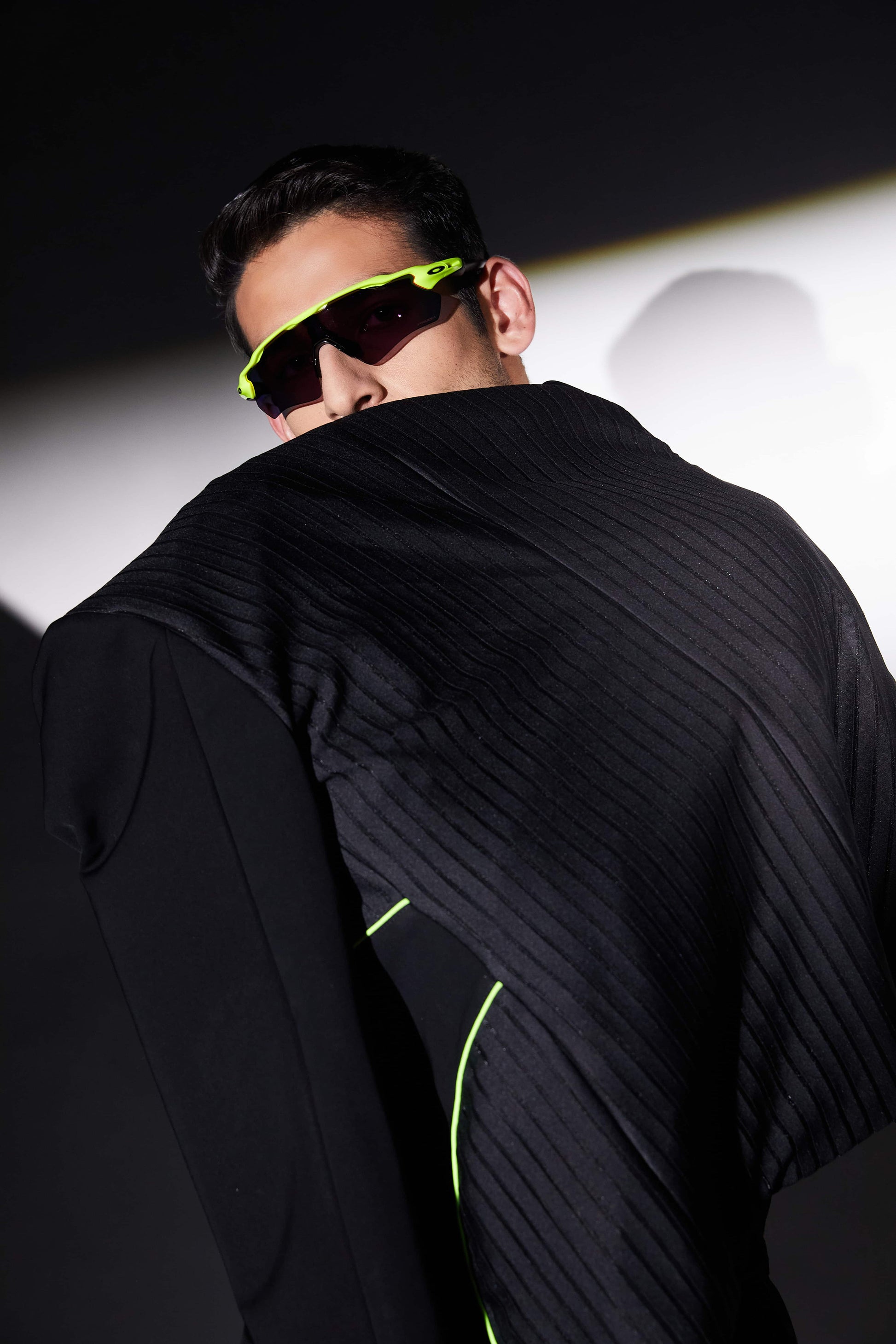Juxtaposed Unisex Blazer featuring a lapel collar with shoulder pads. Detailed with neon piping and front patch pocket. This collection is in collaboration with Muskaan. An NGO for specially abled. 15% of our net profits will be donated for their welfare.