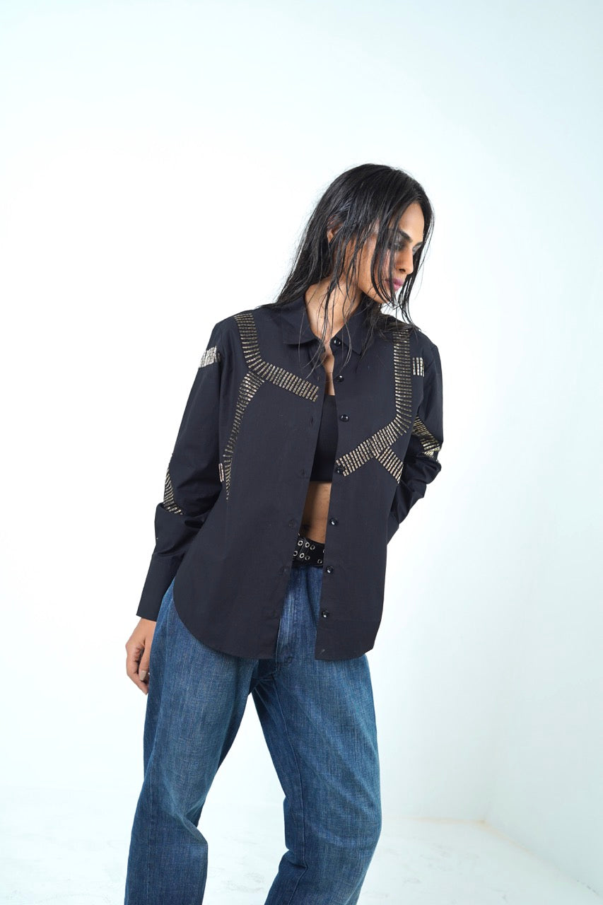 Drape yourself in timeless elegance with this classic black shirt featuring silver and golden embellishments.