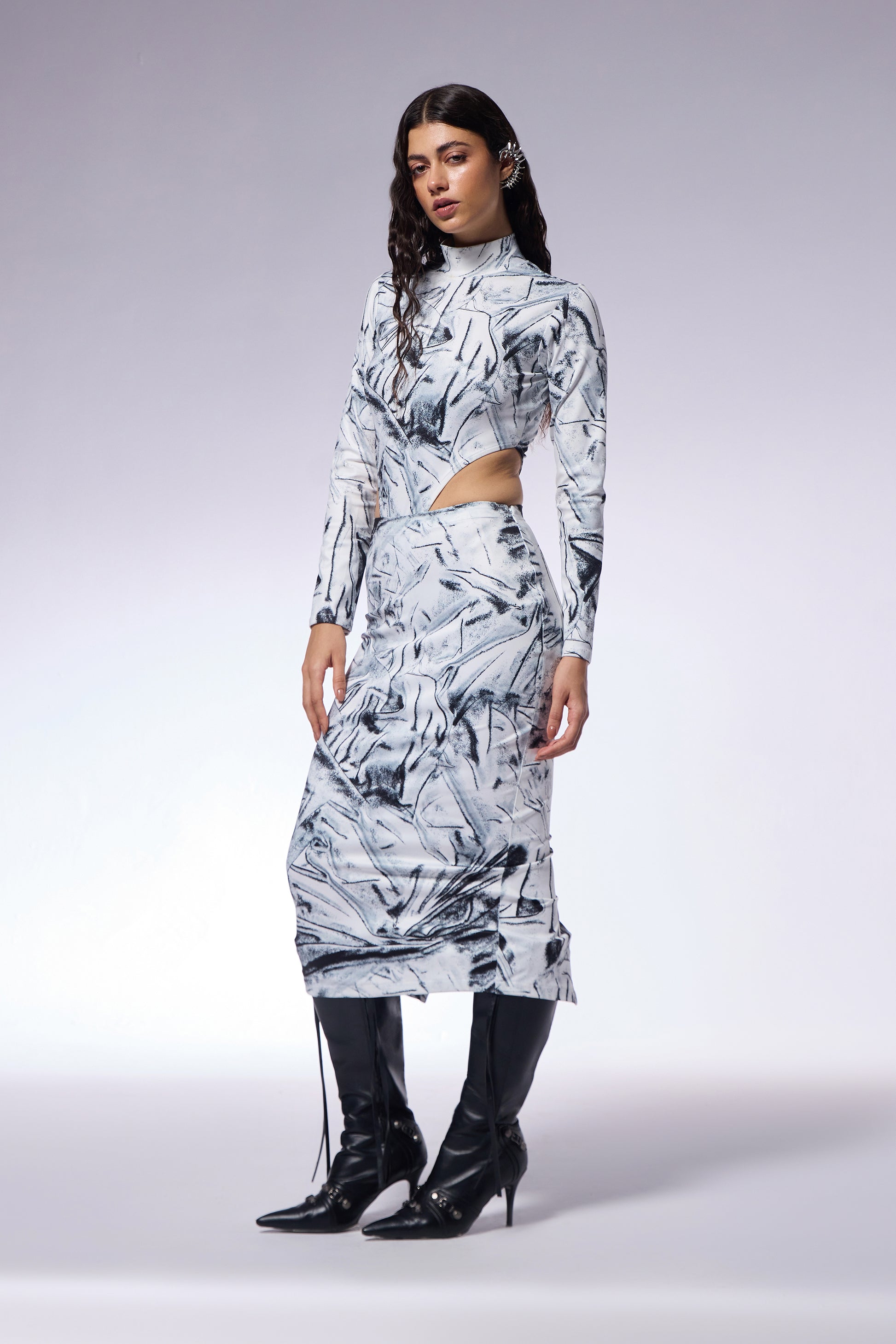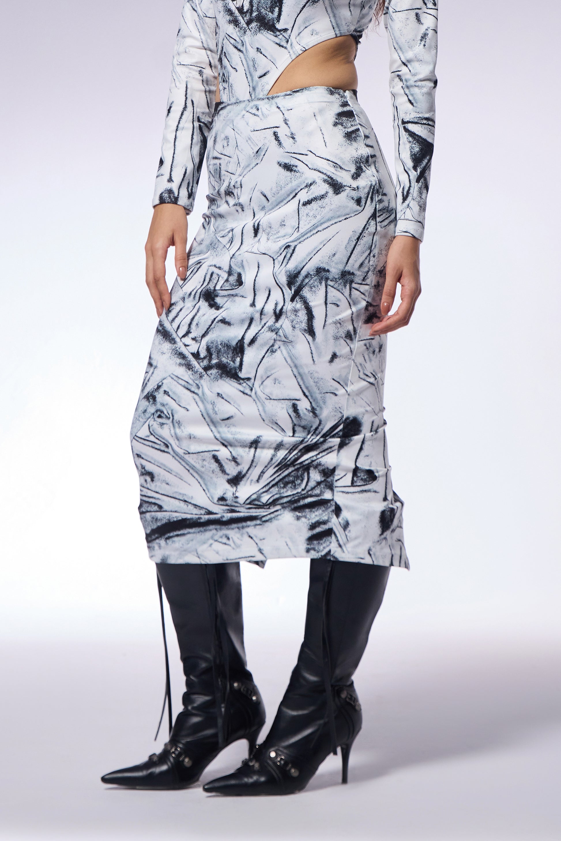 A trompe l'oeil print skirt in a unique crushed paper scanned print.