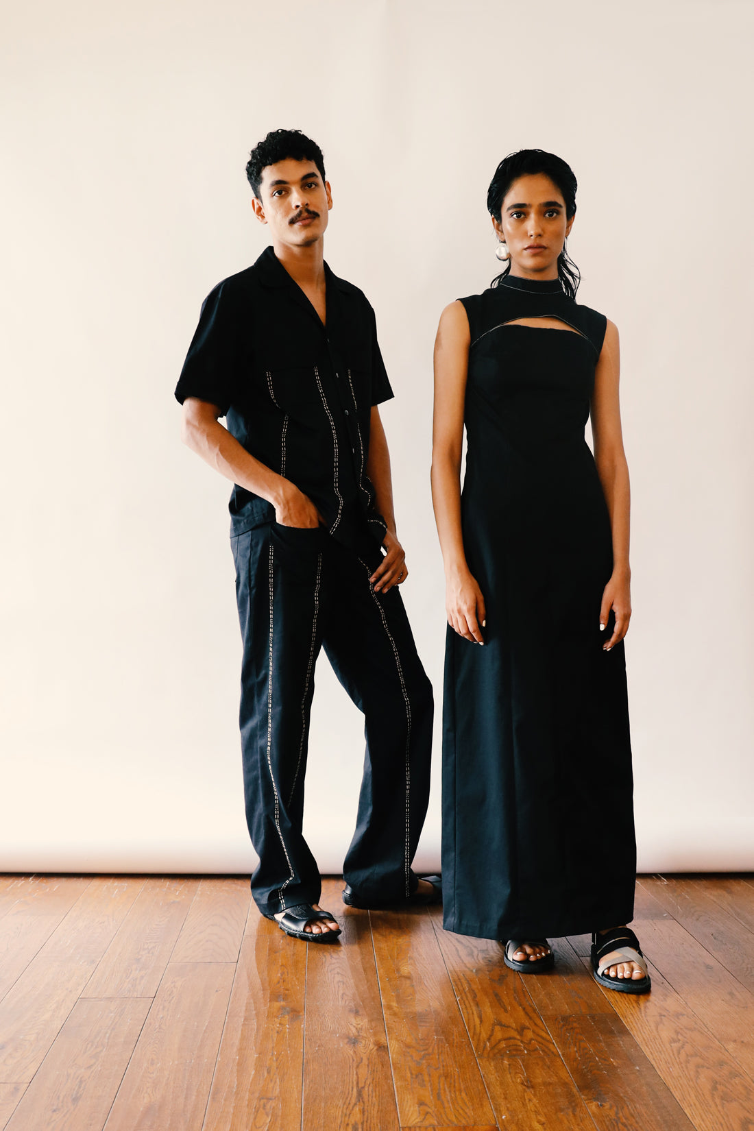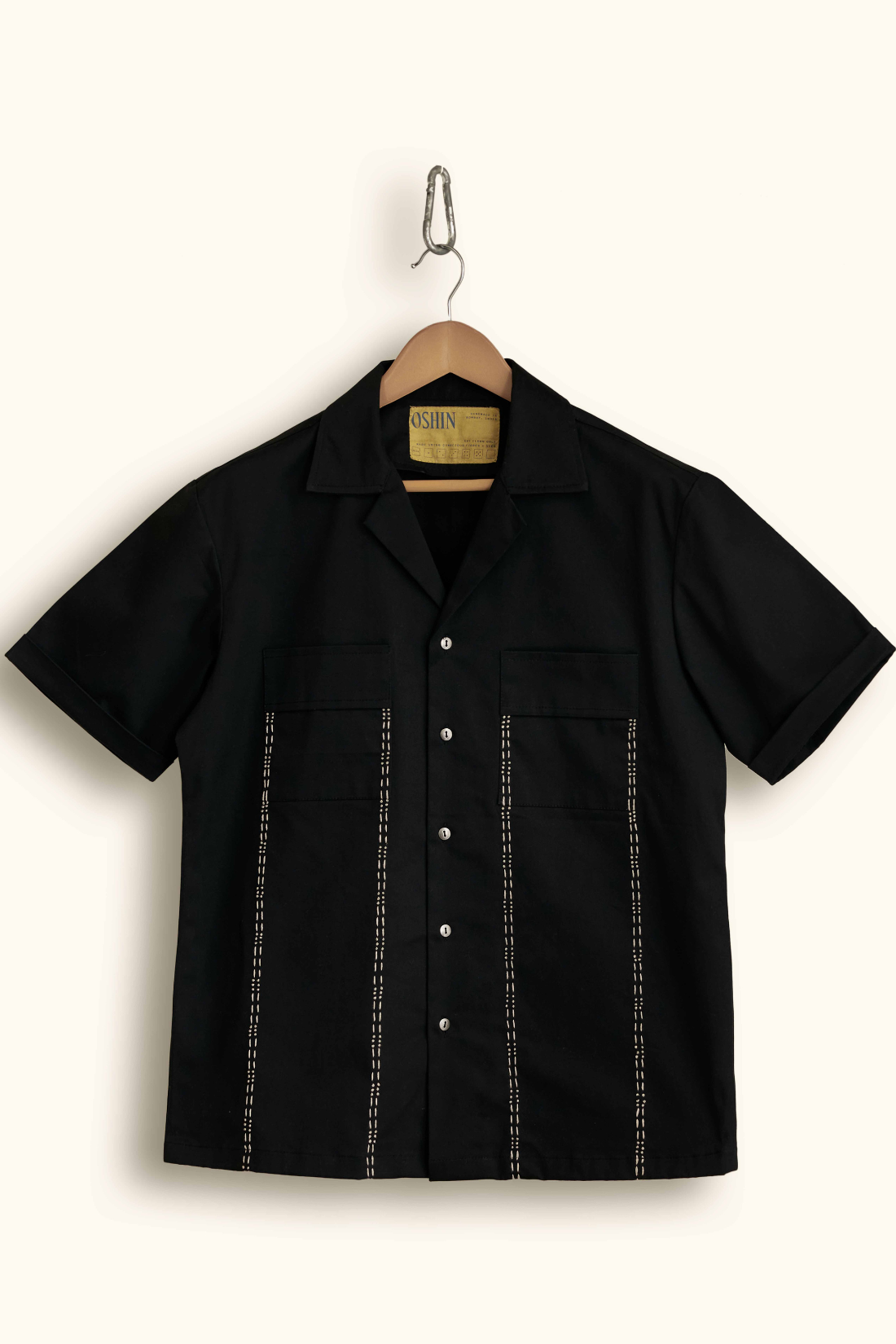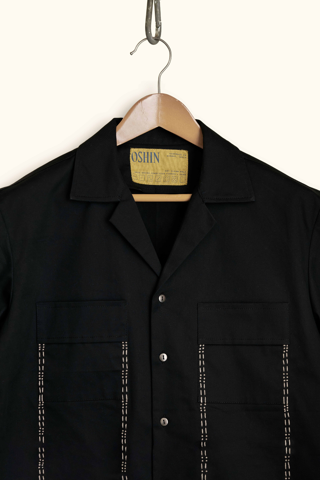 cuban collar - folded sleeve hem - two front patch pockets - cotton thread hand embroidery detail - front button down closure - regular fit