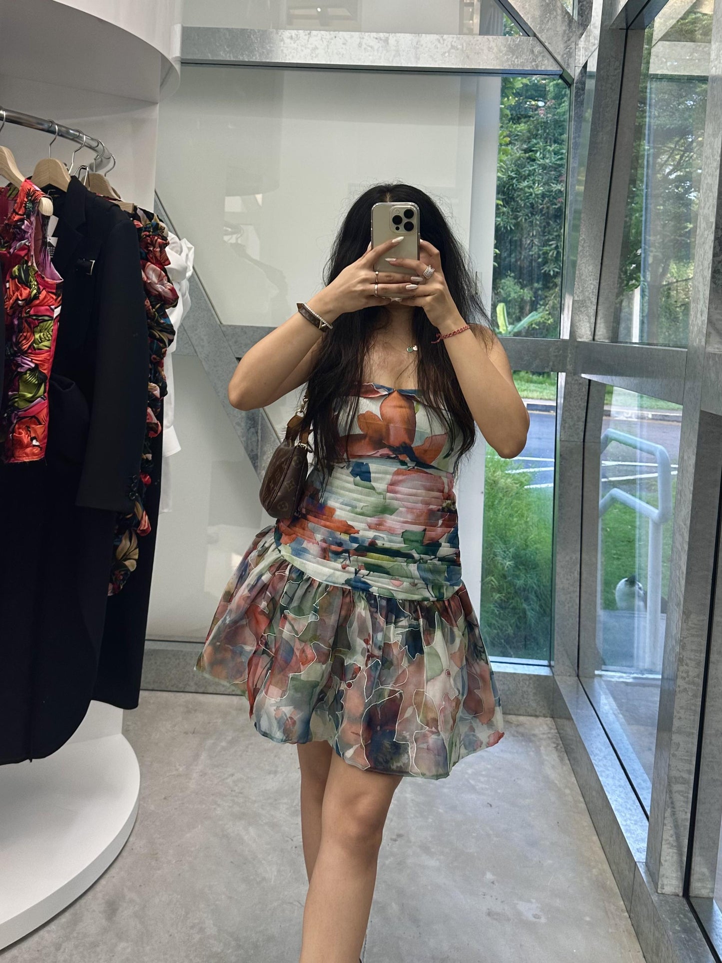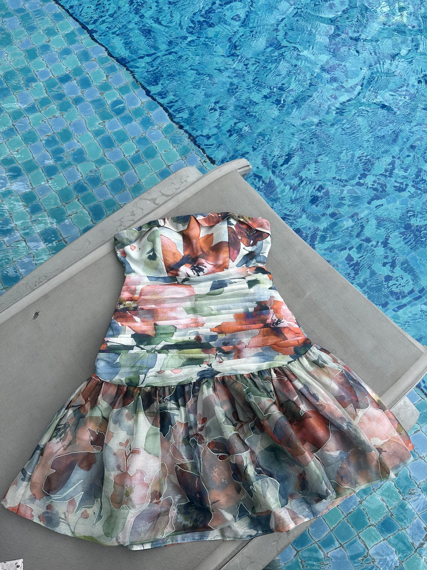 Strapless floral ruched mini dress. Collar detail on neckline. Embroidery detailing. Fluted bodice.