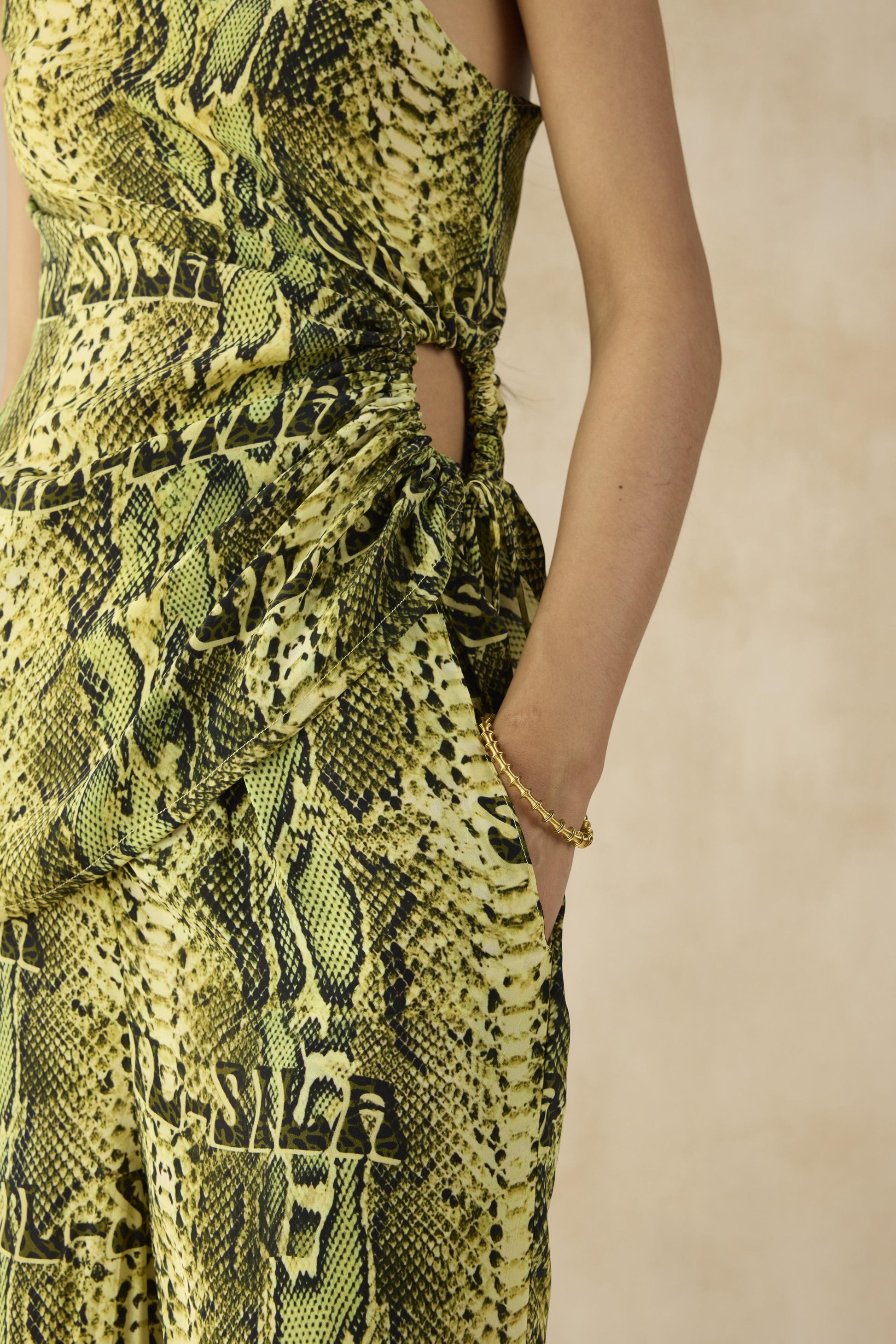 A bold lime-green snake-print co-ord set featuring a one-shoulder draped top with a gathered waist and tie-up detail for a flattering fit. Paired with flowy wide-leg pants, this set offers comfort and effortless style. Made from lightweight, breathable crepe fabric, perfect for both day and evening wear.