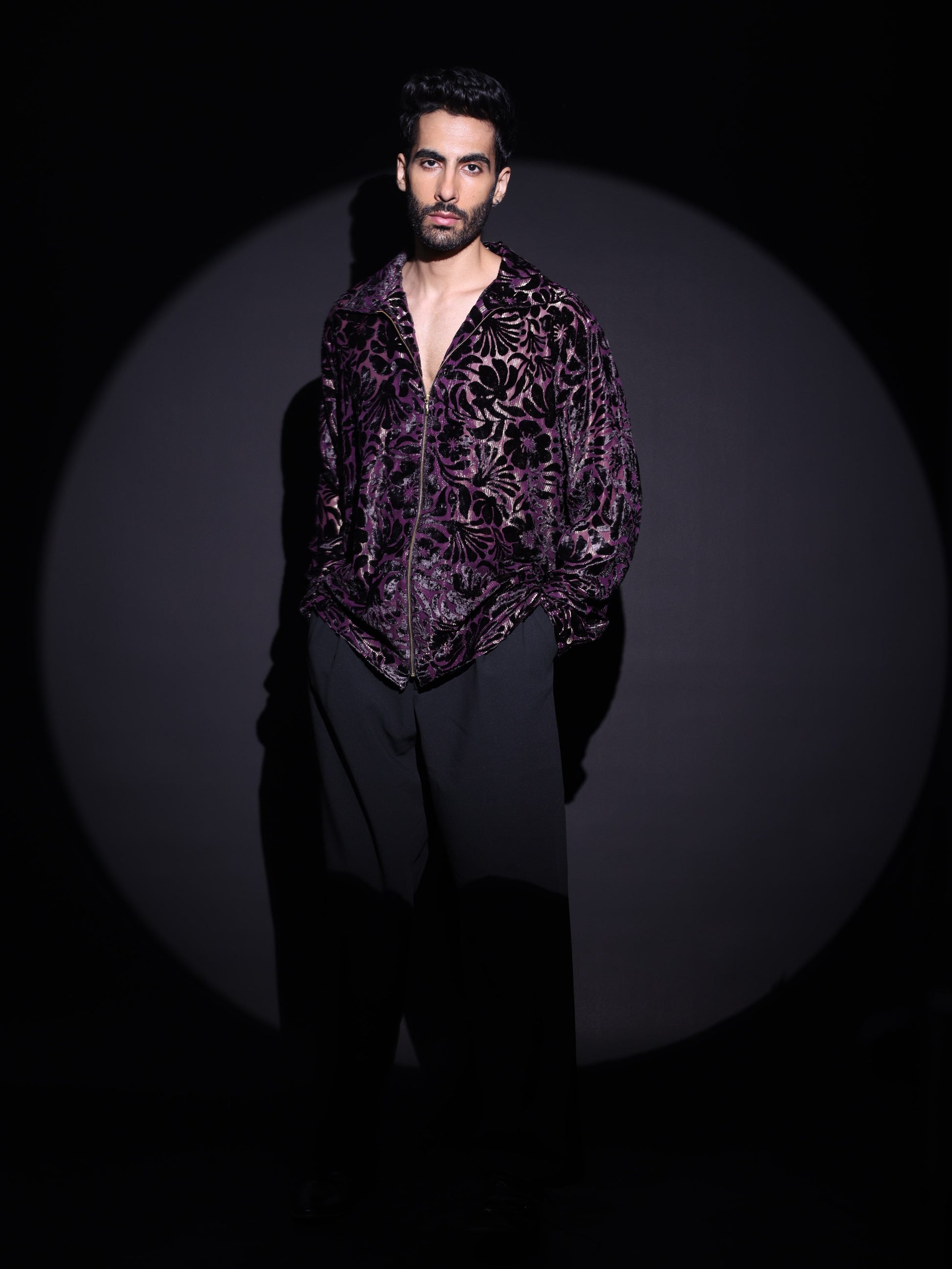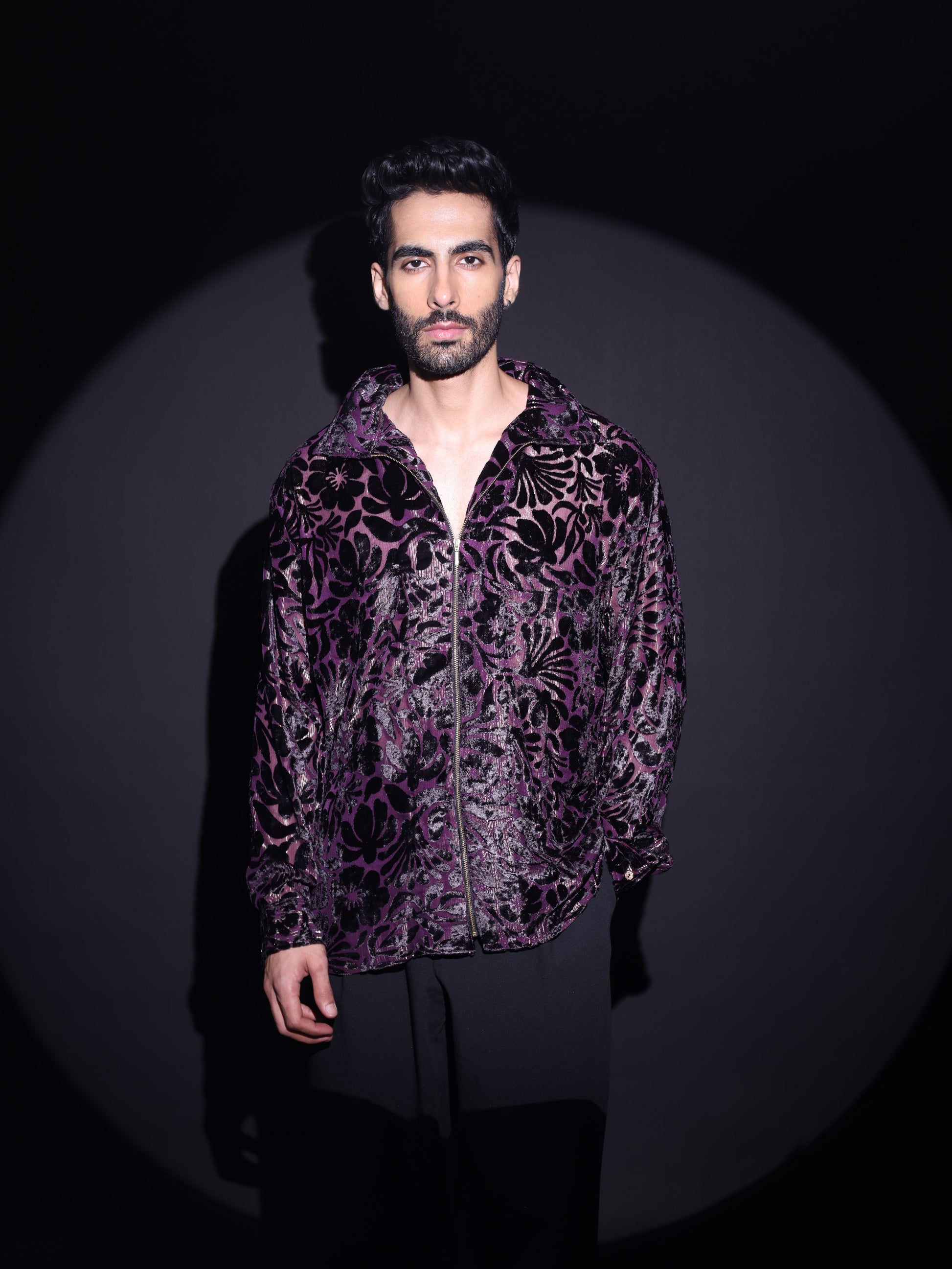 Make a bold statement with our Deep Plum Floral Velvet Zip-Up. Crafted from rich velvet brasso with an intricate floral pattern, this shirt plays with light and texture to create a striking visual impact. The deep plum hue adds a layer of sophistication, while the relaxed silhouette and zip-front closure bring effortless versatility. Perfect for after-dark events, statement styling, or elevated casual looks.