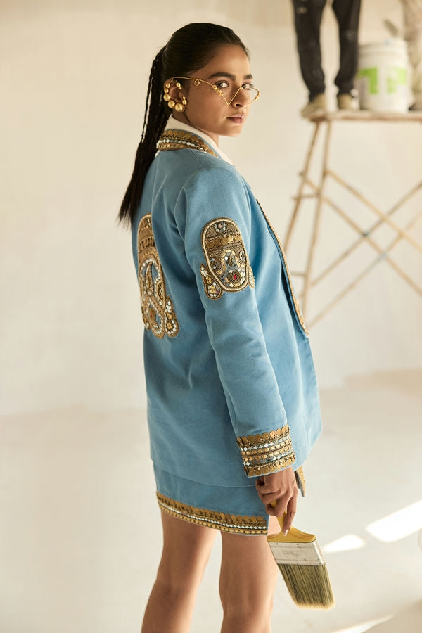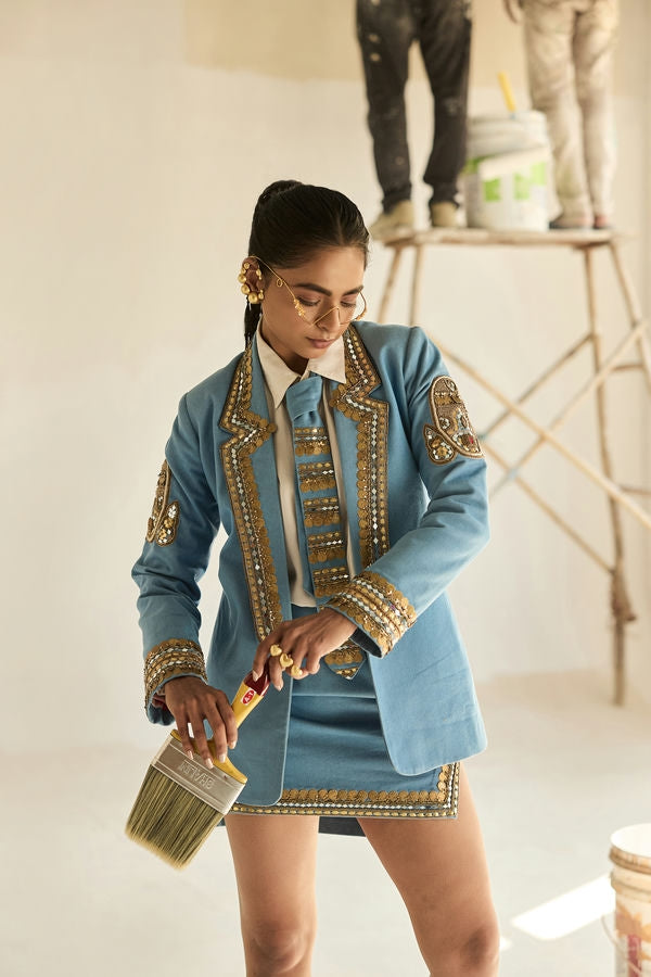 A trendy blue denim blazer with a white modal satin shirt, denim tie, and denim skirt for a chic festive look.