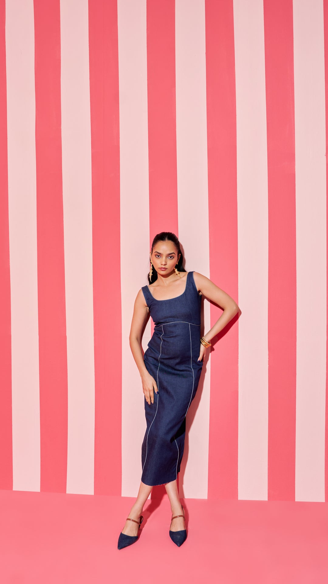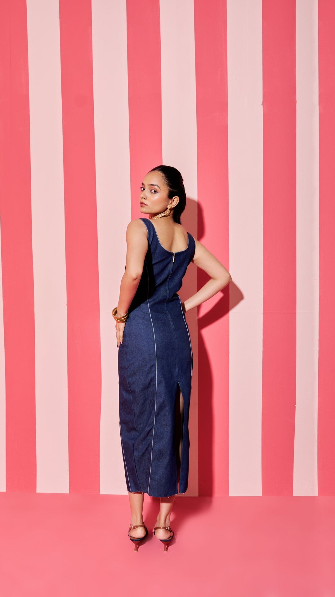- Midi Denim dress with a straight-cut neckline and contrasting piping detail. Invisible zip fastening and a back slit at the hem