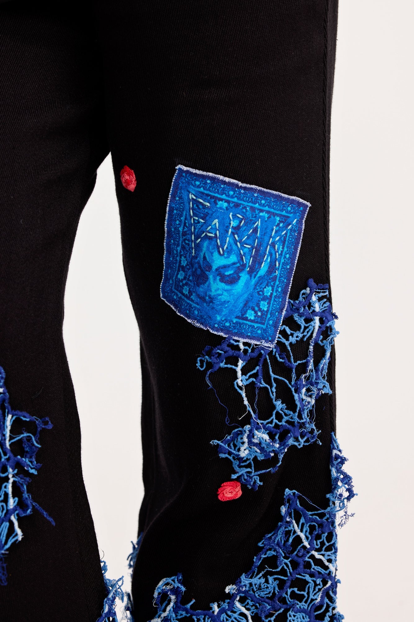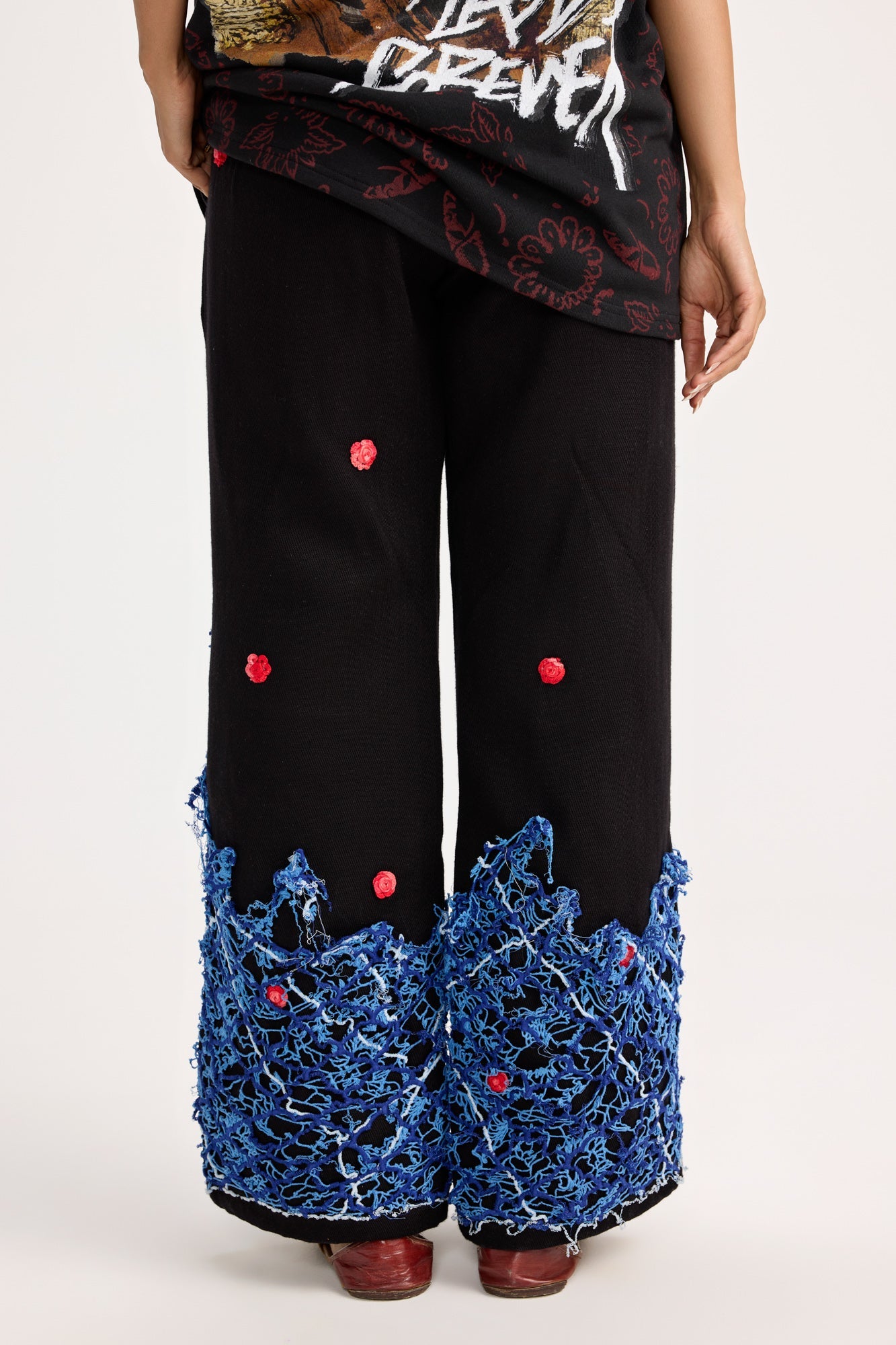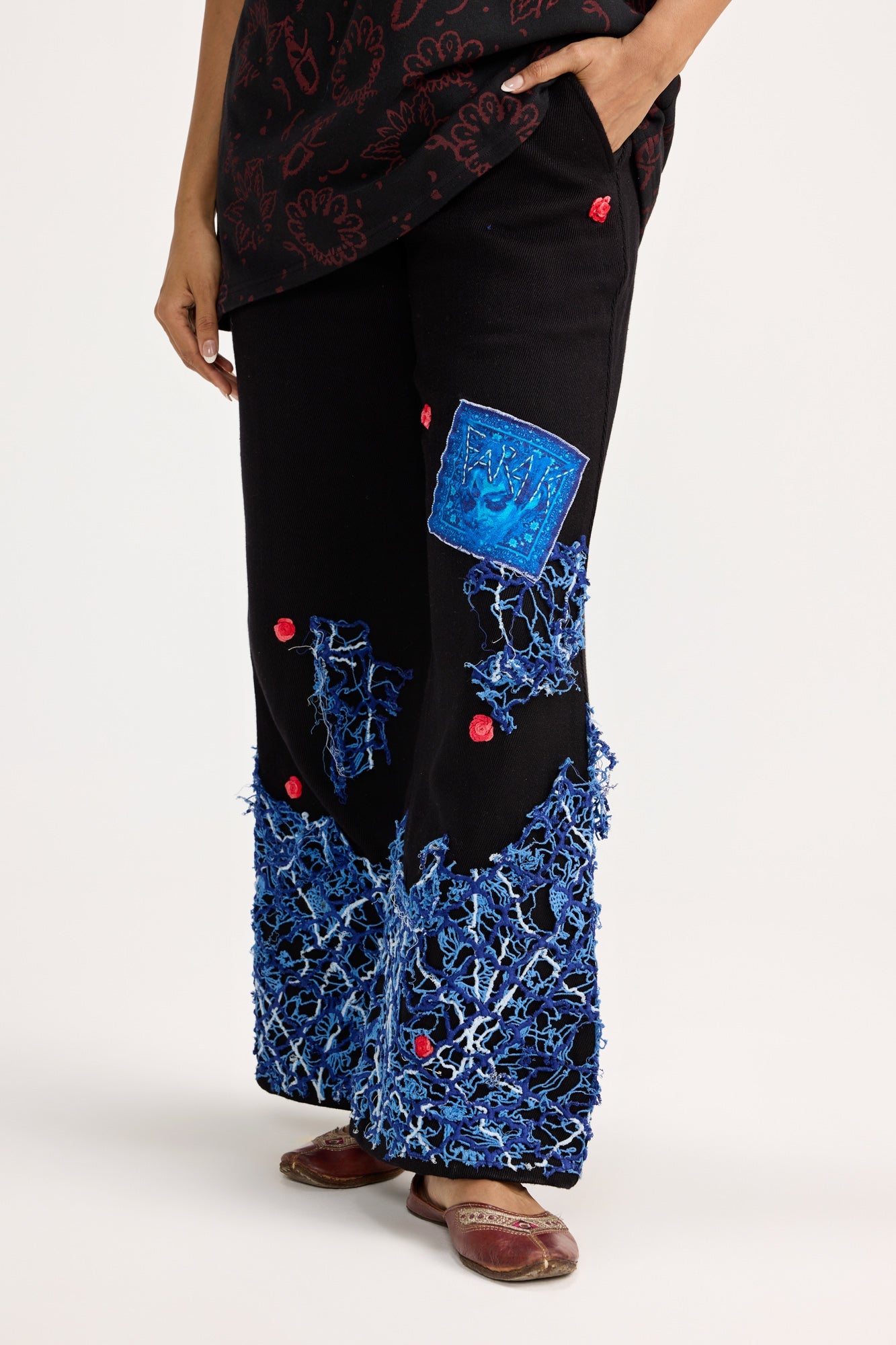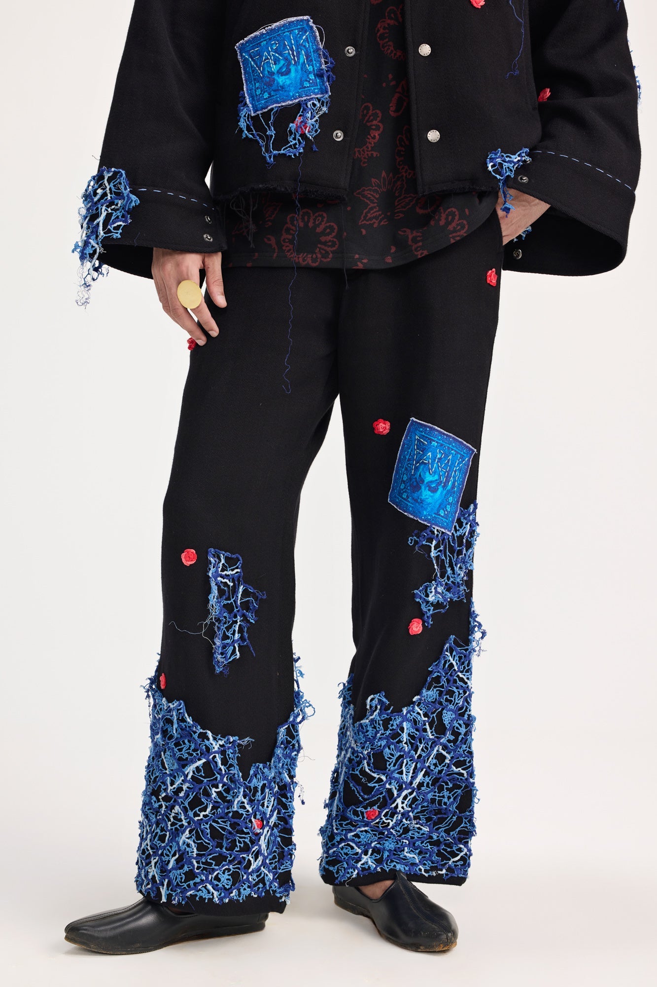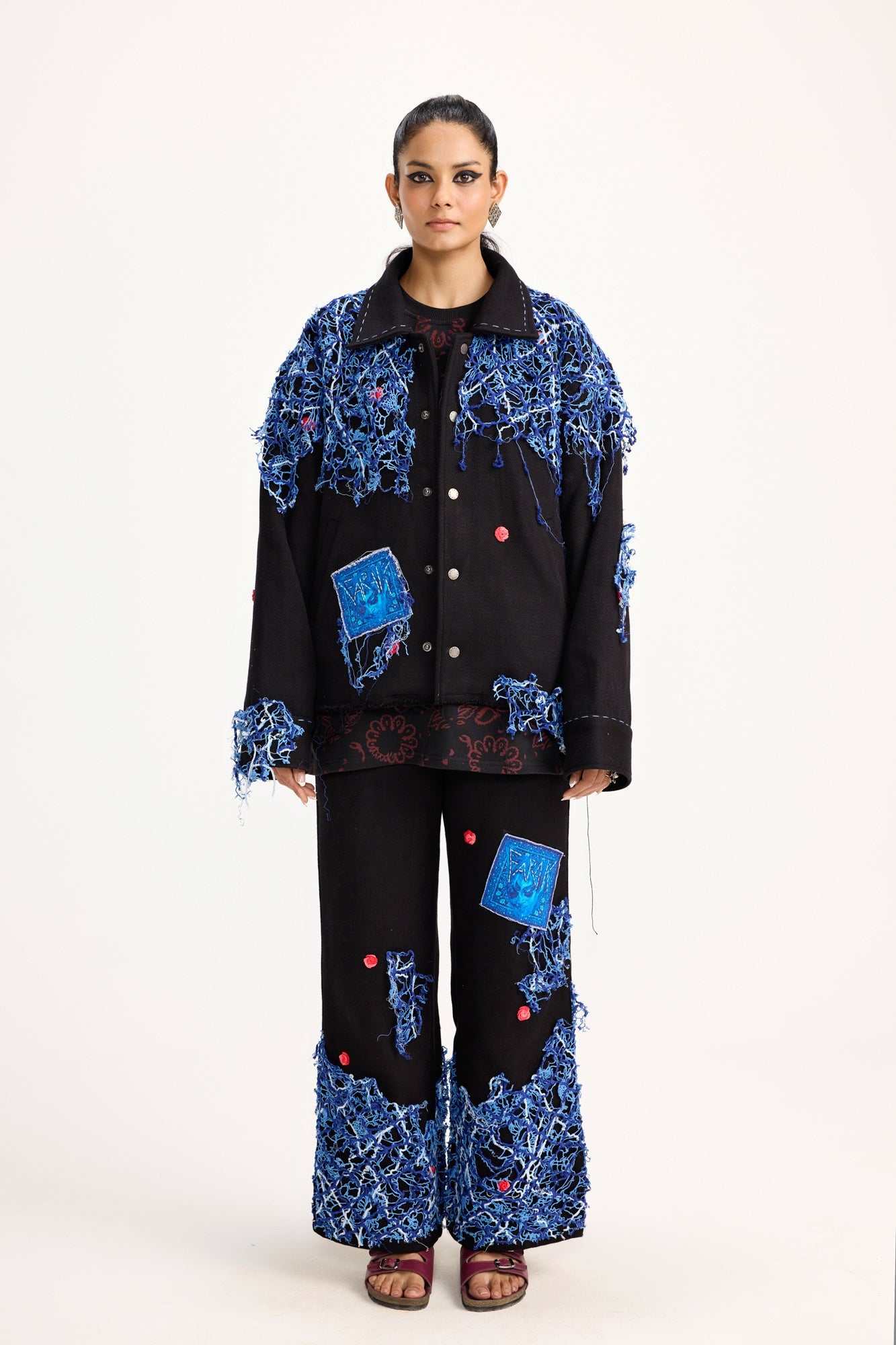 This entirely handmade piece is a delicate juxtaposition of love’s outward beauty and the inner chaos of emotions. Crafted with intricate metal buttons and tags, it mirrors the tangled thoughts and dilemmas one faces in the journey of love. The handwoven fabric by fourth-generation artisan Pramod ji serves as a canvas for this emotional narrative, with free edges and artistic detailing that evoke a sense of turmoil beneath the surface. Though adorned with soft floral elements, the design subtly hints at the storm brewing within—a chaotic dance of feelings that is as raw as it is beautiful. The blue tones and handcrafted flourishes capture the unpredictability of love, making this shirt not just an artistic garment but a wearable expression of emotional complexity.
