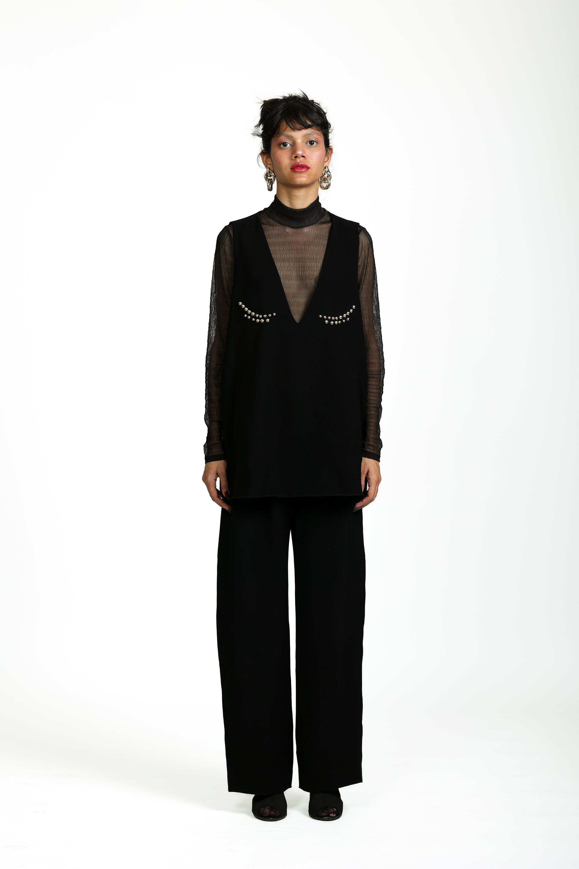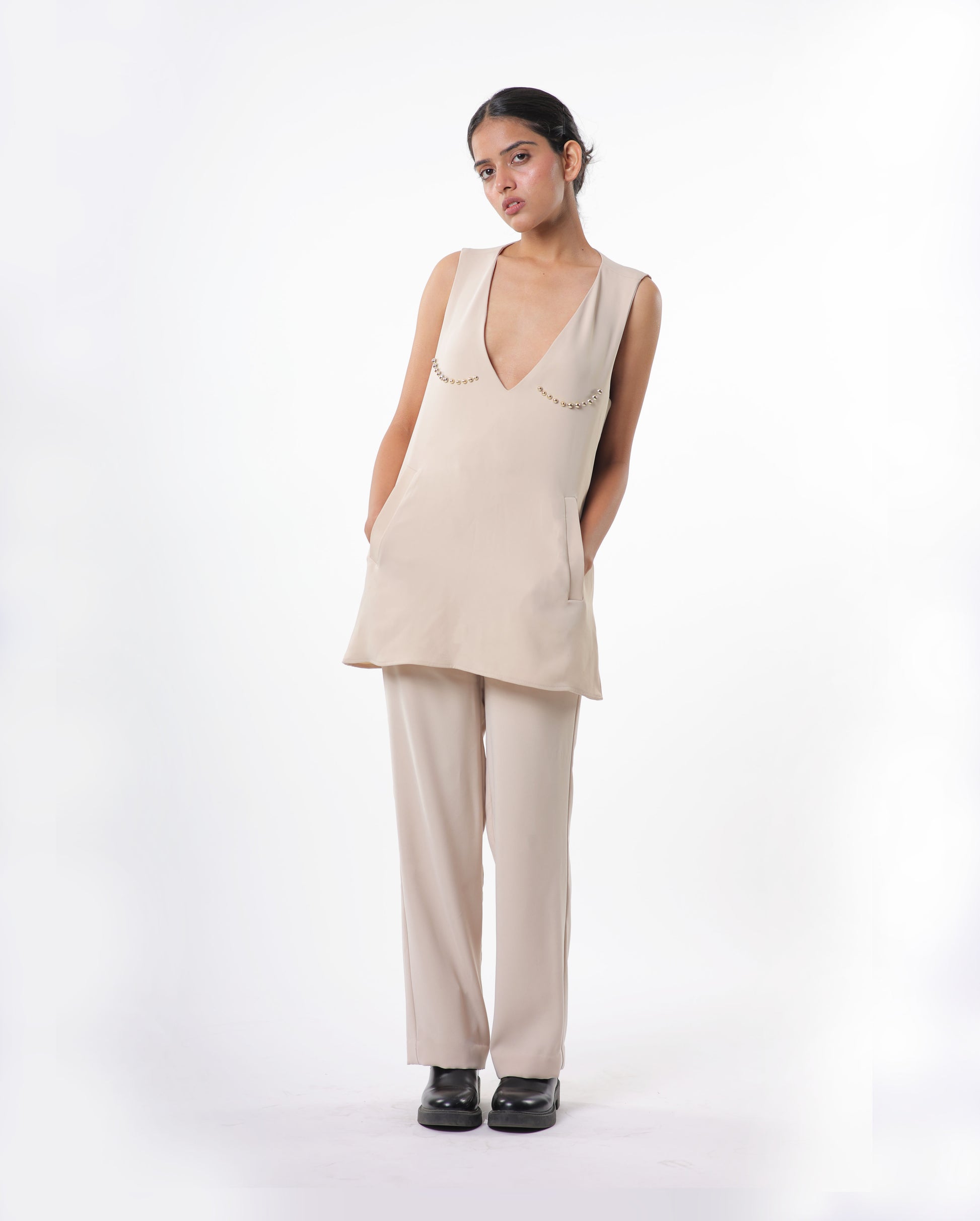 Sleeveless A line top, which can be worn as a dress or with pants. It is ornamented with gold beads just around the chest area.