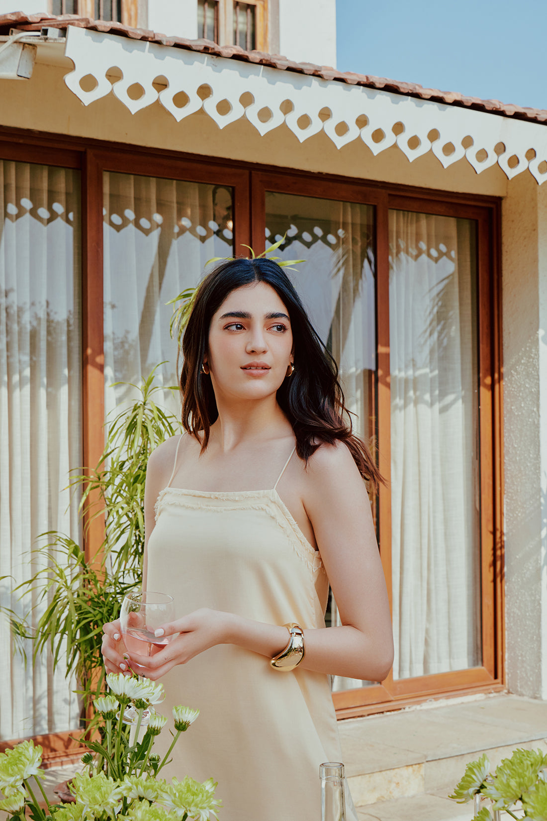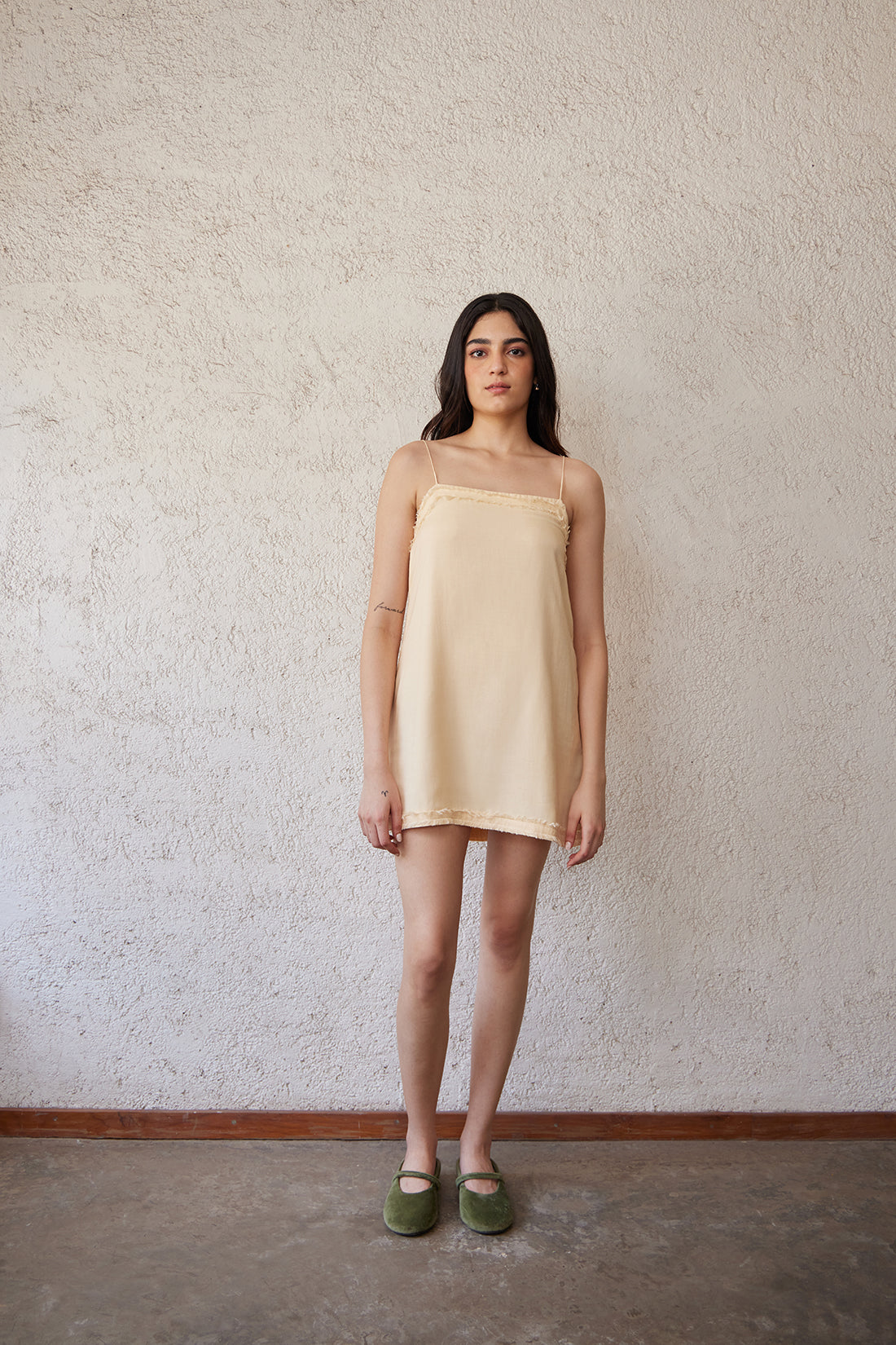 square neck - strap sleeve - fabric scrap fray border - lined - straight fit