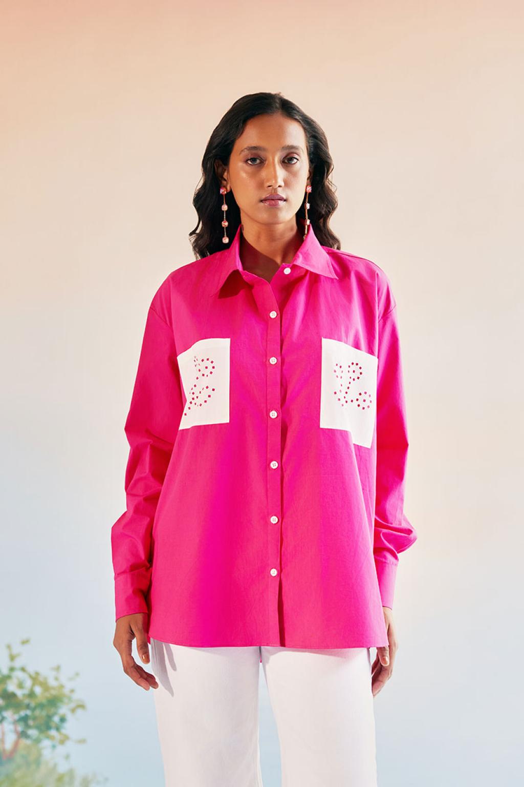 pocket adorned with intricate flower cut details. In a delightful summer pink hue, this shirt exudes freshness and vitality, perfect for the season.