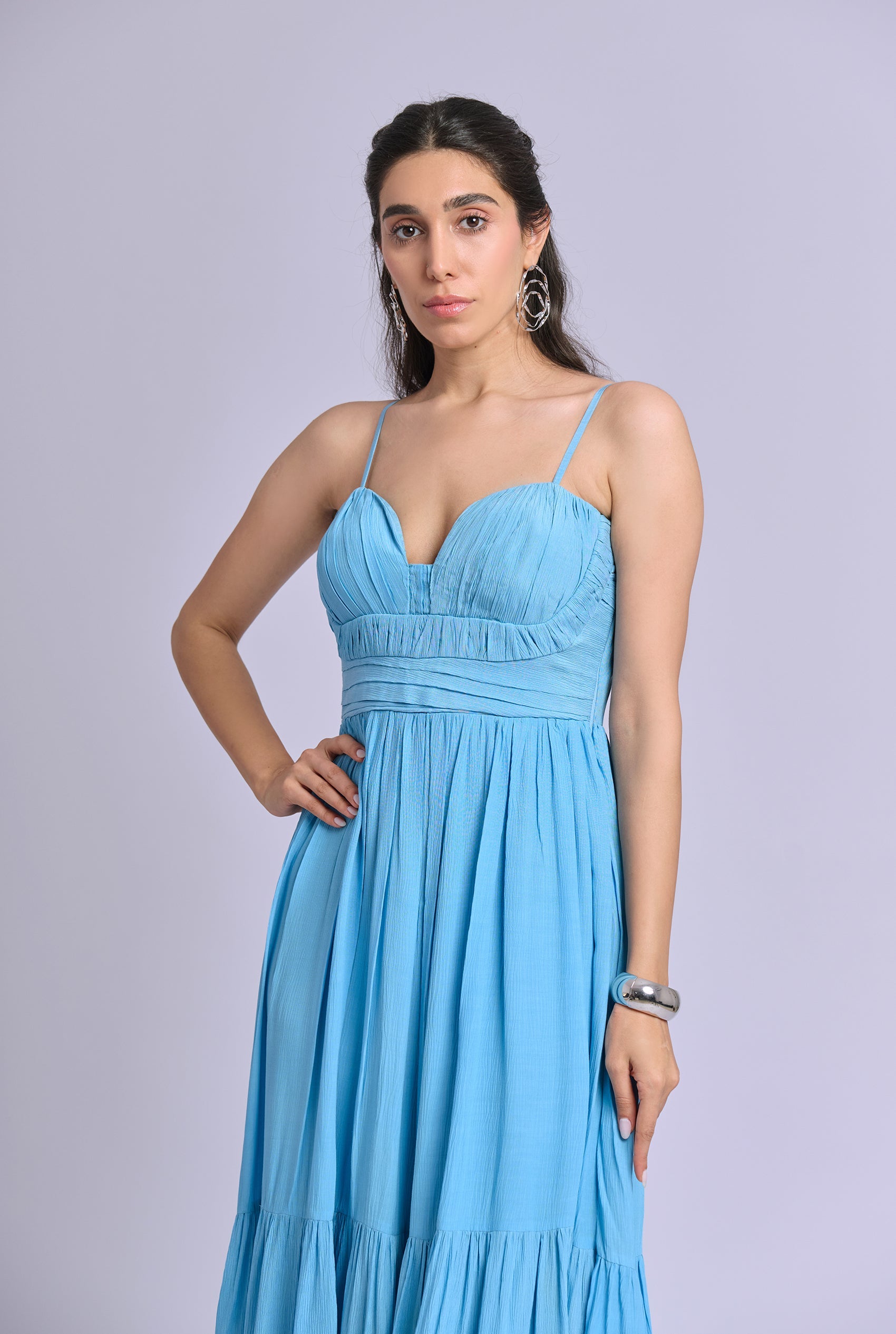 Elara Blue Strappy Pleated Flowy Maxi Dress
