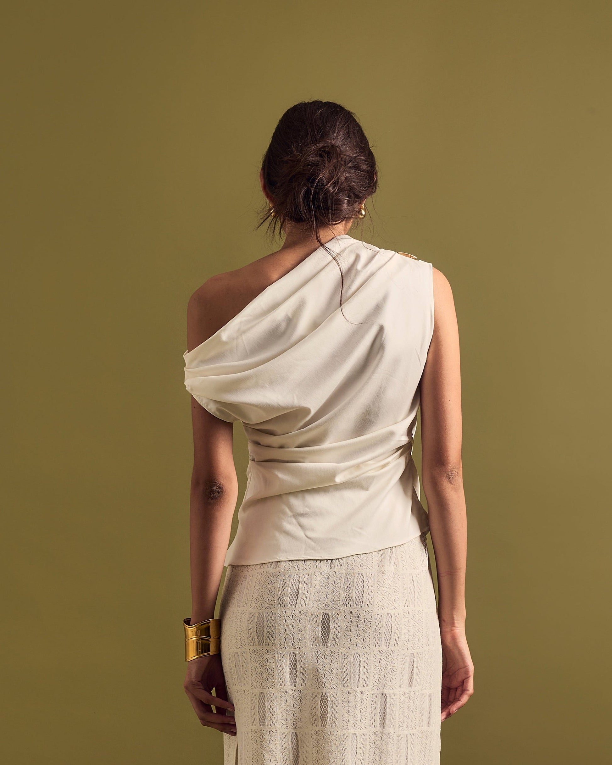The Elara Top features a softly draped silhouette with an off-shoulder neckline, held by a striking buckle detail. Its asymmetry and fluid form celebrate individuality and poised femininity, perfect for transitional dressing rooted in strength and subtlety.
