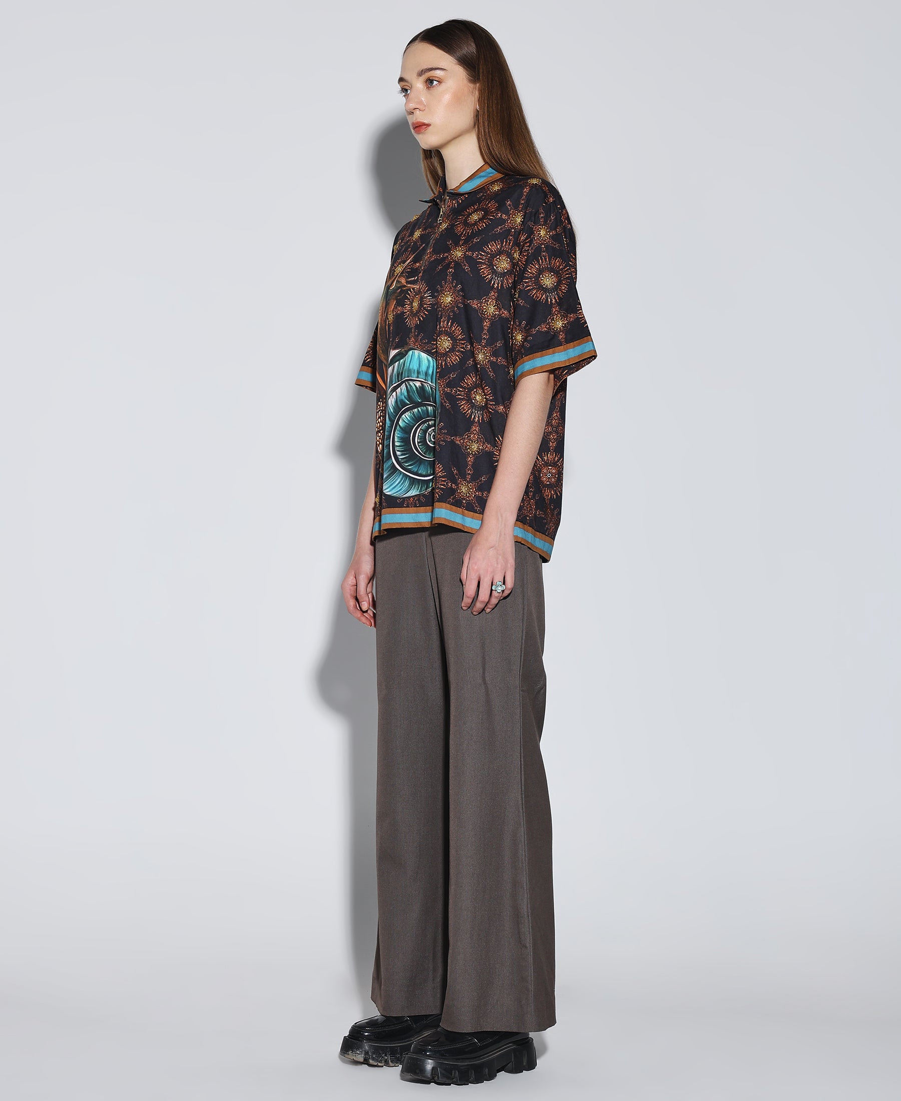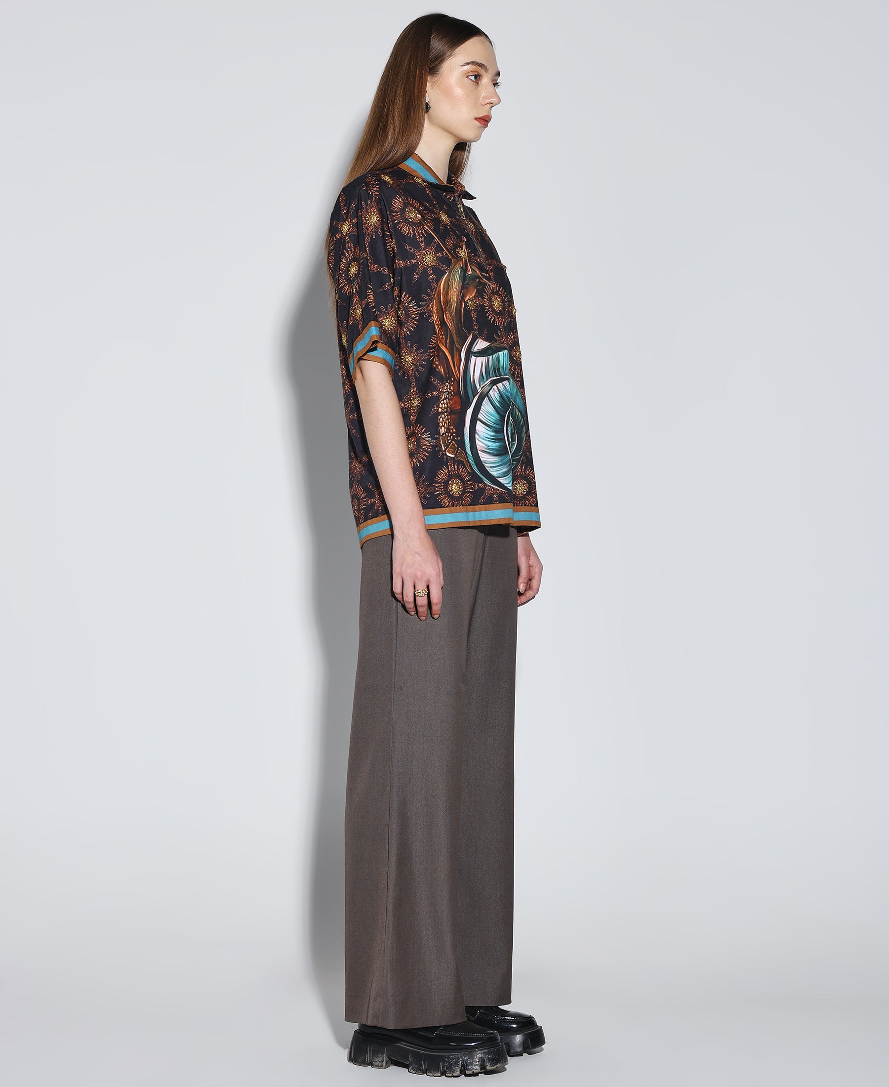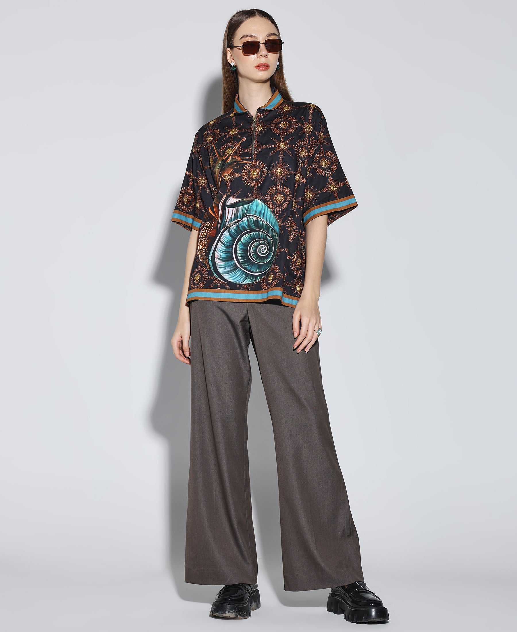 Digitally printed shirt featuring a snail abstract highlighted with 3D brass embellishments fastened with a gold metallic zipper. Fit is relaxed.
