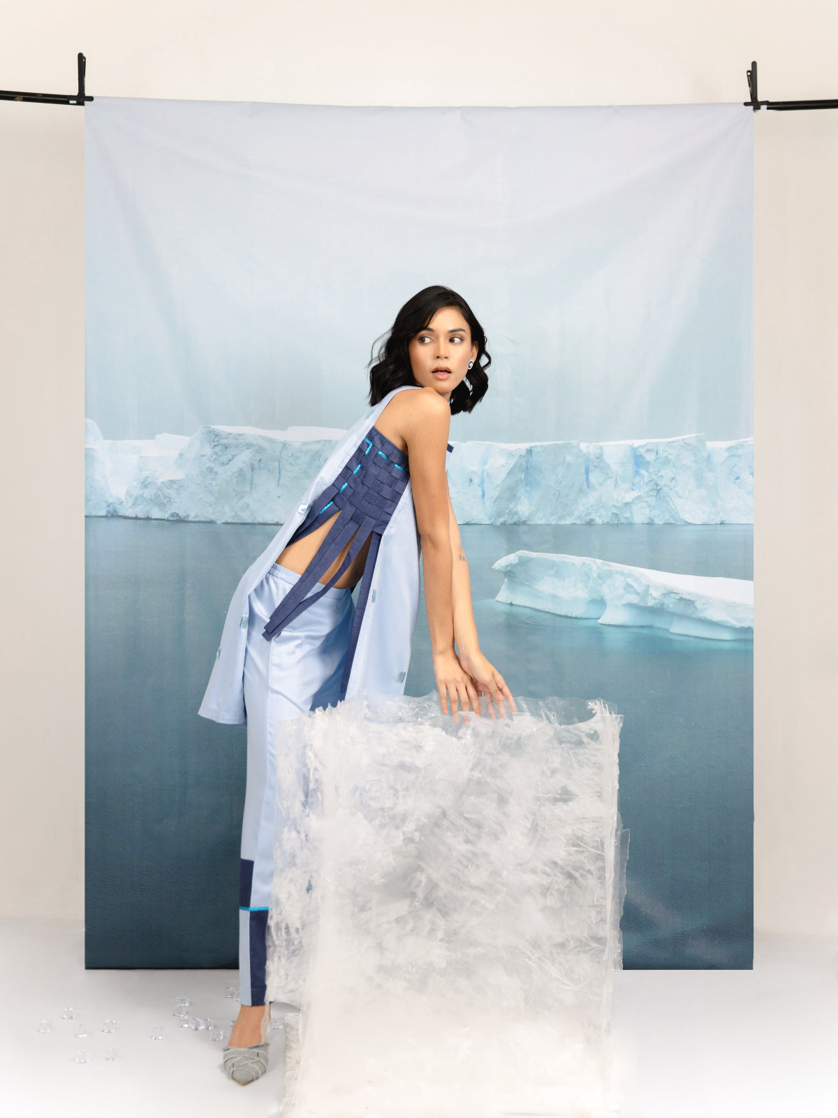 Make a bold statement with our sleeveless long top which has a high-low hem, contrast weaving detail with loose hanging fringes and high waist straight pants, featuring a stylish color block design.