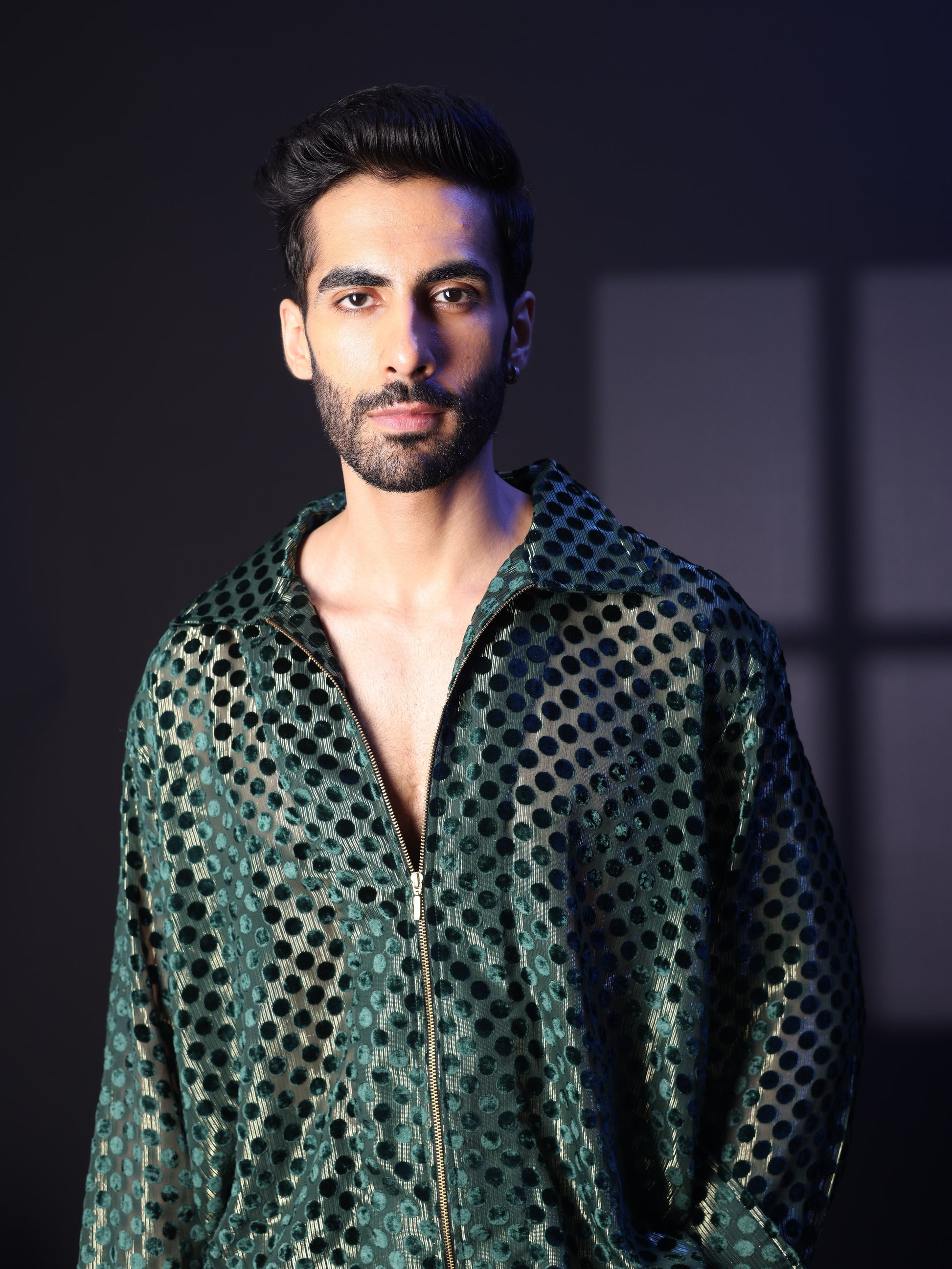 Elevate your evening style with our deep green polka-dot zip-up jacket, crafted in a luxe velvet brasso fabric. The translucent texture and striking circular cutwork create a bold interplay of light and shadow, making it an ideal statement piece for night outs, parties, or high-fashion edits. Featuring a relaxed silhouette with a zip-front closure, this shacket effortlessly blends contemporary flair with a touch of retro charm.
