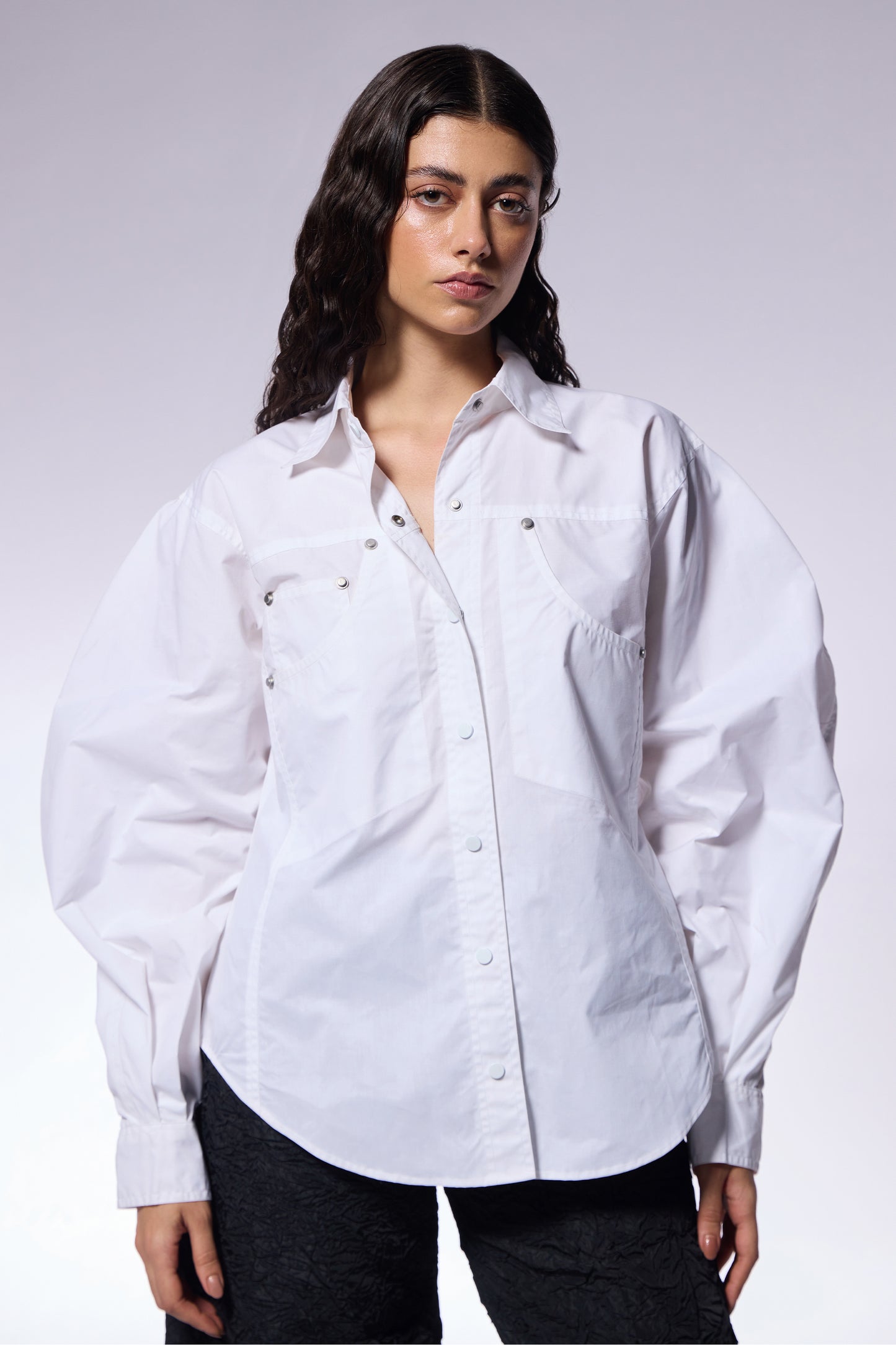 This crisp white poplin shirt features structured denim-style pockets on the front, this shirt blends casual appeal with refined detailing.