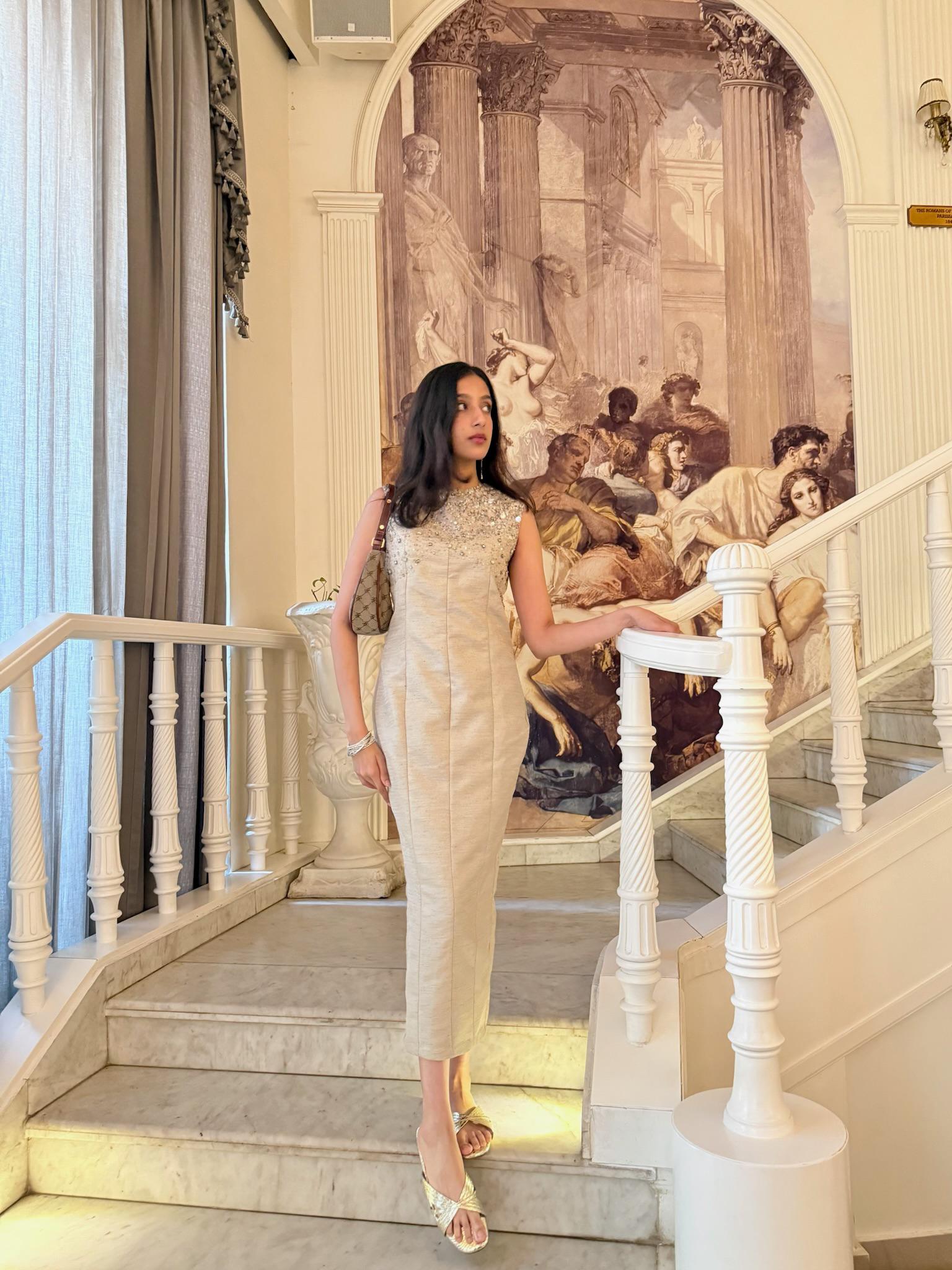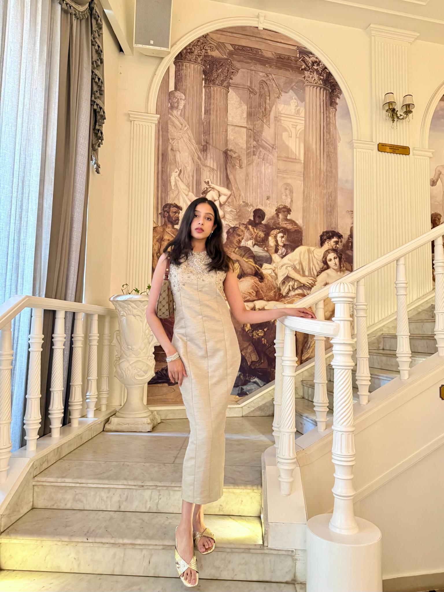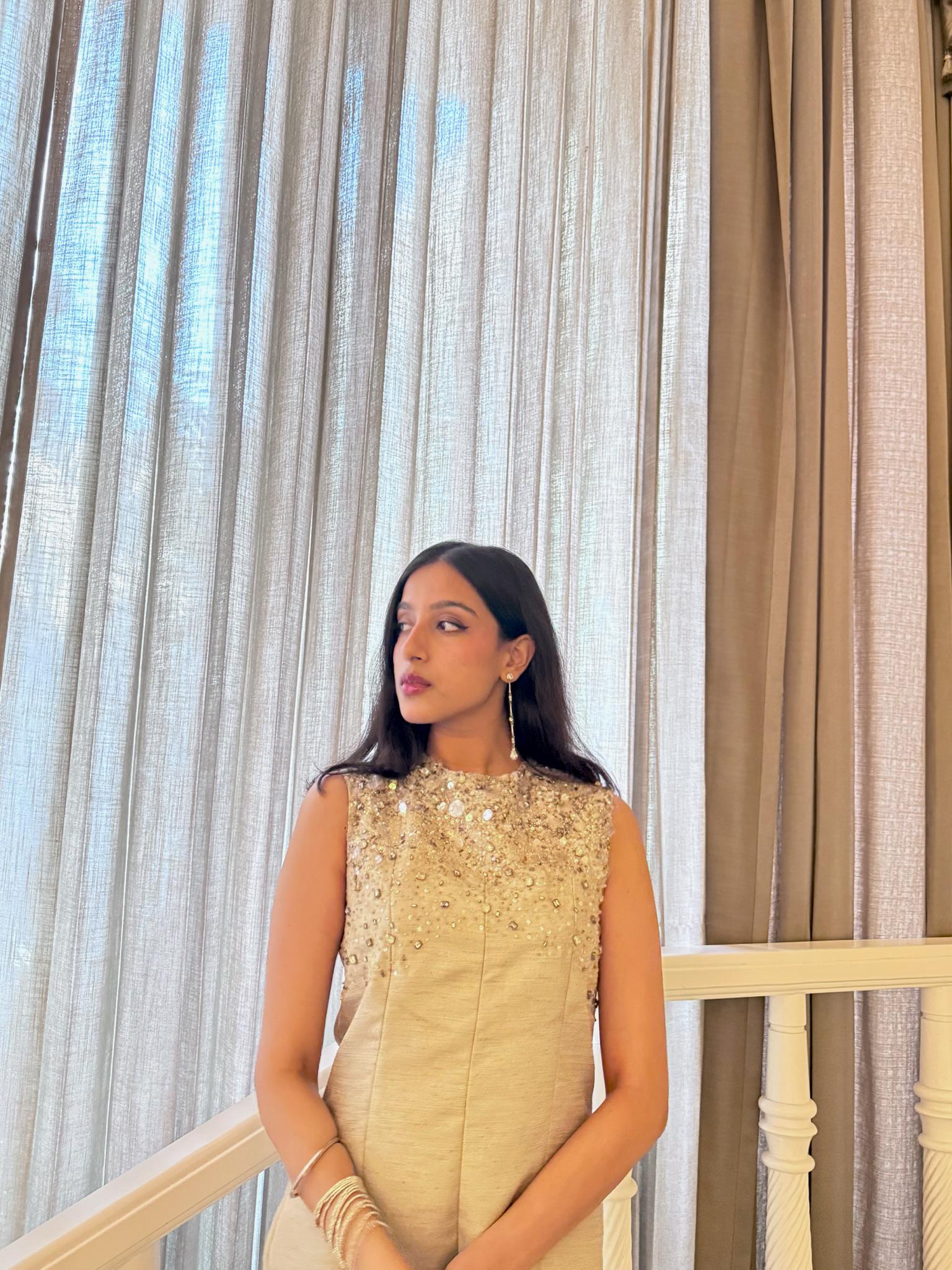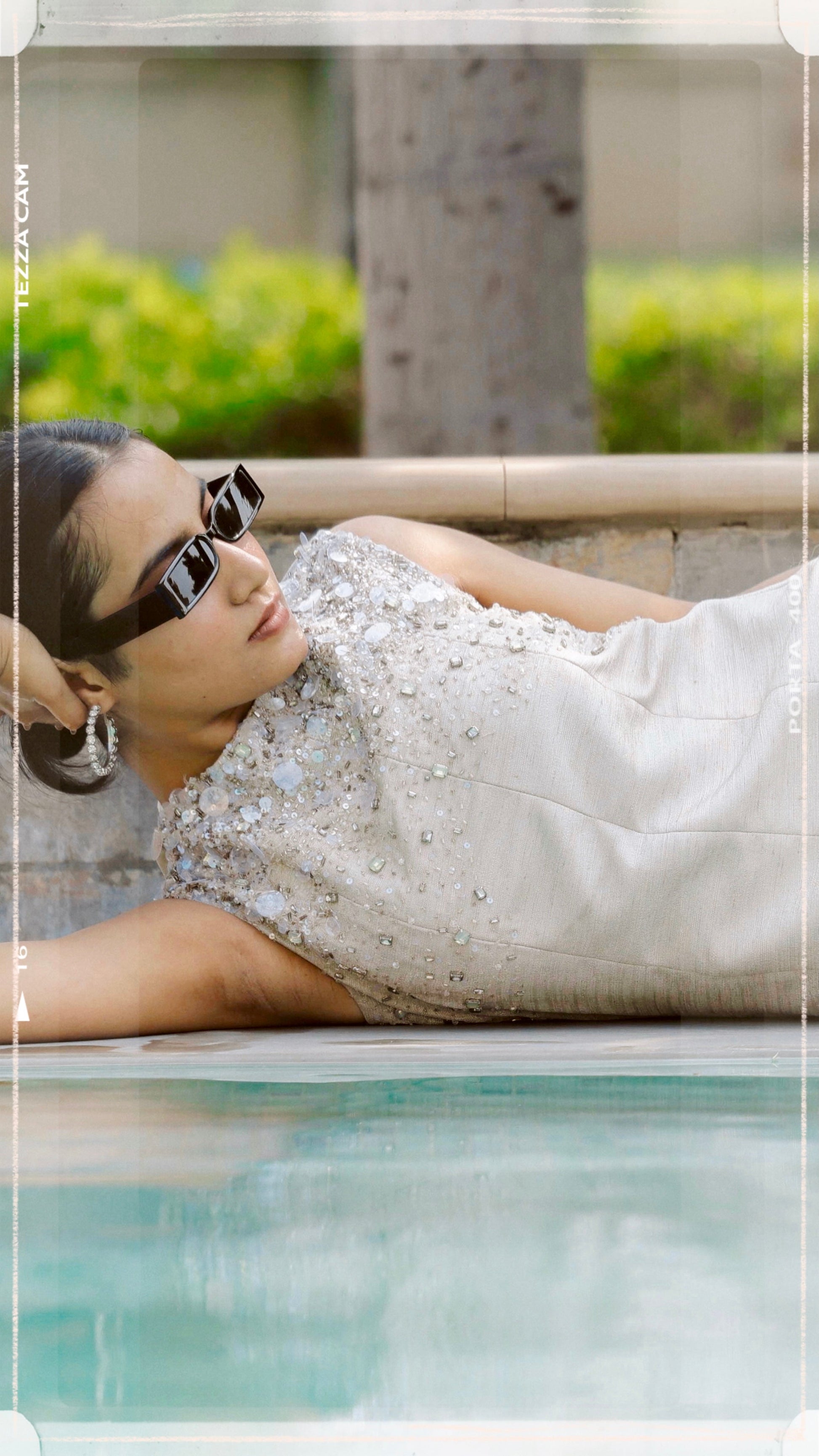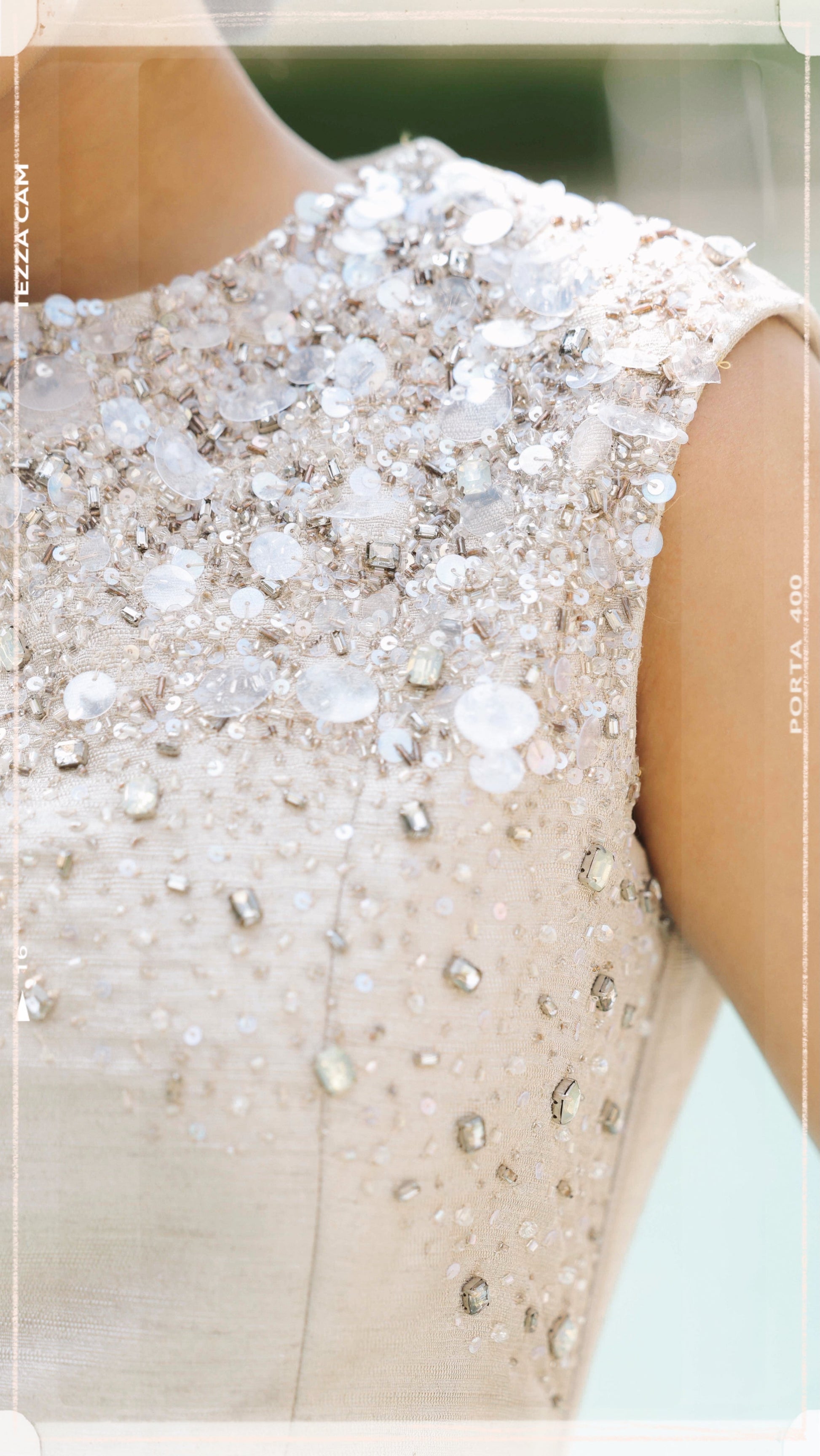 The neckline is adorned with delicate hand-embellished floral detailing, adding just the right touch of sparkle and grace. The dress features a clean, contoured seam design, enhancing its structured yet feminine form.