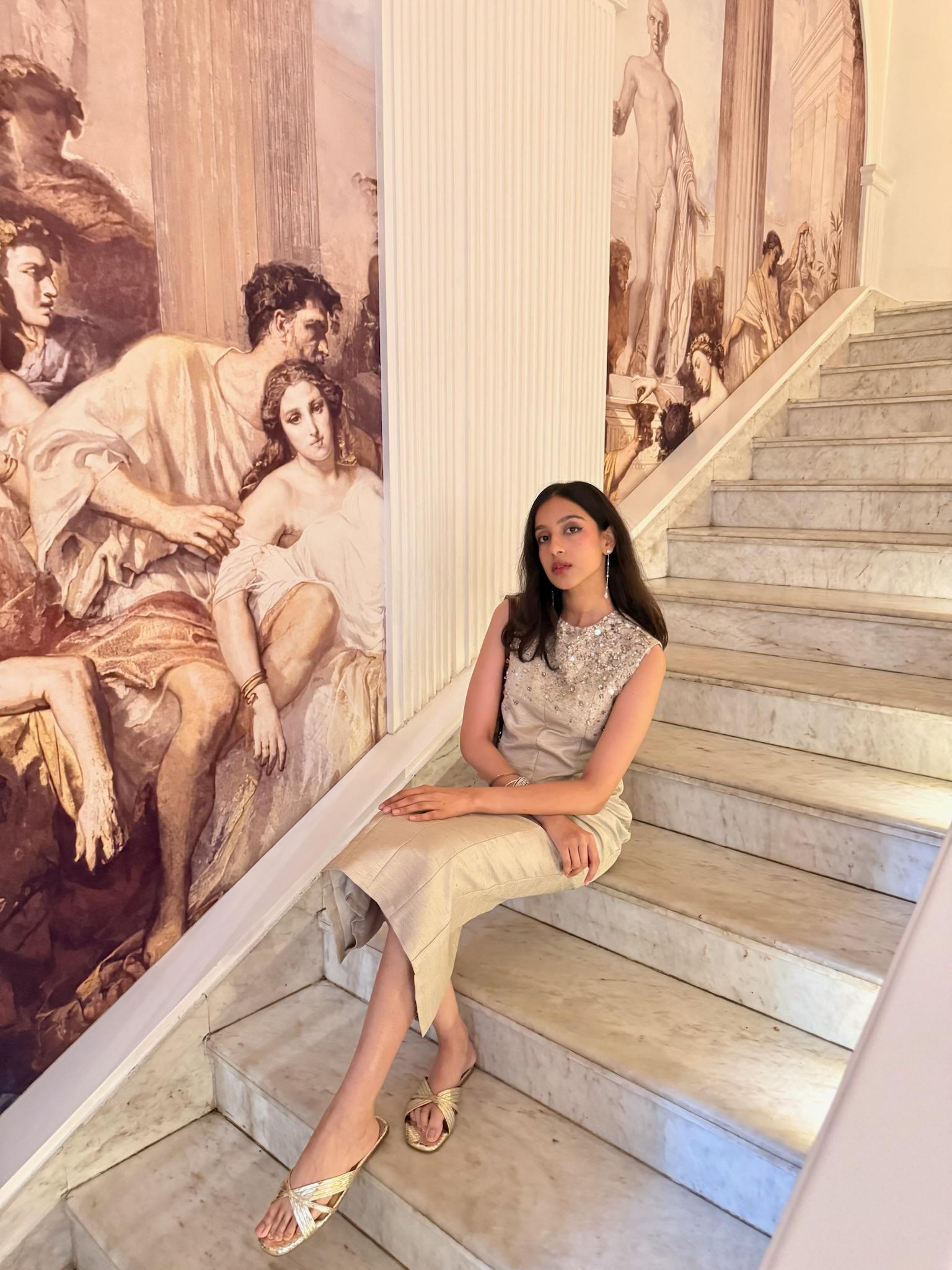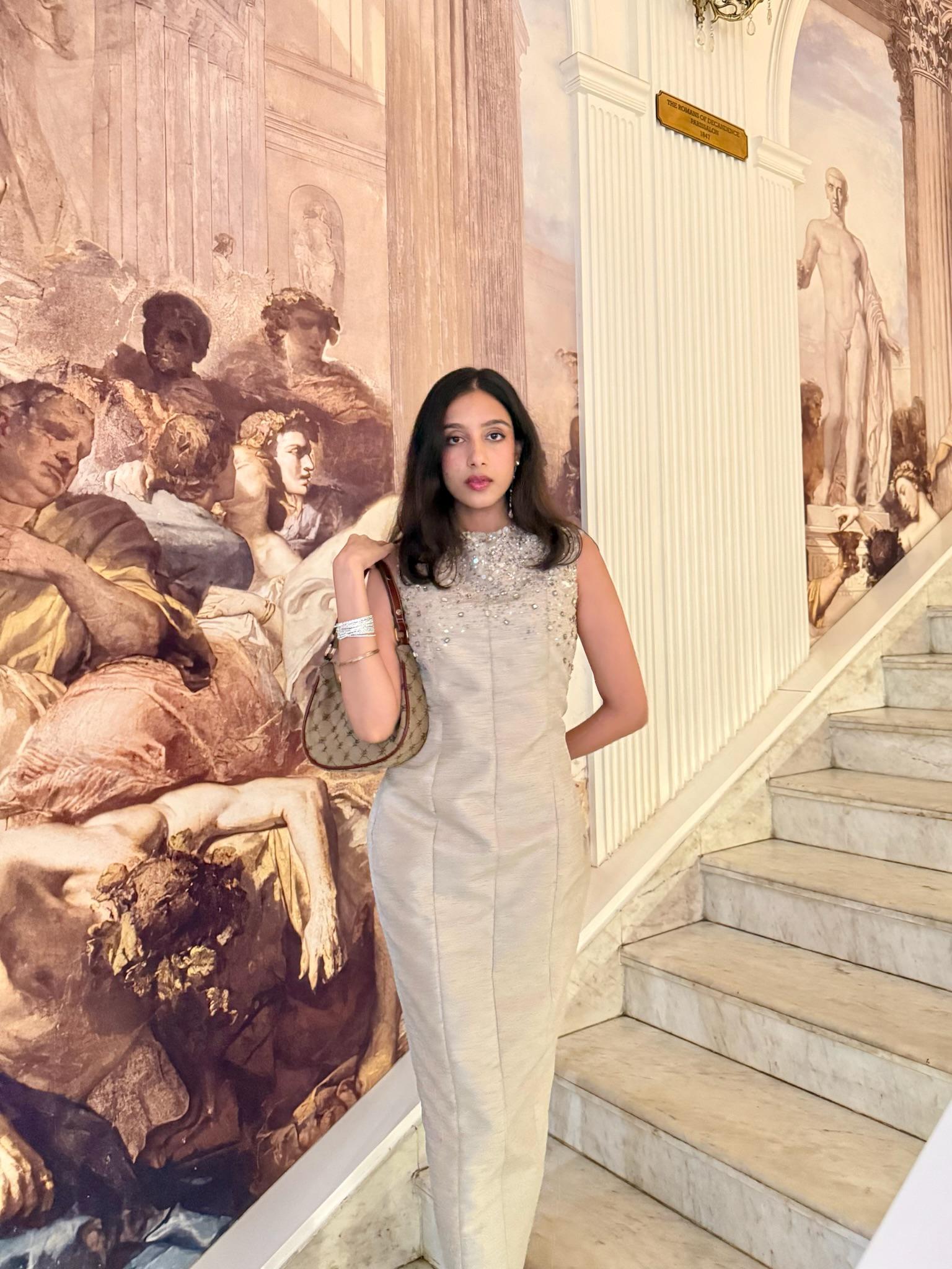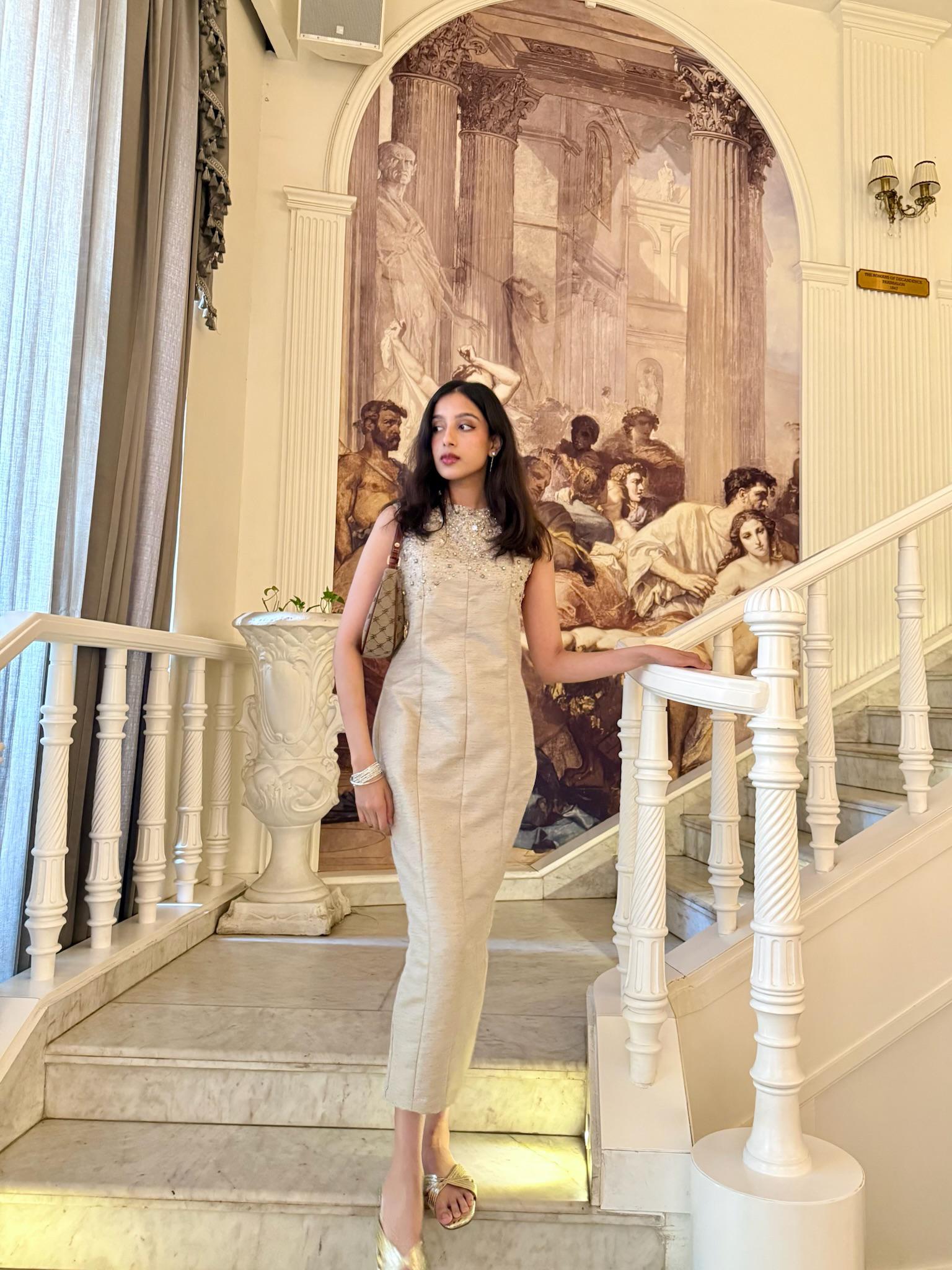 Functional details include a concealed back zip closure for a seamless finish and a back slit for ease of movement. Whether worn to a gallery event or a refined soirée, this dress exudes timeless charm with modern poise.
