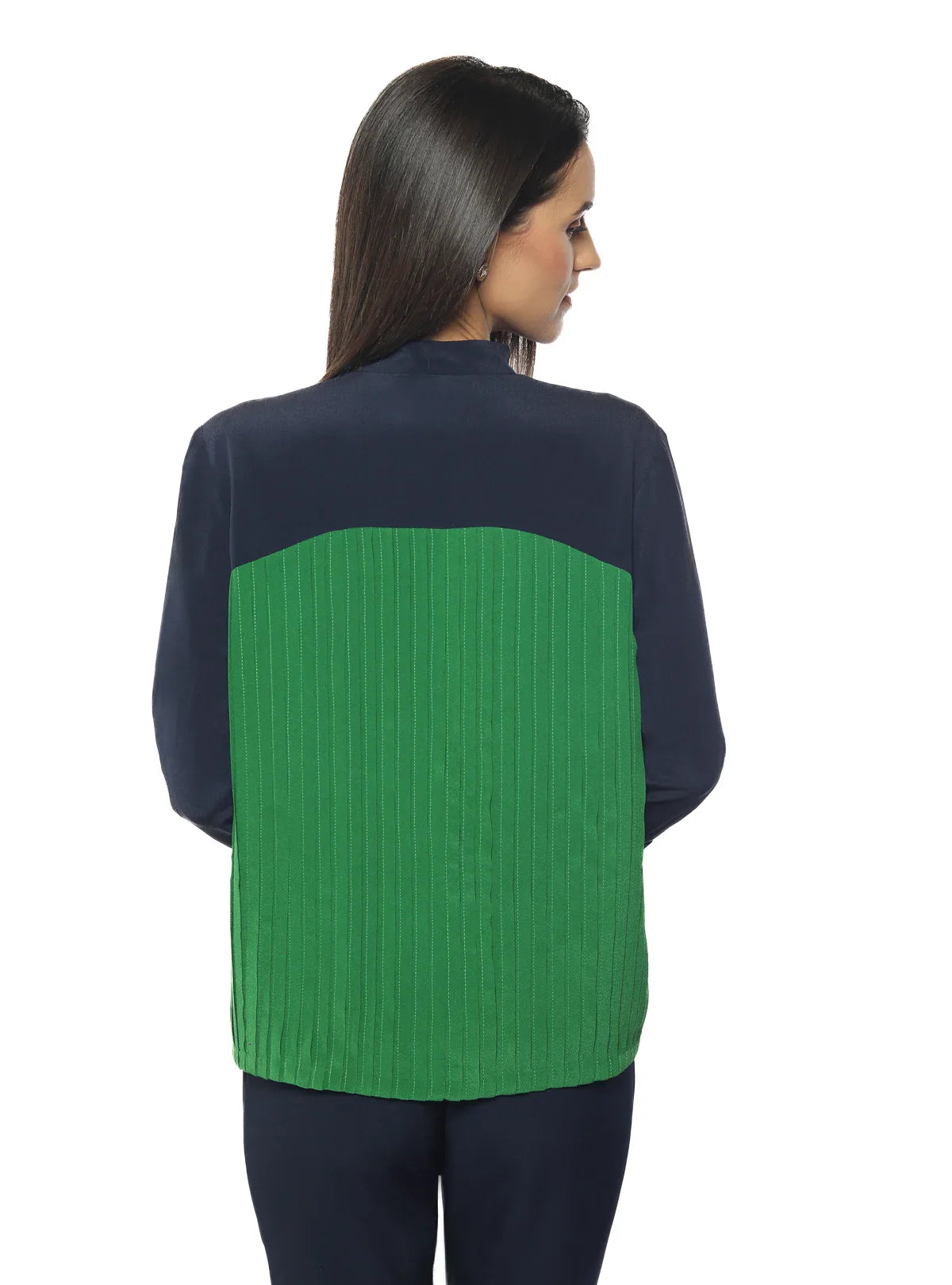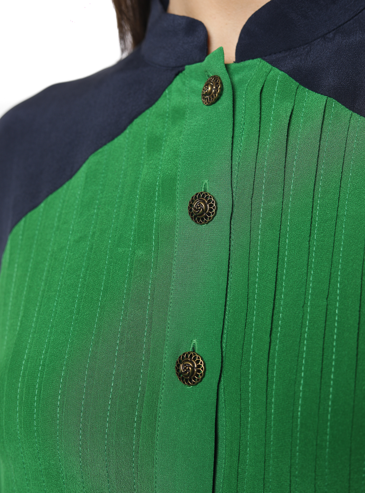 Featuring a vibrant green front panel with blind tucks detailing, it contrasts beautifully with the solid navy blue shoulders and sleeves. The mandarin collar adds a touch of sophistication, while the full button-down design ensures versatility and comfort. With 3/4-length sleeves and premium fabric construction, this shirt is perfect for casual outings, workwear, or semi-formal occasions.