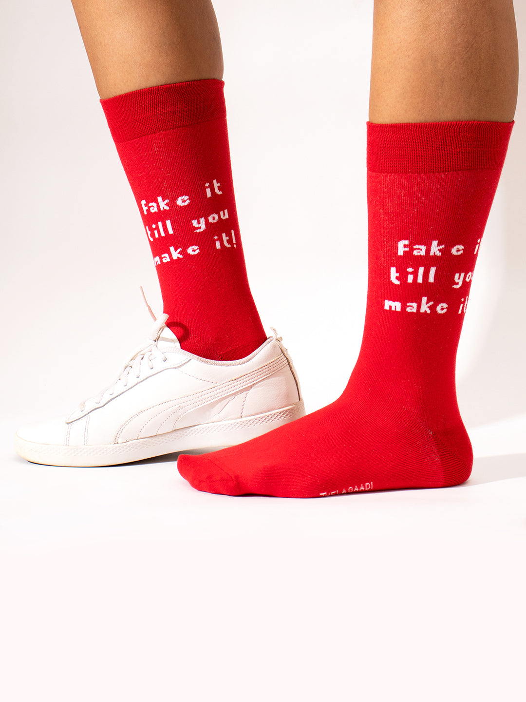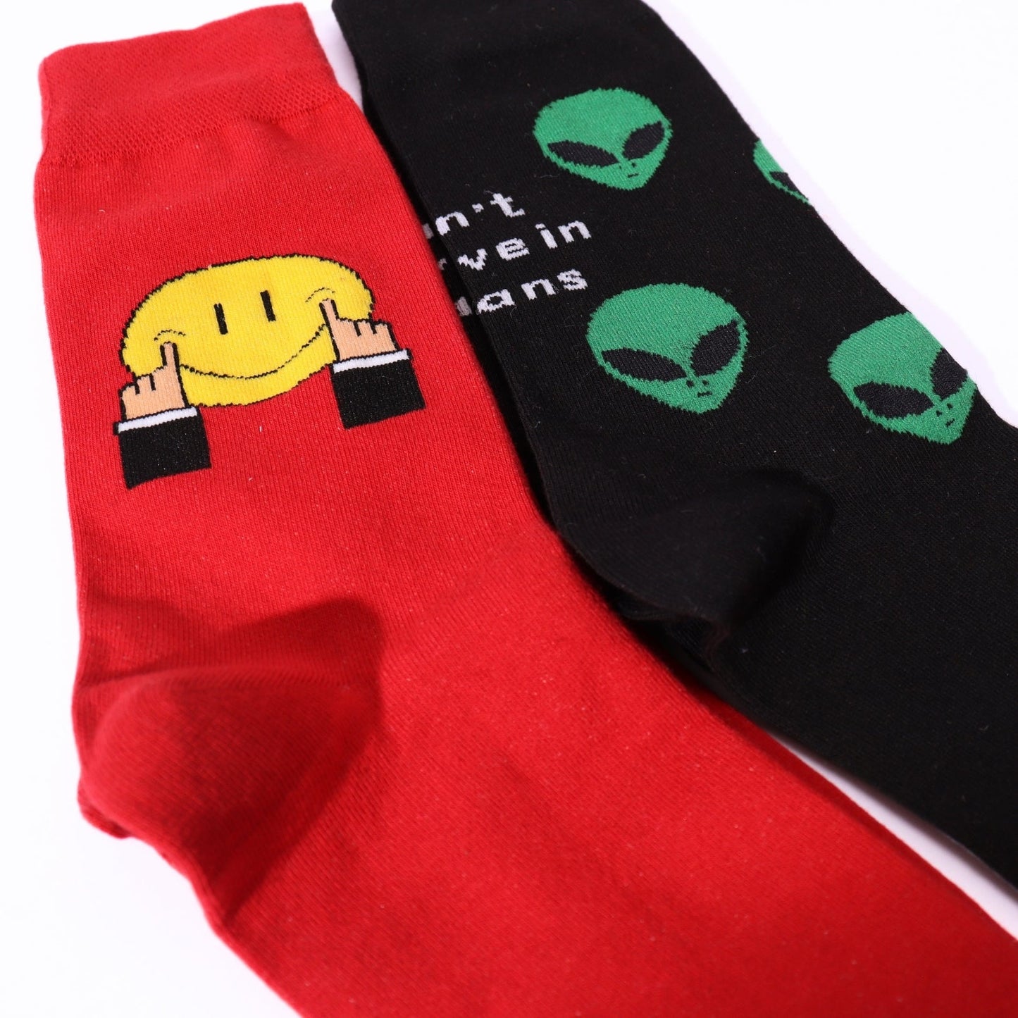 Step up your sock game with our unisex Fake It & Alien Socks. Made of comfortable cotton, these crew socks feature a quirky design - one with the motivational quote 'Fake it till you make it' and the other with adorable alien faces. One size fits all, so you can rock these socks with any outfit. No need to be serious - just embrace your inner weirdness!