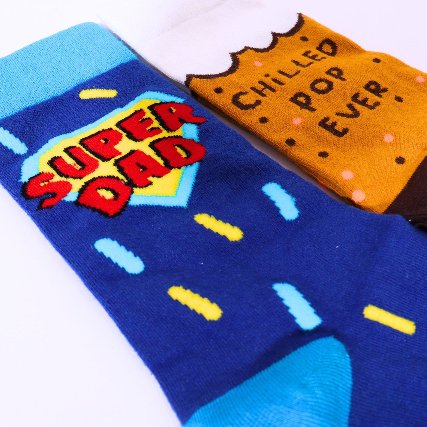 Surprise your dad with our Father's Day Quirky Socks Gift Box! These crew length socks are made from pure cotton and come in two quirky designs. One features "Super Dad" on a blue base, while the other has a fun drink-inspired design with "Chilled Pop Ever" written on it. Perfect for the dad who doesn't take himself too seriously!