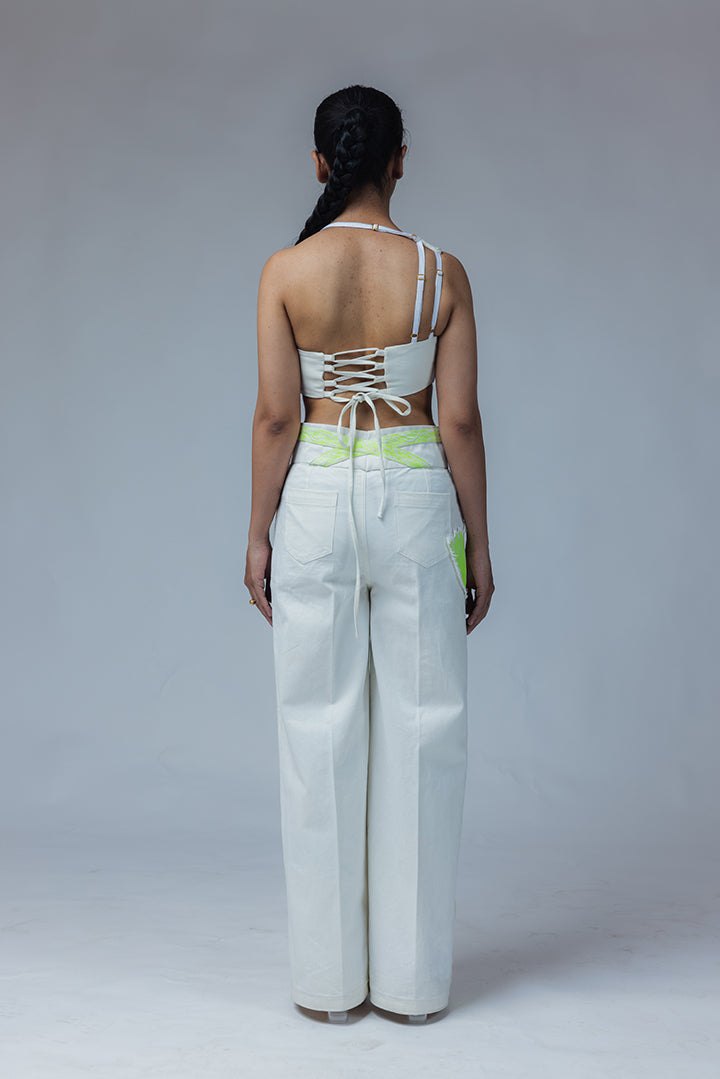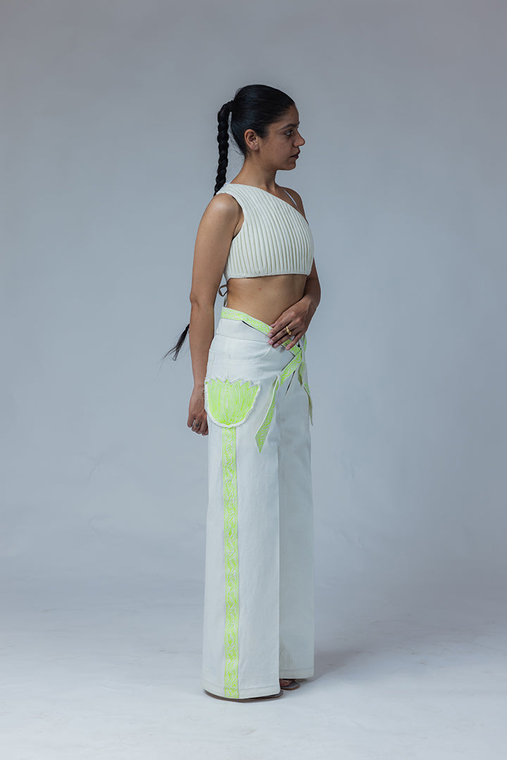 This wide leg jeans is cut from off-white denim fabric. It has big lotus flower made using machine embroidered and applique technique. At the waist it has belt attached (coming all the way from back making a cross pattern) with popping machine embroidery on it. the jeans consists of two front and two back pockets.