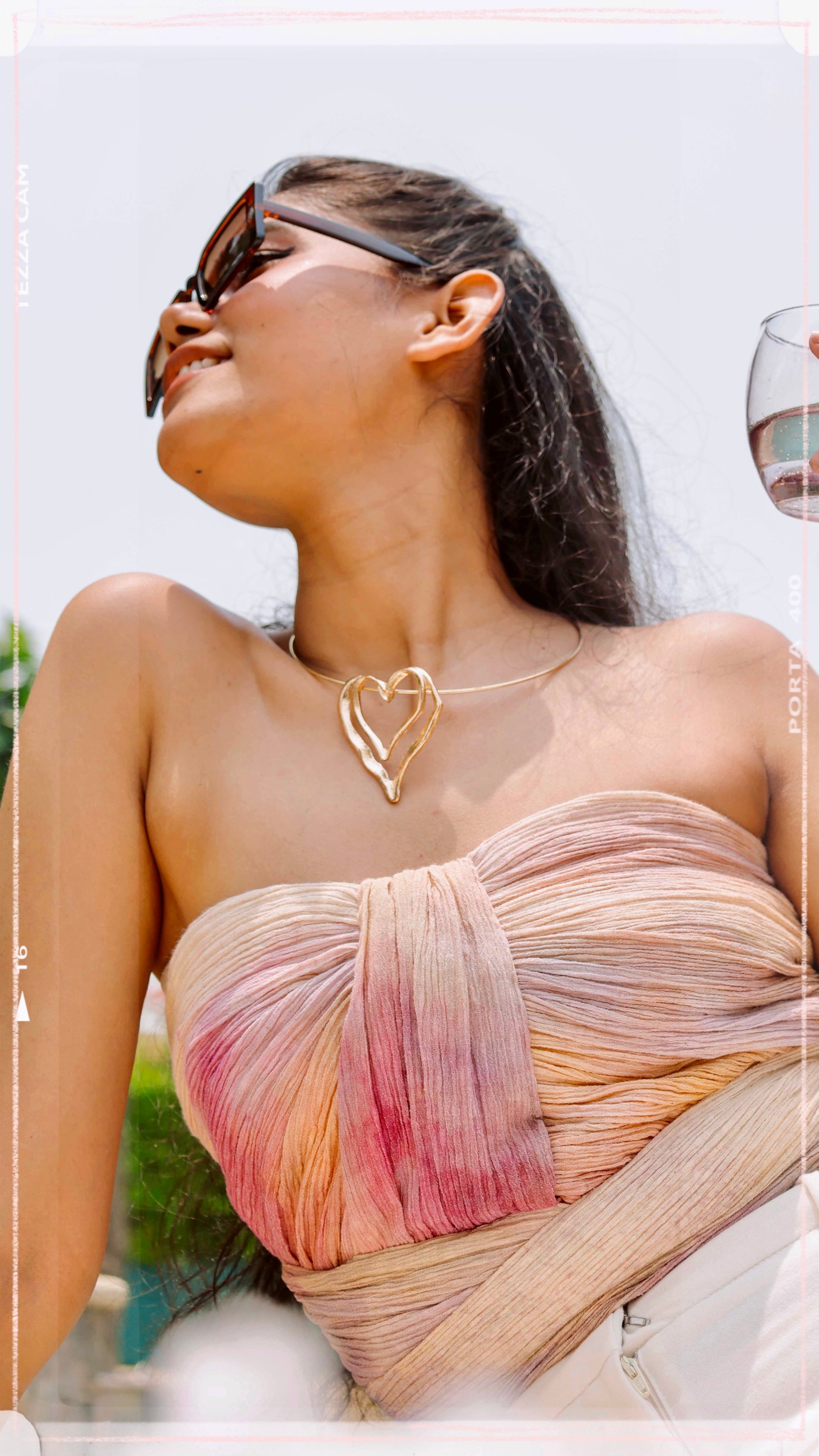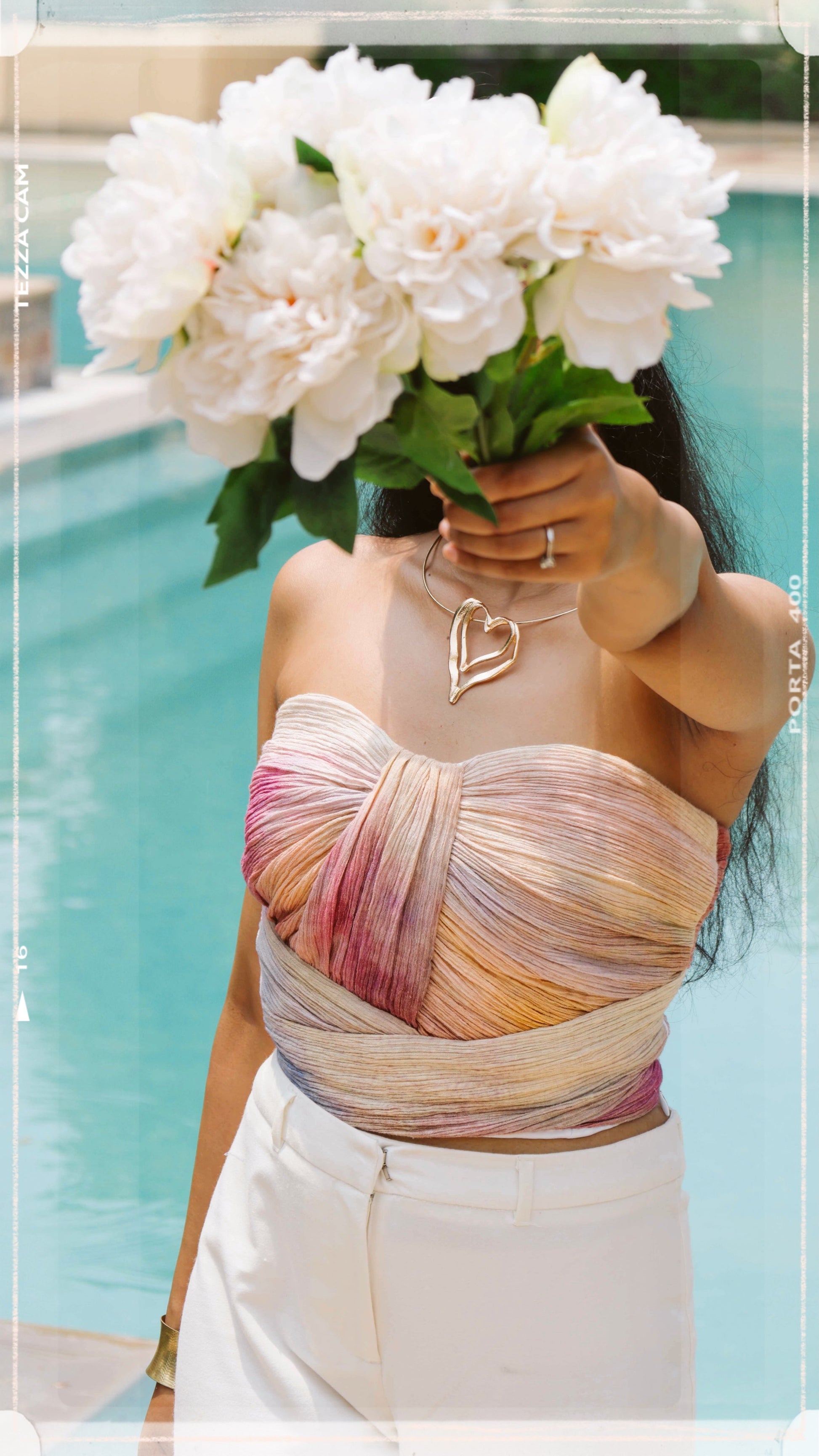 Draped in the hues of a summer sunset, Flora Bustier is a strapless, pleated bustier that blends soft structure with effortless romance. The fabric swirls around the torso in delicate waves of peach, rose, and amber — reminiscent of golden hour light caught in motion. Artfully ruched to flatter the silhouette and styled with a sculptural heart pendant, it evokes a dreamy, modern femininity.