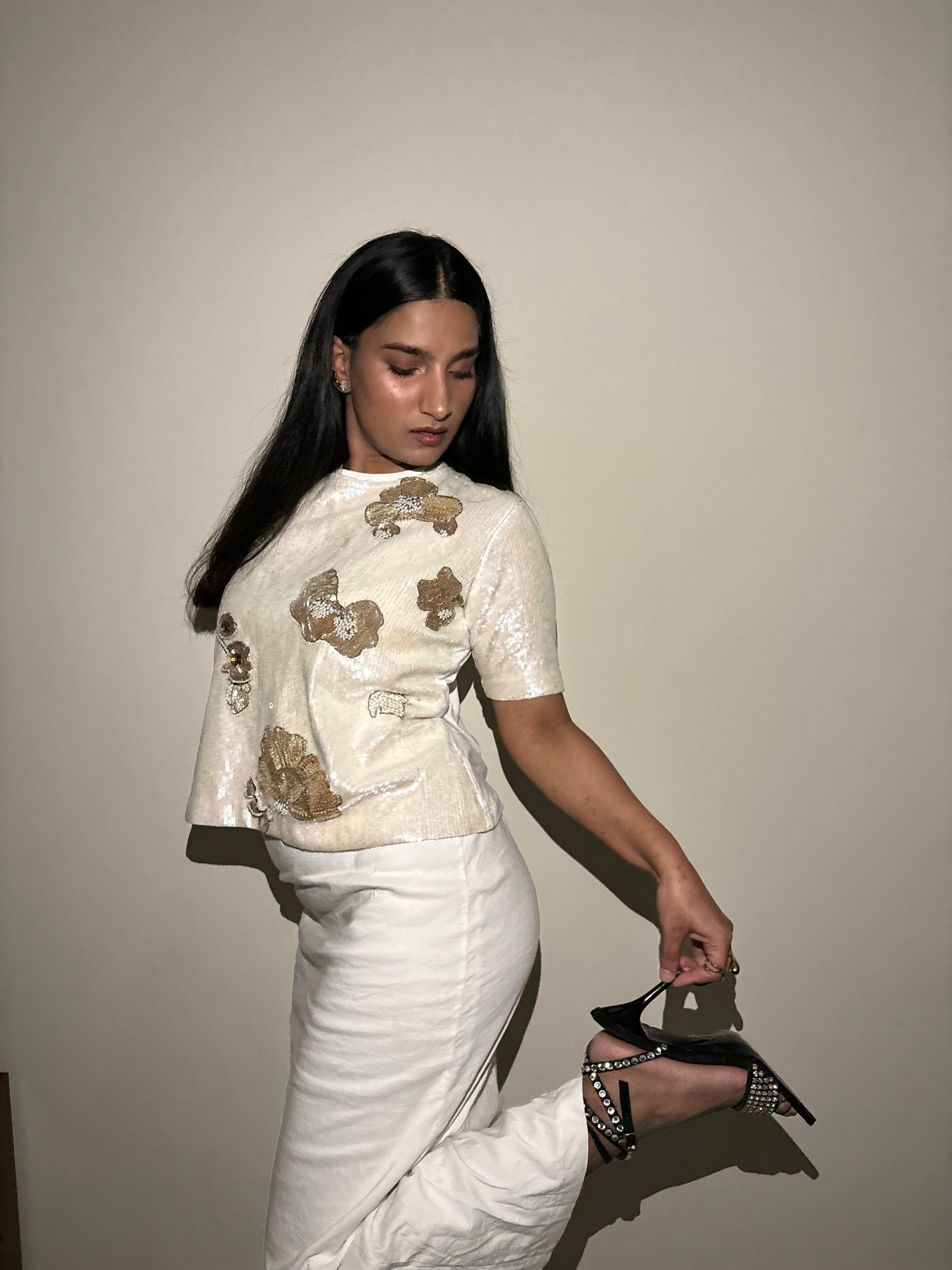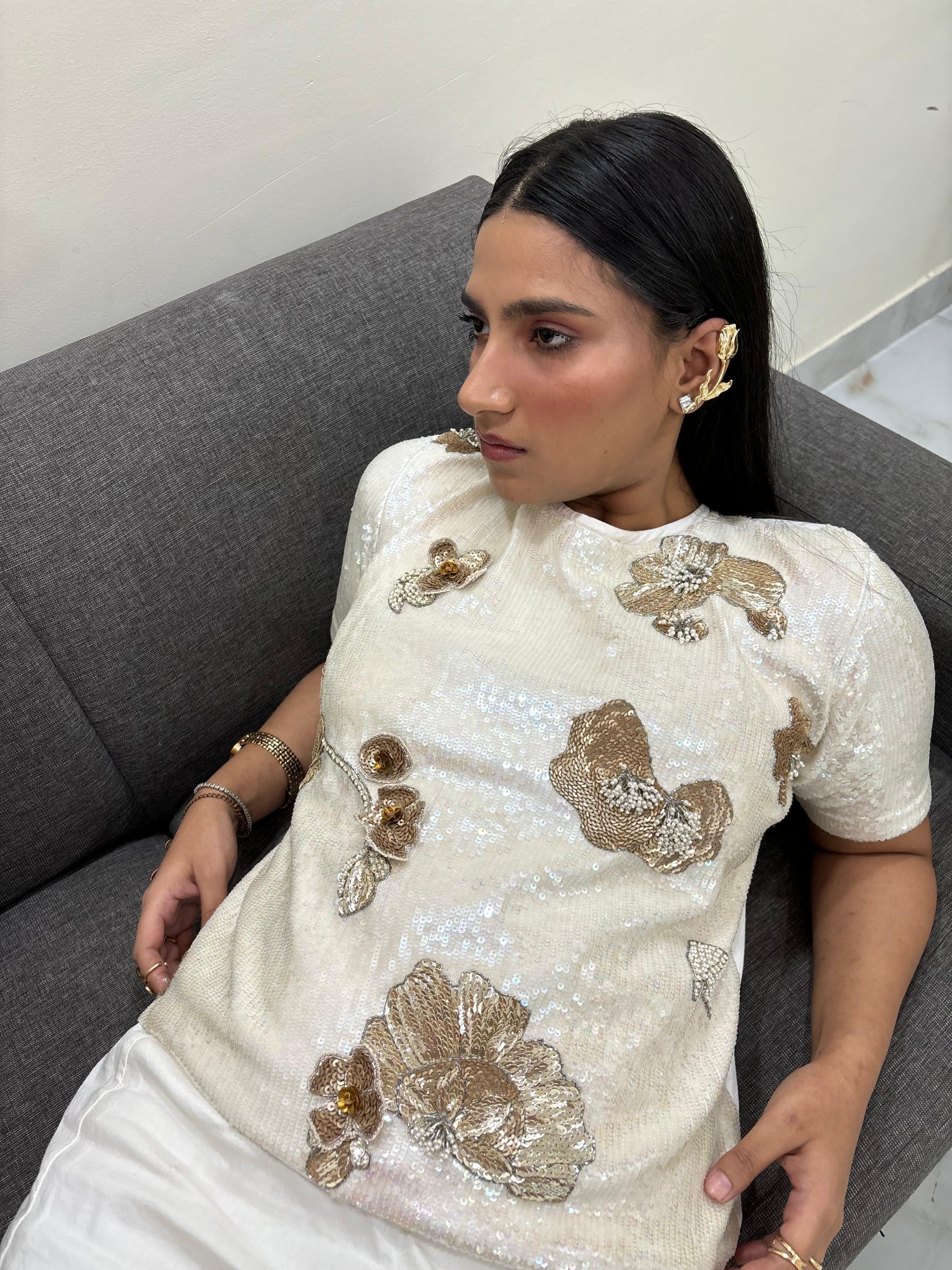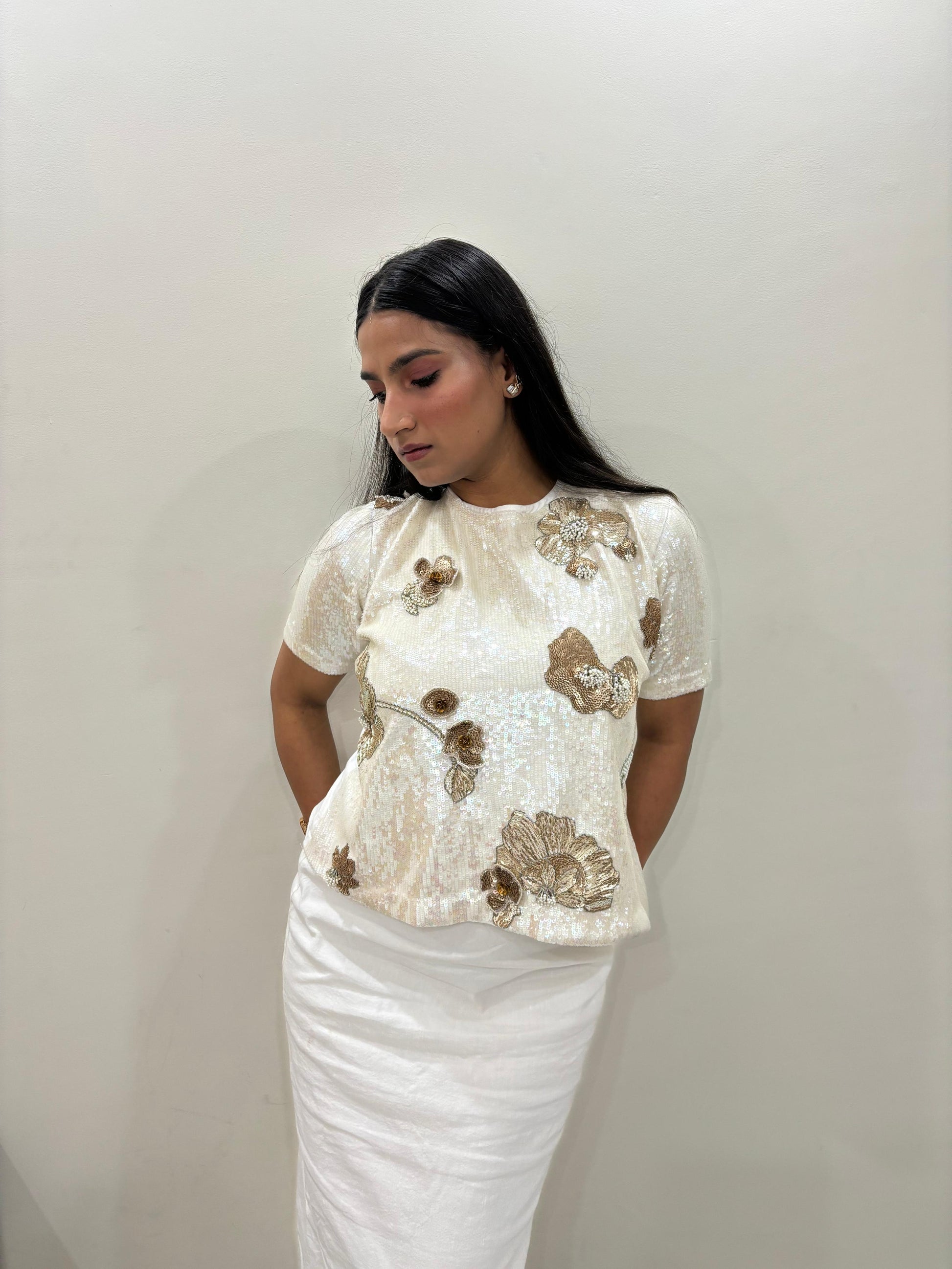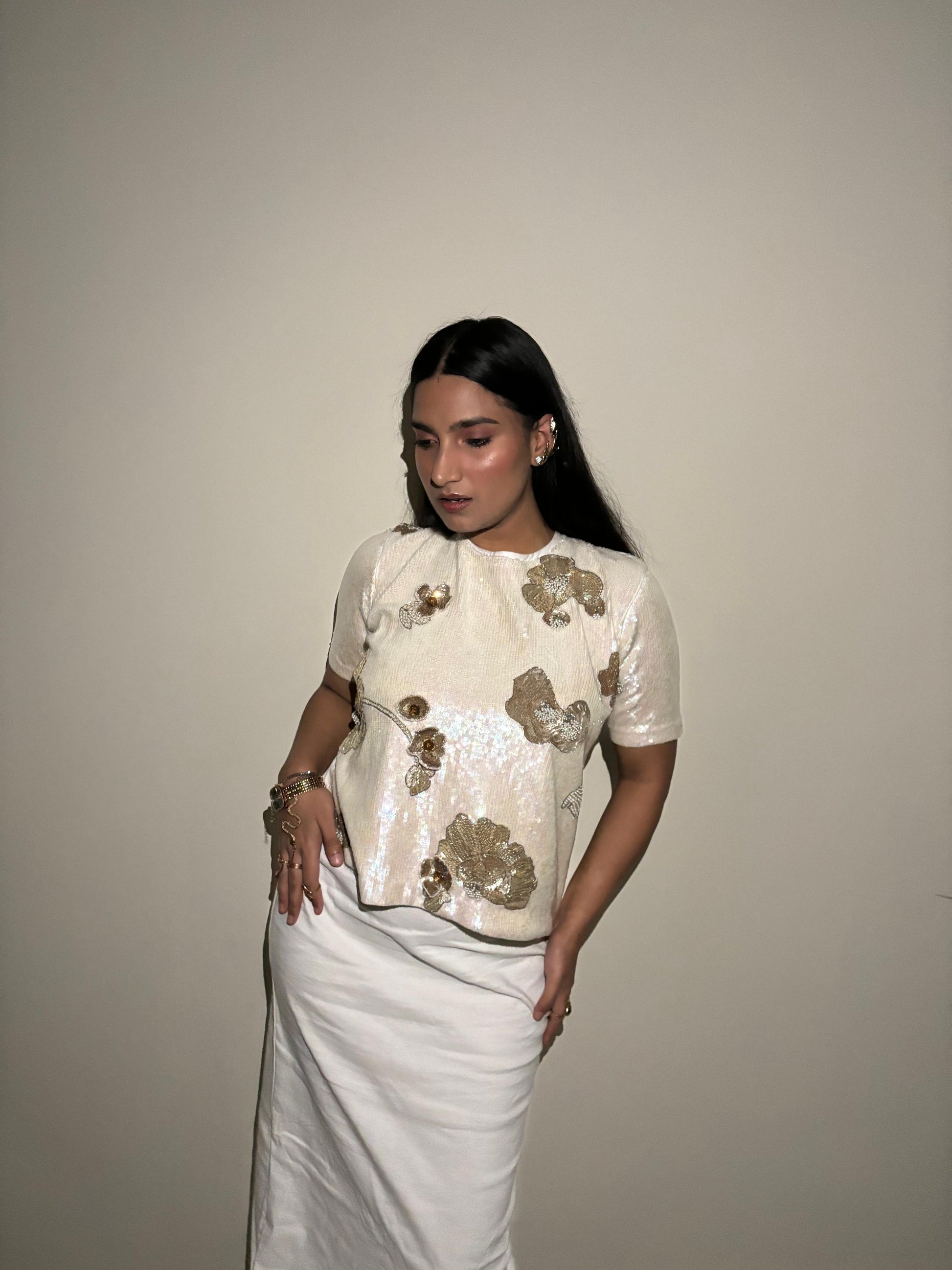 A canvas of subtle shimmer, this hand-embroidered t-shirt is adorned with glistening florals in metallic threadwork and sequins. Cut in a relaxed silhouette, it brings together the ease of a tee with the elegance of artisanal detailing. Perfect for elevating your everyday or layering into a festive ensemble.