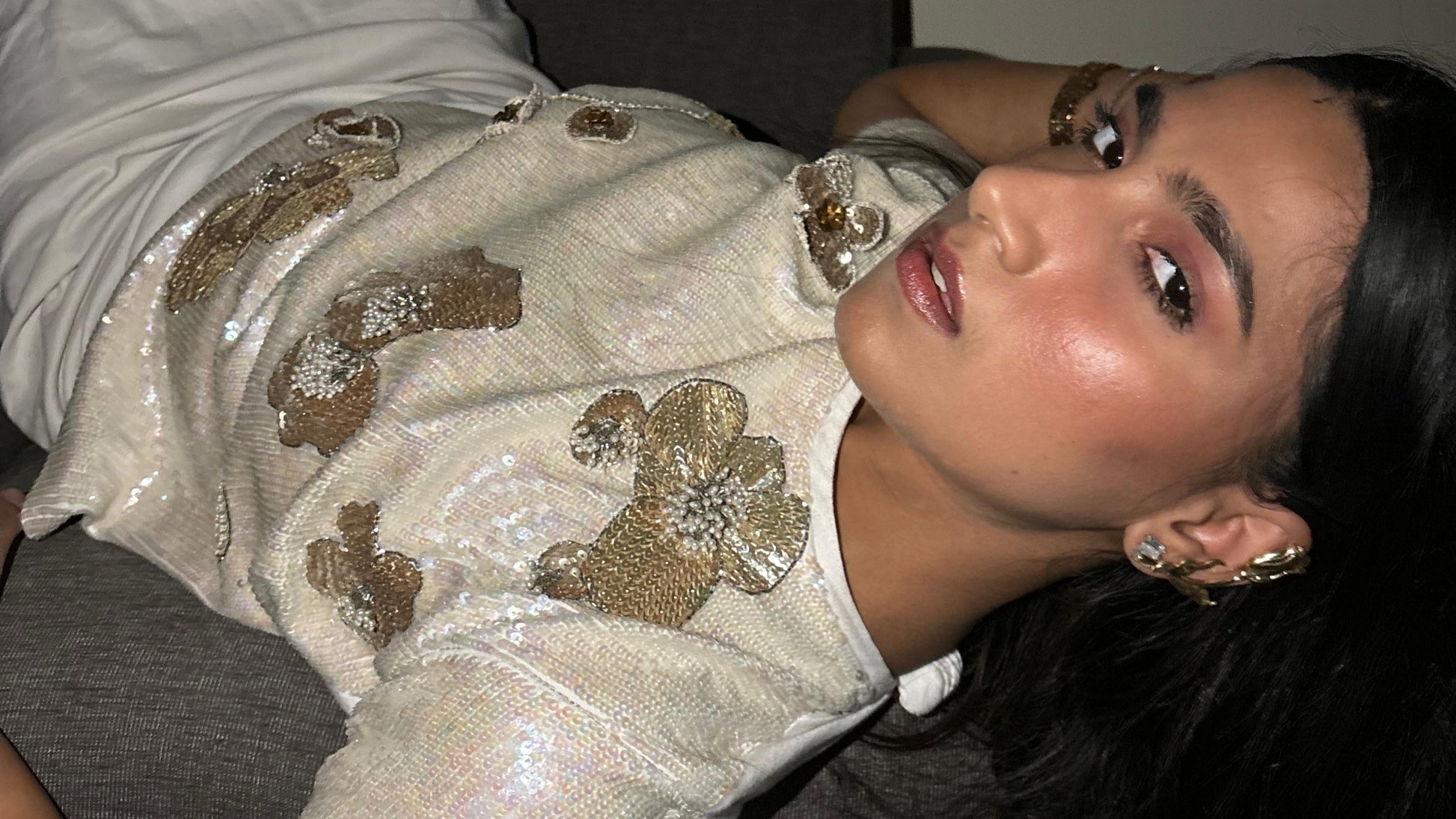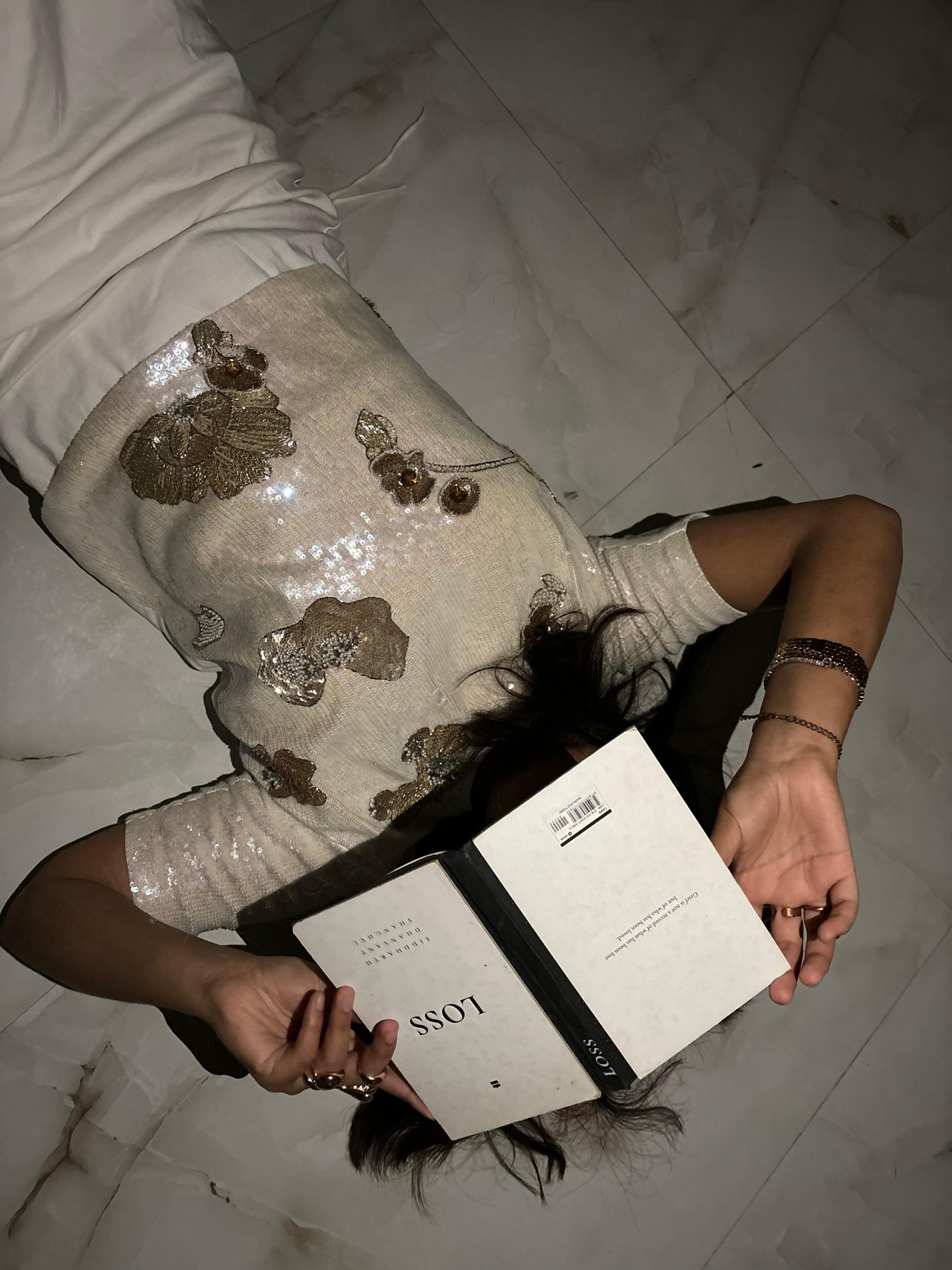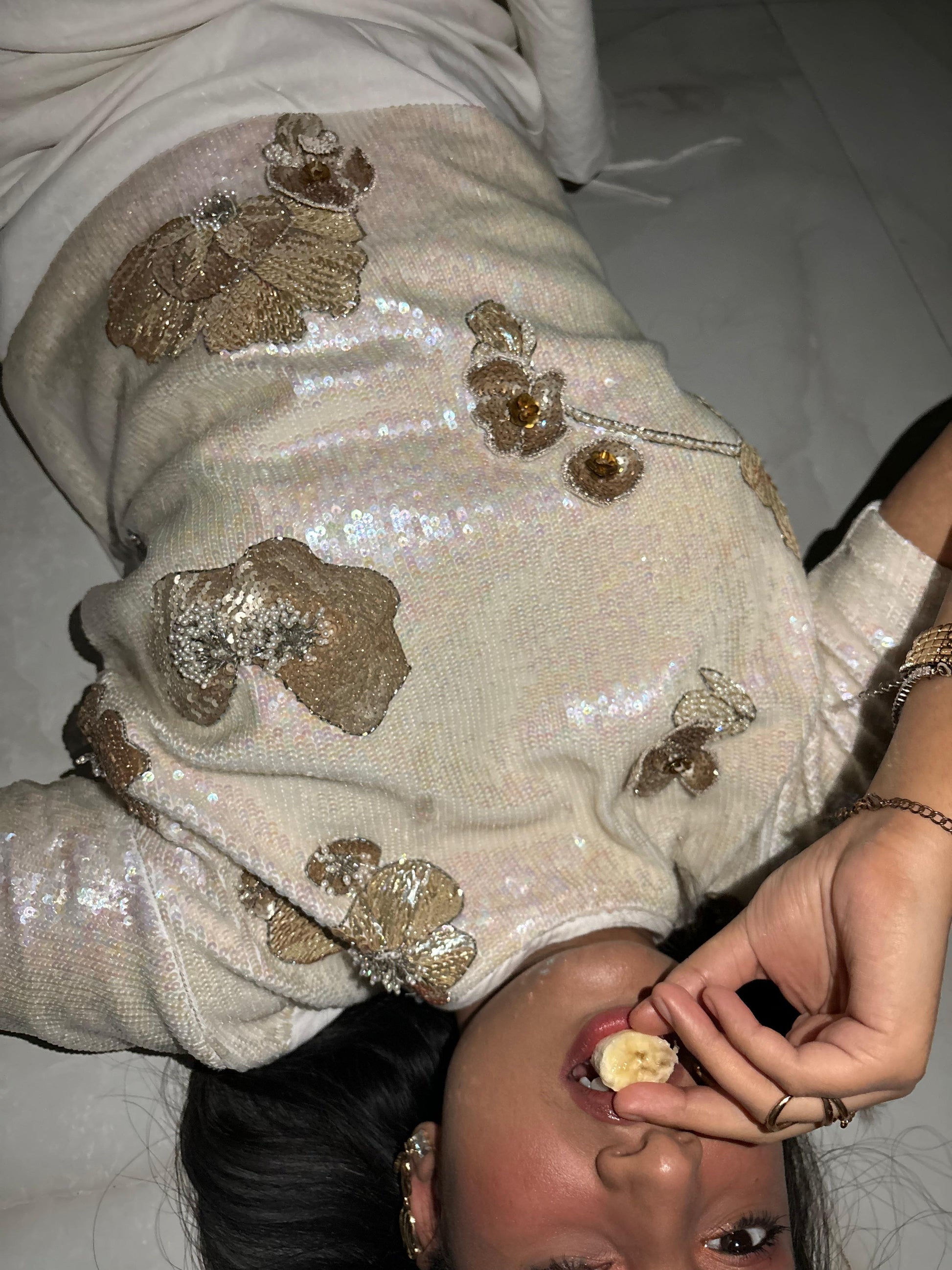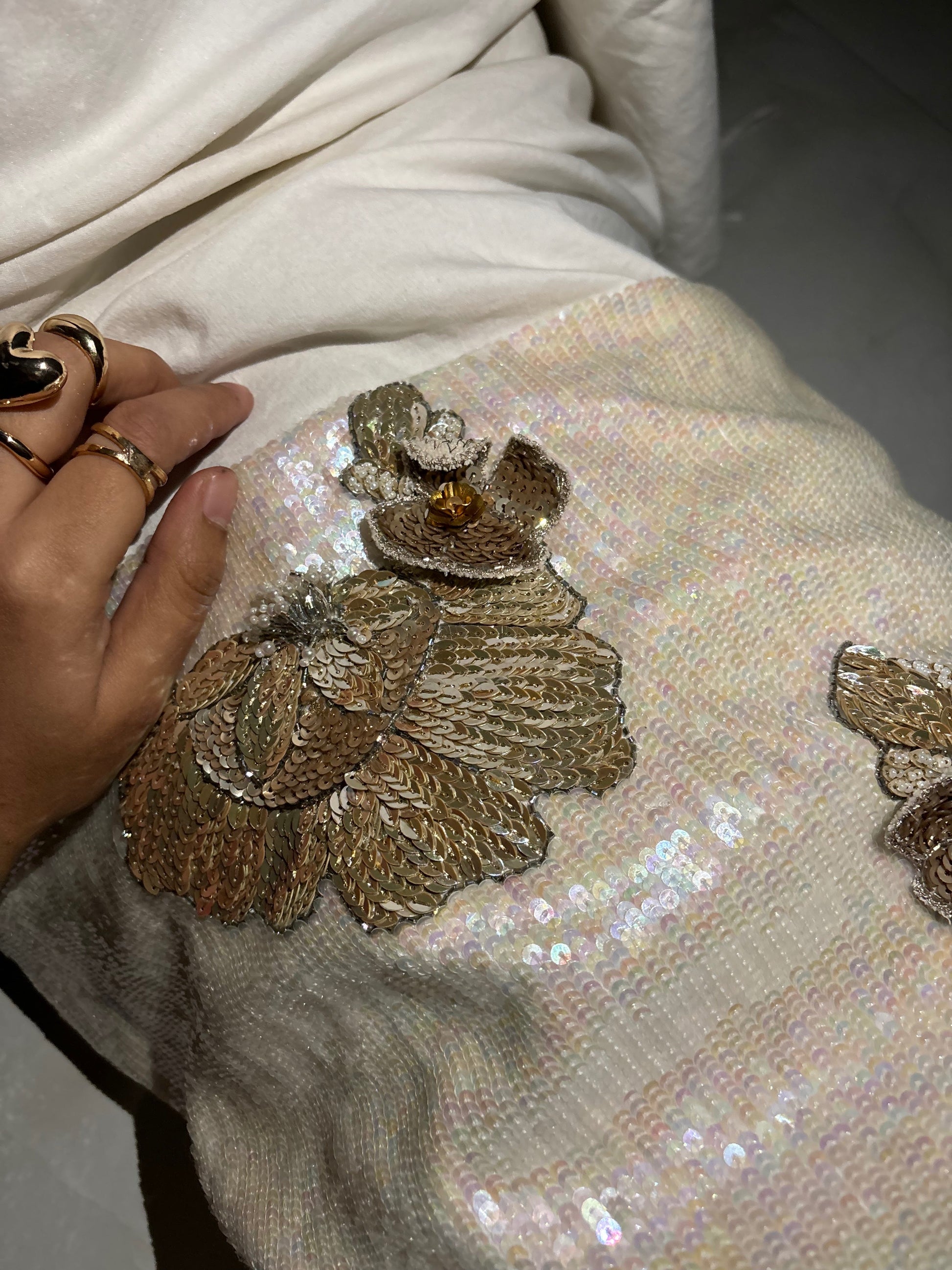 A canvas of subtle shimmer, this hand-embroidered t-shirt is adorned with glistening florals in metallic threadwork and sequins. Cut in a relaxed silhouette, it brings together the ease of a tee with the elegance of artisanal detailing. Perfect for elevating your everyday or layering into a festive ensemble.